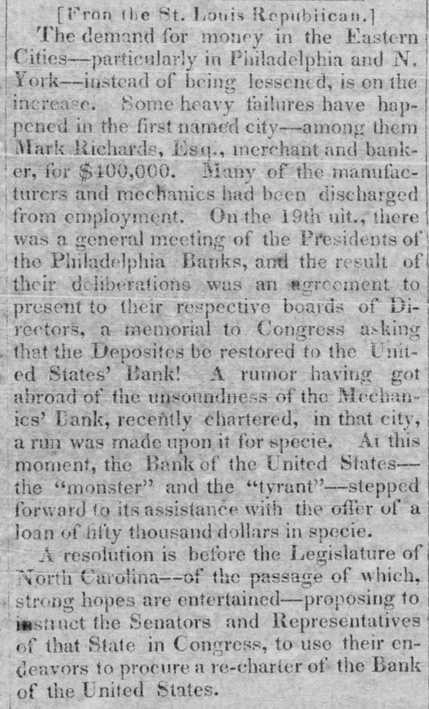 [Fron the St. Louis Republican. 1 The demand for money in the Eastern Cities-particularly in Philadelphia and N. York--instead of being lessened, is on the increase. Some heavy failures have happened in the first named city--among them Mark Richards, Esq., merchant and banker, for $400,000. Many of the manufacturers and mechanics had been discharged from employment. On the 19th uit., there was a general meeting of the Presidents of the Philadelphia Banks, and the result of their deliberations was an agreement to present to their respective boards of Directors, a memorial to Congress asking that the Deposites be restored to the United States' Bank! A rumor having got abroad of the unsoundness of the Mechanics' Bank, recently chartered, in that city, a run was made upon it for specie. Ai this moment, the Bank of the United Statesthe "monster" and the "tyrant"--stepped forward to its assistance with the offer of a loan of bity thousand dollars in specie. A resolution is before the Legislature of North Carolina--of the passage of which, strong hopes are entertained-proposing to instruct the Senators and Representatives of that State in Congress, to use their endeavors to procure a re-charter of the Bank of the United States.