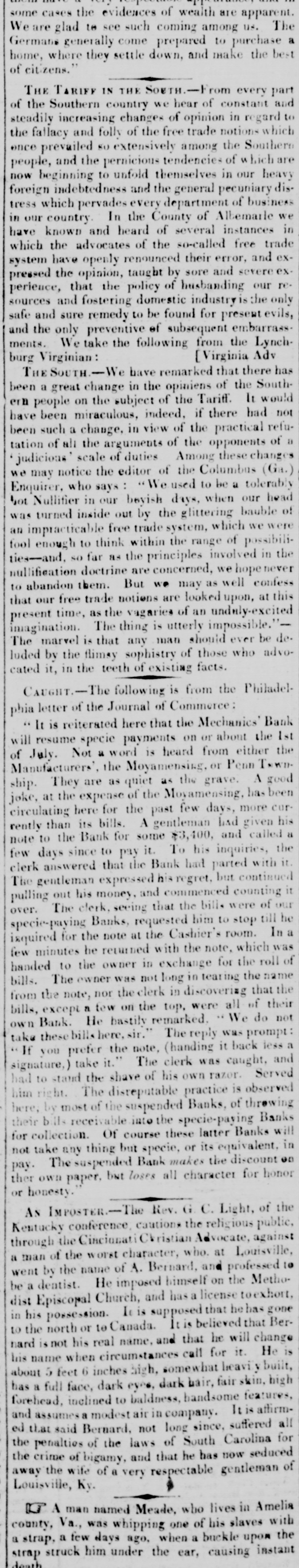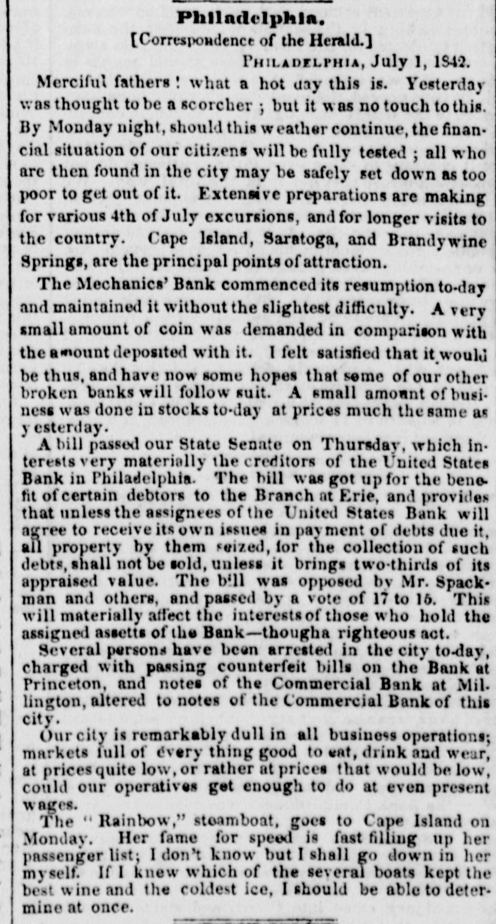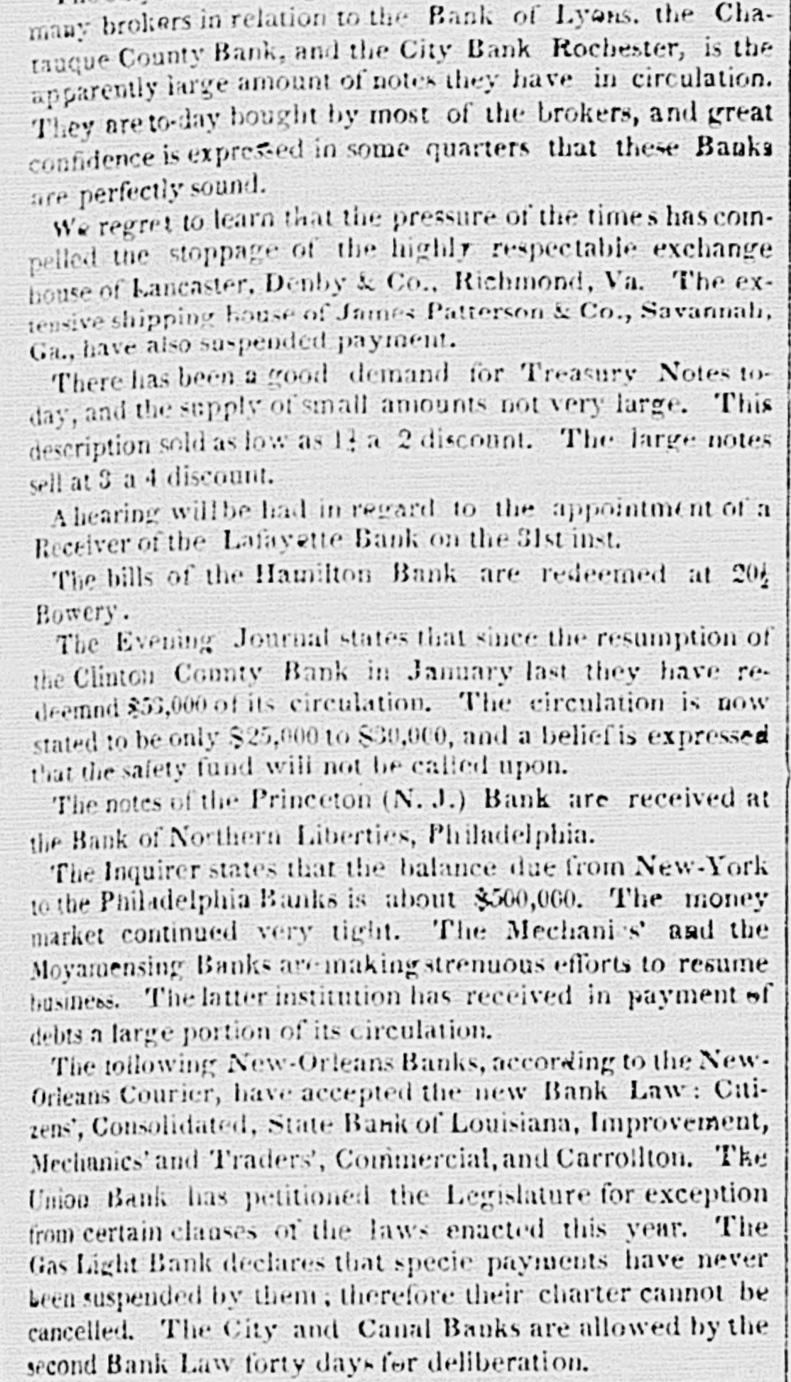 Highly Important from Philadelphia-Progress of the Bank Revolution. We received yesterday afternoon highly important information, showing the progress of the bank revulsion, which has now decidedly set in upon Phila. delphia. A terrible state of excitement prevails in that city, which will no doubt soon prevail in Baltimore, Mobile, New Orleans, and every other" suspended city" in the land. These events are the natural results of the dishonesty of the financial clasees-their errors and their regueries. We annex such extracts as are important, referring our readers to the posiscript in thisday's paper, for the events that took place in Philadelphia yesterday. the Philadelphia Chrouicle of yesterday [From PANNSYLVANIA BANK.- On Saturday last RUN ON THE holders of the Bank of Pennsylvania kept up comthe note a run upon that institution, which was time of closing the doors, without severalflood. e cause was until menced from the perfect stated-of the that abatingin the Banks least as a has been erroneously The not all, to receive the notes of the Liberties, in this step were the refusing movers Northern, Pennsylvania. The Farmers'and first and the Commercial. the Moyamenwing and the Penn the notes of the Pennsy Ivania received Mechanics', the Mechanics', Bank Township through Pennout the day. of closing the doors, we were at the had At the time Bank, where great crowd of persons all left con- by sylvania both in and about the building, but AH inside gregated until the place was a perfect notes at the time of closing, had the run the in quiet. The Bank degrees. building departed blank. stood their changed and and we believe were it not that to loan morrow should is nebly, the interest on the State unon institution would contiaue to is day which redeem, but, consid- the be fortunately, paid. the under present circumstances, of the it notes, and the ered Pennsylvania advisable not to Bank redeem will, any doubtless, more remain closed we obtained last holding notes on of the caution to-day. This information the public evening, the Pennsylvania affairs and would not to make a hasty sacrifice, as the present a favorable interest on the State debt which will not institution Bank, condition. becomes Bank, due and The to-morrow at the Pennsylvania for a few payable will be allowed to go by default deferring be paid. It then paid. One of the reasons for specie-12 days, and is the very heavy premium on or its this per cent-and payment the interest must be paid in specie equivalent. of all the banks was held on each Saturday others' A meeting at which it was decided to receive existed evening, etc. Had this determination would not have been for notes the on past deposite, week, the present state of affairs The Directors experienced. of the Pennsylvania but Bank the conclusion were to hold to a meeting last evening, assured, (Sunday) would not vary from that and be arrived at, above-the we are bank net to redeem its notes, for the mentioned the State loan to remain hundred unpaid thom. sand dollars. the present. interest This on interest amounts to eight [From the Philadelphia Times.] CAMDEN BANK.- NICE War OF the REDEEMING following NOTEB RUN ON As a THE matter of on history. the State we record Bank at Camden, of. on fact. There last. was A a dense run crowd gathered round of old their women, fiee Saturday in Church Alley, and whole and streams damaged speculators, rough looking pouring countrymen, into the banking all office, hazards. anxious So to were get observed rid of their "Camden that notes," so far at from one's having was the crowd inside, at the notes you time or opportunity to without exactly knowing at you dense were hustledout head look was fixed. Bank recived, which was end of his person your MECHNICS' BANK This notes of THE first Farmers' on Saturday AND last to throw refuse out to receive the them the on to Bank the of Pennsylvania, at the and same time she dollars. was indebted the deposite, latter although in the sum of ninety thousand From the Philad Iphia Chinis-Saturday Chromcle Explosions, was THE BANK EXCITEMENT- excitement in Philadelphia. financiers, were another day of of explosions, among the of conversation at the order of the day, and place, and among all classes in corner of and our citizens. Around the least doors, public and every and rumors meeting the theme and coninside pursuits of those Banks assembled, which enjoy urged by curiosity, fidence, the while others crowds commenced of pesons running fed them by different to redeem rumors, their notes. Panic and excitement every body expecting the Bank for that day was the consequence, but happily all were disappointed, busin as undoors to be closed at least as they continued to do o'clock. ully blind to the signs must be wil the crisis of Bank forbeartilthree who They do not see that The most indulgent financiering of and them, the times, and is fast coming upon us. have lost all confidence procrastination in and ing of our citizens to be convinced that instead of better. Their of delay only makes them is past toleration; the has been conare beginning high-handed rule within the worse last few days the conduct strongest several of them well calculated to excite and plundered temptible, and against them. An out insuited with palliations, deindignation community, jaded and are worn rising to the vindication Banks are of and subterfuges, The days of worthless gone forth, the lays, their violated rights. the people has recreant numbered, the fiat of wall, and wo to that hand writing is upon the the fatal revelation. Institution that does not perceive Enquirer.] city the Pniladelphia Banks of the AN IMPORTANT [From BANK MEKTING assembled by delegates on and 01. ganized by appointing and Saturday county evening of Philadelphia last at the Philadelphia Bank, J. REED, Esq. President. Ther were JOSH. JONES, in attendance, Secretary delegates from the follow. ing institutions The Philadelphia Bank. Bank. The Mechanics' do. Farmer