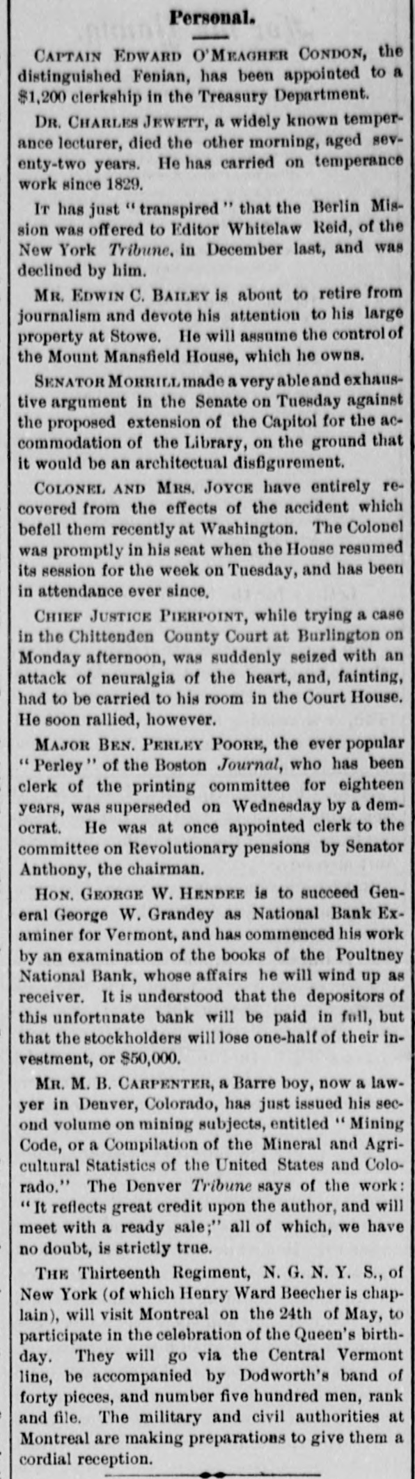 CABOT. Addison Laird, E. H. Clark and Charles T. Adams have each begun work on new barns. They are to be of large dimensions, built by experienced workmen, with all the modern improvements..... Mrs. A. H. Gerry has just returned from market with a large stock of millinery goods Ladies will have ne trouble in obtaining all the fine fixings they will want..... Mr. S. S. Batchelder started for California last Tuesday with his son, J. W. Batchelder, whose health is very poor By the advice of physicians, his father decided to take this journey with him, hoping by a change of climate he might regain his health. He has the best wishes of this community..... Benjamin Preston has sold his farm at East Cabot to Cassius M. Lamberton..... The promise meeting at the Methodist church Sabbath evening was a success and an excellent spirit was manifested. The social meetings have been well sustained since conference. The congregations during the day services are quite large.....J. M. Goodwin has hired S. S. Batchelder's farm for one year and has removed there..... W. Rives Putnam has commenced work on his new house, building it on the site of the old one, which he has moved off.....J. H. Da