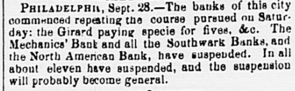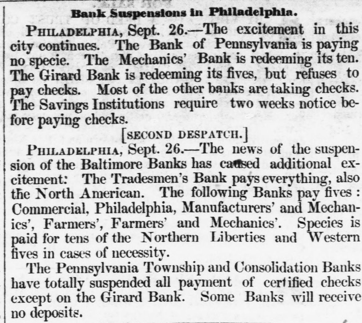 Panic stemming from wider financial crisis of September 1857 and news of suspensions in other cities (e.g., Baltimore) produced heavy withdrawals in Philadelphia.