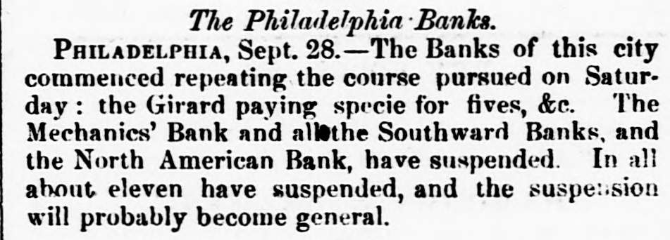 PHILADELPHIA, Sept. 28.-The banks of this city commenced repeating the course pursued on Saturday: the Girard paying specie for fives, &c. The Mechanics' Bank and all the Southwark Banks, and the North American Bank, have suspended. In all about eleven have suspended, and the suspension will probably become general.