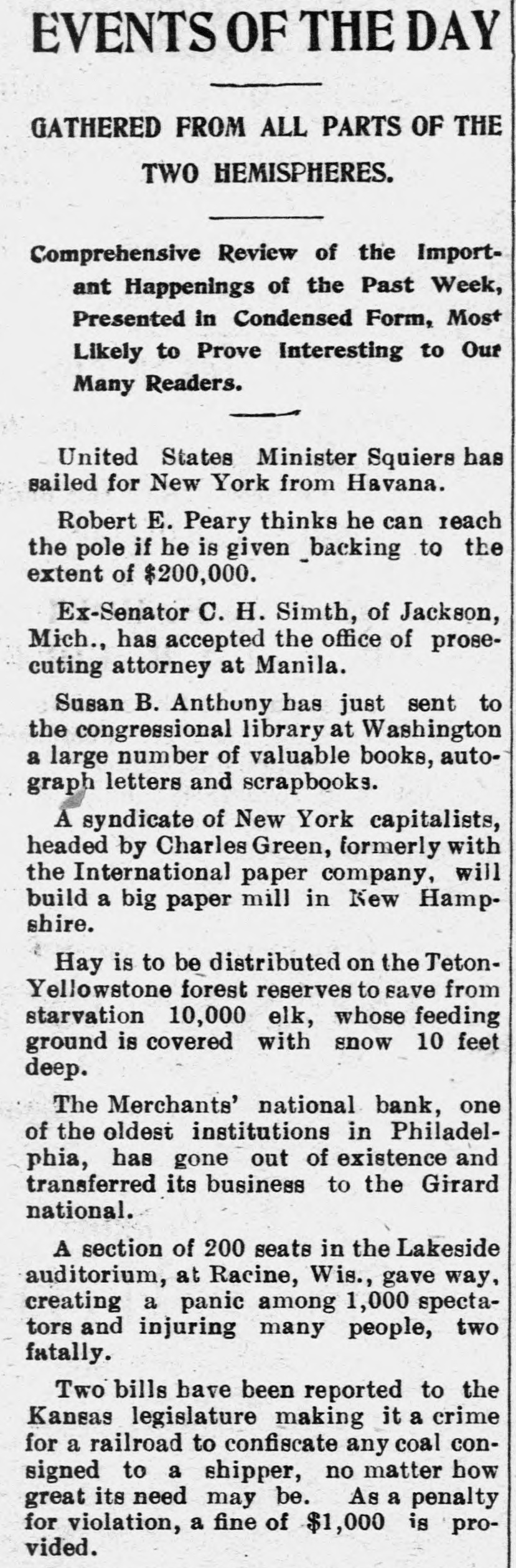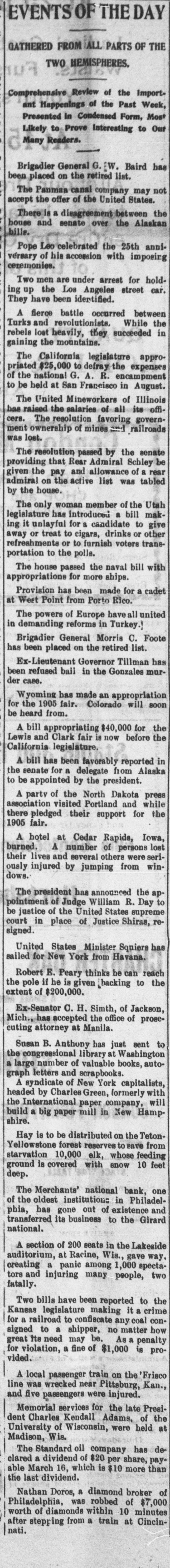 EVENTS OF FTHE DAY GATHERED FROM ALL PARTS OF T TWO HEMISPHERES. Comprehensive Review of the Import ant Happenings of the Past Week, Presented In Condensed Form, Most Likely to Prove Interesting to Out Many Readers. AT Brigadier General G. W. Baird has been placed on the retired list. The Panmaa canal company may not accept the offer of the United States. There i a disagreement between the house and senate over the Alaskan bille. Pope Leo celebrated the 25th anni versary of his accession with imposing ceremonies. Two men are under arrest for hold. ing up the Los Angeles street car. They have been identified. A fierce battle occurred between Turks and revolutionists. While the rebels lost heavily, they succeeded in gaining the mountains. The California legislature appropriated $25,000 to defray the expenses of the national G. A. R. encampment to be held at San Francisco in August. The United Mineworkers of Illinois has raised the salaries of all its officere. The resolution favoring government ownership of mines and railroads was lost. The resolution passed by the senate providing that Rear Admiral Schley be given the pay and allowance of rear admiral on the active list was tabled by the house. The only woman member of the Utah legislature has introduced a bill making it unlayful for a candidate to give away or treat to cigars, drinks or other refreshments or to furnish voters transportation to the polls. The house passed the naval bill with appropriations for more ships. Provision has been made for a cadet at Weet Point from Porto Rico. The powers of Europe have all united in demanding reforms in Turkey. Brigadier General Morris C. Foote has been placed on the retired list. Ex-Lieutenant Governor Tillman has been refused bail in the Gonzales murder case. Wyoming has made an appropriation for the 1905 fair. Colorado will soon be heard from. A bill appropriating $40,000 for the Lewis and Clark fair is now before the California legislature. A bill has been favorably reported in the senate for a delegate from Alaska to be appointed by the president. A party of the North Dakota press association visited Portland and while there pledged their support for the 1905 fair. A hotel at Cedar Rapids, Iowa, burned. A number of persons lost their lives and several others were seriously injured by jumping from windows. The president has announced the appointment of Judge William R. Day to be justice of the United States supreme court in place of Justice Shiras, resigned United States Minister Squiers has sailed for New York from Havana. Robert E. Peary thinks he can reach the pole if he is given hacking to the extent of $200,000. Ex-Senator C. H. Simth, of Jackson, Mich., has accepted the office of prosecuting attorney at Manila. Susan B. Anthony has just sent to the congressional library at Washington a large number of valuable books, autograph letters and scrapbooks. A syndicate of New York capitalists, headed by Charles Green, formerly with the International paper company, will build a big paper mill in New Hampshire. Hay is to be distributed on the TetonYellowstone forest reserves to save from starvation 10,000 elk, whose feeding ground is covered with snow 10 feet deep. The Merchants' national bank, one of the oldest institutions in Philadelphia, has gone out of existence and transferred its business to the Girard national. A section of 200 seats in the Lakeside auditorium, at Racine, Wis., gave way creating a panic among 1,000 spectators and injuring many people, two fatally. Two bills have been reported to the Kansas legislature making it crime for railroad to confiscate any coal consigned to a shipper, no matter how great Its need may be. As penalty for violation, a fine of $1,000 is provided. A local passenger train on the 'Frisco line was wrecked near Pittsburg, Kan., and five passengers were injured. Memorial services for the late President Charles Kendall Adams, of the University of Wisconsin, were held at Madison, Wis. The Standard oil company has de clared a dividend of $20 per share, payable March 16, which is $10 more than the last dividend. Nathan Doros, a diamond broker of Philadelphia, was robbed of $7,000 worth of diamonds within 10 minutes after stepping from a train at Cincinnati.