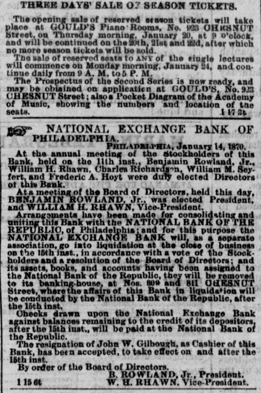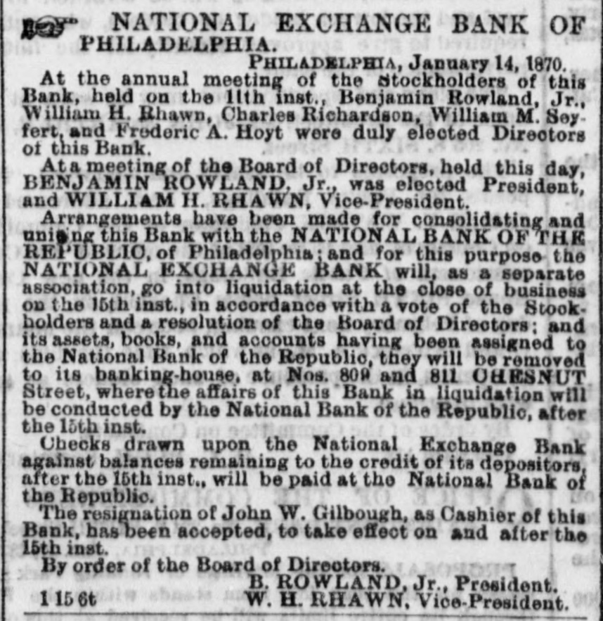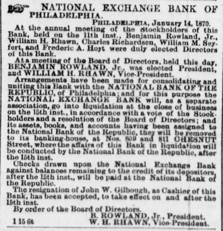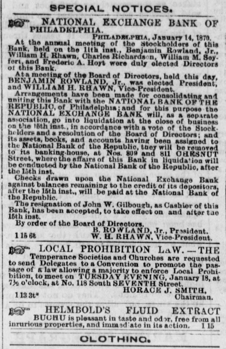 SPECIAL NOTIOES. NATIONAL EXCHANGE BANK OF PHILADELPHIA. PHILADELPHIA, January 14, 1870. At the annual meeting of the Stockholders of this Bank, held on the 11th inst., Benjamin Rowland, Jr., William H. Rhawn, Charles Richardson, William M. Seyfert, and Frederic A. Hoyt were duly elected Directors of this Bank. Ata meeting of the Board of Directors, held this day, BENJAMIN ROWLAND, Jr., was elected President, and WILLIAM H. RHAWN, Vice-President. Arrangements have been made for consolidating and uniting this Bank with the NATIONAL BANK OF THE REPUBLIC, of Philadelphia; and for this purpose the NATIONAL EXCHANGE BANK will, as a separate association. go into liquidation at the olose of business on the 15th inst., in accordance with a vote of the Stockholders and a resolution of the Board of Directors; and its assets, books, and accounts having been assigned to the National Bank of the Republic, they will be removed to its banking-house, at Nos. 809 and 811 OHESNUT Street, where the affairs of this Bank in liquidation will be conducted by the National Bank of the Republic, after the 15th inst. Checks drawn upon the National Exchange Bank against balances remaining to the credit of its depositors, after the 15th inst., will be paid at the National Bank of the Republic. The resignation of John W. Gilbough, as Cashier of this Bank, has been accepted, to take effect on and after the 15th inst. By order of the Board of Directors. B. ROWLAND, Jr., President. 1156t W. H. RHAWN. Vice-President. LOCAL PROHIBITION LAW. - THE DO Temperance Societies and Churches are requested to send Delegates to a Convention to promote the passage of a law allowing a majority to enforce Local Prohibition, to meet on TÜESDAY EVENING, January 18, at 7% o'clock, at No. 118 South SEVENTH Street. HORACE J. SMITH, 113 3t* Chairman. HELMBOLD'S FLUID EXTRACT BOY BUCHU is pleasant in taste and od or, free from all inrurious properties, and immed ate in its action. 1 15 OLOTHINO.