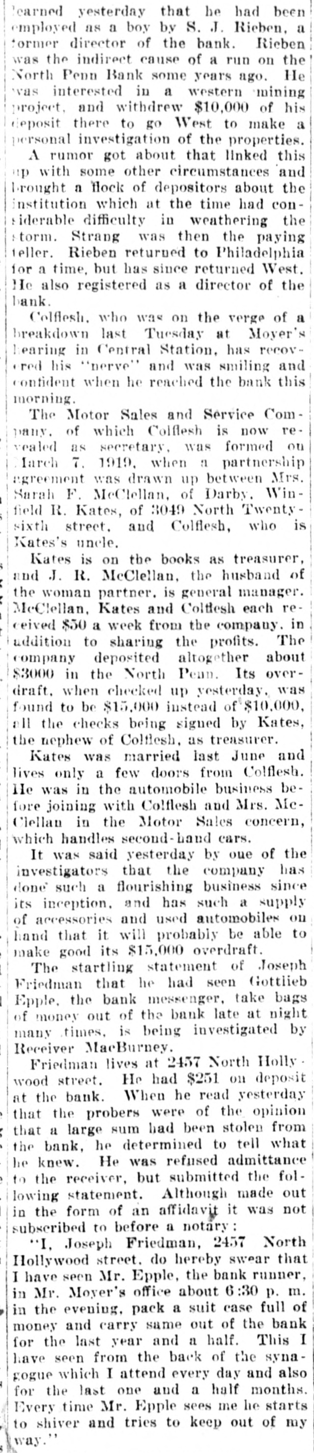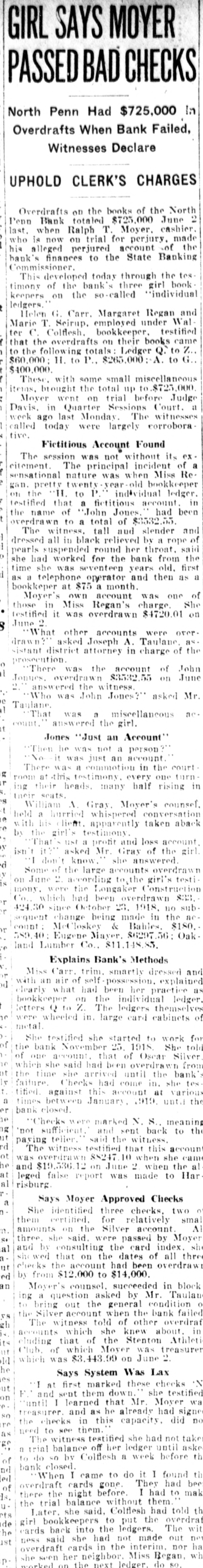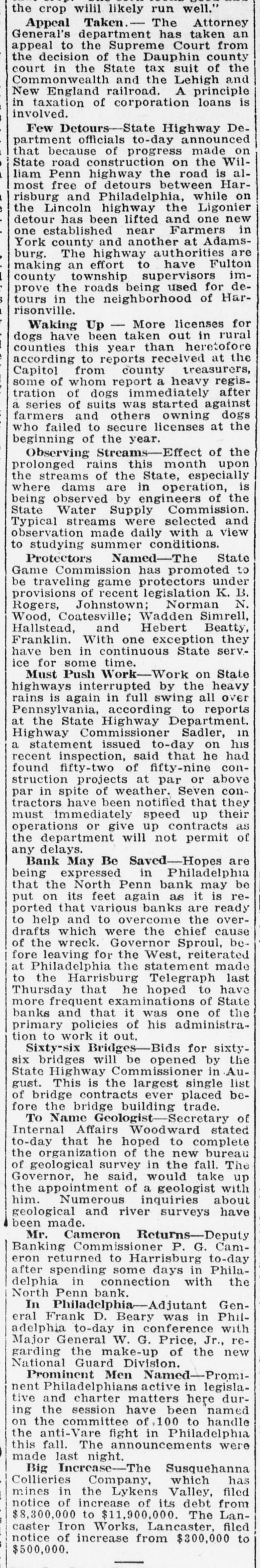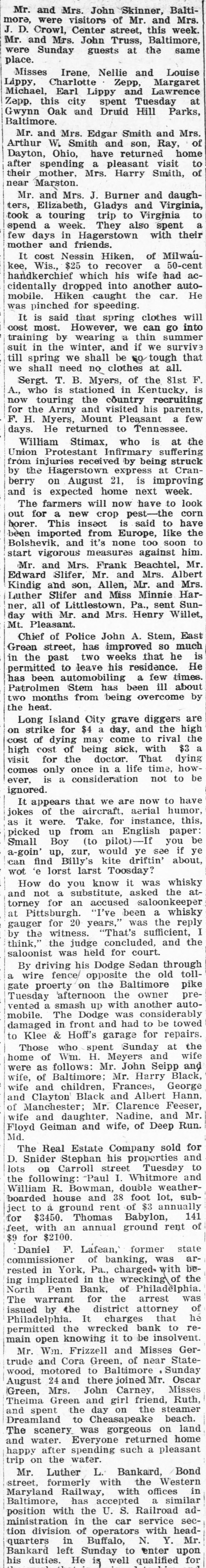 Mr. and Mrs. John Skinner, Baltimore, were visitors of Mr. and Mrs. J. D. Crowl, Center street, this week. Mr. and Mrs. John Truss, Baltimore, were Sunday guests at the same place. Misses Irene, Nellie and Louise Lippy, Charlotte Zepp, Margaret Michael, Earl Lippy and Lawrence Zepp, this city spent Tuesday at Gwynn Oak and Druid Hill Parks, Baltimore. Mr. and Mrs. Edgar Smith and Mrs. Arthur W. Smith and son, Ray, of Dayton, Ohio, have returned home after spending a pleasant visit to their mother, Mrs. Harry Smith, of near Marston. Mr. and Mrs. J. Burner and daughters, Elizabeth, Gladys and Virginia, took a touring trip to Virginia to spend a week. They also spent a few days in Hagerstown with their mother and friends. It cost Nessin Hiken, of Milwaukee, Wis., $25 to recover a 50-cent handkerchief which his wife had accidentally dropped into another automobile. Hiken caught the car. He was pinched for speeding. It is said that spring clothes will cost most. However, we can go into training by wearing a thin summer suit in the winter, and if we survive till spring we shall be SO tough that we shall need no clothes at all. Sergt. T. B. Myers, of the 81st F. A., who is stationed in Kentucky. is now touring the country recruiting for the Army and visited his parents, F. H. Myers, Mount Pleasant a few days. He returned to Tennessee. William Stimax, who is at the Union Protestant Infirmary suffering from injuries received by being struck by the Hagerstown express at Cranberry on August 21, is improving and is expected home next week. The farmers will now have to look out for a new crop pest-the corn horer. This insect is said to have been imported from Europe, like the Bolshevik, and it's none too soon to start vigorous measures against him. Mr. and Mrs. Frank Beachtel, Mr. Edward Slifer. Mr. and Mrs. Albert Kindig and son, Allen, Mr. and Mrs. Luther Slifer and Miss Minnie Harner. all of Littlestown, Pa., sent Sunday with Mr. and Mrs. Henry Willet, Mt. Pleasant. Chief of Police John A. Stem, East Green street, has improved SO much in the past two weeks that he is permitted to leave his residence. He has been automobiling a few times. Patrolmen Stem has been ill about two months from being overcome by the heat. Long Island City grave diggers are on strike for $4 a day, and the high cost of dying may come to rival the high cost of being sick, with $3 a visit for the doctor. That dying comes only once in a life time, however, is a consideration not to be ignored. It appears that we are now to have jokes of the aircraft, aerial humor, as it were. Take, for instance, this, picked up from an English paper: Small Boy (to pilot)-If you be a-goin' up, zur, would ye see if ye can find Billy's kite driftin' about, wot e lorst larst Toosday? How do you know it was whisky and not a substitute, asked the attorney for an accused saloonkeeper at Pittsburgh. "I've been a whisky gauger for 20 years,' was the reply by the witness. "That's sufficient, I think,' the judge concluded, and the saloonist was held for court. By driving his Dodge Sedan through a wire fence/ opposite the old tollgate proerty on the Baltimore pike Tuesday afternoon the owner prevented a smash up with another automobile. The Dodge was considerably damaged in front and had to be towed to Klee & Hoff's garage for repairs. Those who spent Sunday at the home of Wm. H. Meyers and wife were as follows: Mr. John Seipp and wife, of Baltimore; Mr. Harry Black, wife and children, Frances, George and Clayton Black and Albert Hann, of Manchester; Mr. Clarence Feeser, wife and daughter, Nadine, and Mr. Floyd Geiman and wife, of Deep Run. Md. The Real Estate Company sold for D. Snider Stephan his properties and lots on Carroll street Tuesday to the following: "Paul I. Whitmore and William R. Bowman, double weatherboarded house and 38 foot lot, subject to a ground rent of $3 annually for $3450. Thomas Babylon, 141 feet, with an annual ground rent of $9 for $2100. Daniel F. Lafean, former state commissioner of banking, was arrested in York, Pa., charged with being implicated in the wrecking of the North Penn Bank, of Philadelphia. The warrant for the arrest was issued by the district attorney of Philadelphia. It charges that he permitted the wrecked bank to remain open knowing it to be insolvent. Mr. Wm. Frizzell and Misses Gertrude and Cora Green, of near Statewood, motored to Baltimore Sunday August 24 and there joined Mr. Oscar Green, Mrs. John Carney, Misses Theima Green and girl friend, Ruth, and spent the day on the steamer Dreamland to Cheasapeake beach. The scenery was gorgeous on land and water. Everyone returned home happy after spending such a pleasant trip on the water. Mr. Luther L. Bankard, Bond street, formerly with the Western Maryland Railway, with offices in Baltimore, has accepted a similar position with the U. S. Railroad administration in the car service sec-