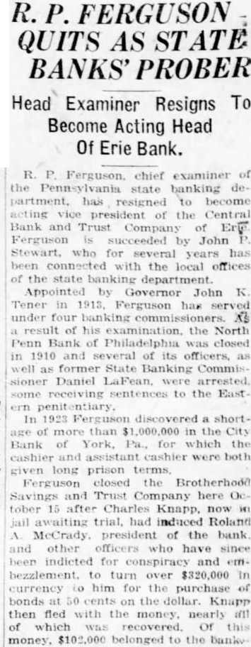 R. P. FERGUSON QUITS AS STATE BANKS' PROBER Head Examiner Resigns To Become Acting Head Of Erie Bank. R. chief examiner of the state banking partment. has resigned to become vice president of the Central Trust Company of Eric succeeded by John who for years with the local offices of the state department. Appointed by Governor John K. Tener in Ferguson has under four As result of his examination. the North Penn Bank Philadelphia was closed in and several of its officers, as as former State Banking Commis Daniel were sentences to the Ferguson discovered a shortof more than in the City Bank of Pa., for which the cashier and assistant cashier were both long prison and Trust Company here October after Knapp. in awaiting trial, had induced Roland McCrady. president of the bank and other officers who have indicted for and emto turn over $320,000 currency him for the purchase of bonds 50 cents on the dollar. Knapp of recovered. Of this belonged to the