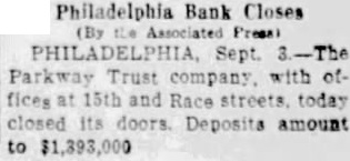 Brief notice only states the Parkway Trust Company in Philadelphia closed; no cause or government action specified.