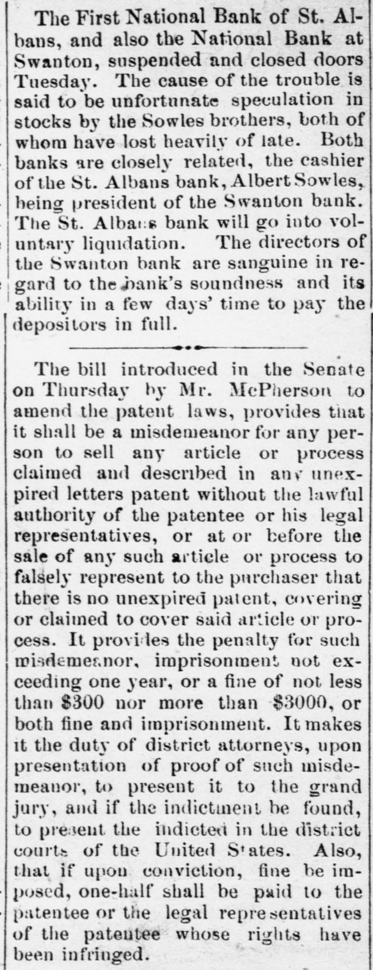 IN GENERAL Chinese conviots were Tuesday. received in Five the New Jersey State prison age, McCanlley, 35 years of Samuel and Westmorekilled his father, in atternoon. shot county, Pa., on Monday land a terrible riot between There was and Mexican railroad laborers Seven American Palmas, Mexico, on Monday. woundrd, men were at Los killed and thirteen three mortally. named MoPherson, charged in A man murder, was hanged by vigilants with yard at Dayton, Washingtan He prothe Territory, jail last Saturday night. tessed his innocence. The Boston Traveller reports the of failure the William B. Fowle, treasurer and says of Auburudale Watch Company, Hialiabilities it will l involve the company. are supposed to be small. The Treasury Department rules American that Canadian "Canadian tugs cannot tow waters into American vessels from waters beyond the first American in which they make entry." port medical commission appointed to The William H. Ostrander, under examine of death at Utica, New York,ha is not sentence to the Governor that he place reported insane. The execution will take on Friday next. The steamship Wanderer, at New that from Belize, brings Quatemala, news Orleans Barrios, the President of the Senor grossly and publicly insulted latter British "has Ambassador, and that the has left for England. A dispatch from Lima, Peru, division states Iglesias has organized a 1,000 that men at Cajamaica, is now marching reach Trujillo, which he expects to on about the 20th inst., and will provisionally occupy that city. Wright, Wooster & Co., wool dealers Boston, made an assignment Tuesday. be large. of Their liabilities are supposed to from firm was considered worth in The $100,000 to $150,000. It stood well surrepute, and the tailure caused much prise. The Surgeon General of the that Marine the Service is informed of steamship Hospital Amethyat left four cases sailed yellow fellow fever at Havana, and Boston. on the 4th instant for thence The health authorities of the latter city have been notified. Andrew and George Ensinger brothers, 17 at the toot of North Mountain, miles living west of Carliale, Pennsylvania, quarrelled and fought on Monday George mornabout a tract of land, and a ing Andrew in the back, inflicting shot wound which is likely to prove fatal. There was a heavy run on Monday of Second National Bank upon the New York, because its president, Elmira, reported, had lost $150,000 in have pork as As he was stated to him, fully speculations. settled all the demands upon the still retaining a large private tortune, run upon the bank ceased Tuesday. About $100,000 of the 31 per sent. the bouds have already been presented at Treasury Department for redemption call under the 121st call for bonds. The but will not mature until November 1st, when of the bonds will be redeemeed interest any presented prior to maturity, with to the date of presentation. Sallivan, the slugger, opened his gorgeous saloon in Boston Tuesday night. that So great was the throng at the opening blocked ) at 9 o'clock thousands of people with such street and swarmed in the tumultuousness as nearly to break down to t the bar. An extra force of police had Some be summoned to clear the place. 8 women were among the visitors. The National Eincational Assembly will meet at Ocean Grove, N. J., to-morGovernor Pattison of Pennsylvania United row. will preside, and Gen. Exton, States Commissioner of Edicetion, Other will : del ver the opening address. speakers will be Dr. Wickersham, SenaBiair of New Hampshire, and Judge Tourgee. tor The assembly will close on Sunday night. The punishment of the lash has been adopted in Montreal for certain of gross too offenses which have lately become frequent occurrence. A French Canadian atnamed Jean Baptiste Dubois of tempted tramp to outrage a child eight years circuma few weeks ago, under age, stances which would have conjured up Jnd Lvuch in a less peaceful place than Montro al. Tuesday he was sentenced receive 20 tashes upon his bare back the and to to do & year's hard labor in penitentiary The Grand iery of the Sons of Vateraus, in session Columbus, Ohio, Cow has elected the Howing fliears rander-in Chief, Frank H Marrill, Auburn, Maine Lienteuat CommanderChief, Augustns Salizman, St. Joseph, Missouri ; Vice Lieutebant Commanderin-Chief, Charle C Morton, Philadelphia Chief of Staff Horace L Wright, Auburn, Maine. The commandery embraces 300 camps with a membership of 10,020, all admitted within two years. The session nded yesterday. The effect of the Barlow failure very depressing.ou usiness in St. Albaus, Vermont, Theaday sident Brainerd de of the Trust Company, says the depositors will not lose much, but the positors are less hopeful. The company's last statement showed that it had 2,100 depositors with deposits aggregating $600,000. Several railroad men, among them General Fairbanks, had & conterat Barlow's house. The First ence National Bank prepared for a run yesterday morning, but none took place. Five hundred cases of arms and ammunition were sent from San Francisco last Thursday, on the Pacific mail steamship Comstock. All the cases were from Springfield, Mass., and those containing ammunition were branded "U. S. Government, 4 calibre.' It is said that during the last 18 months extensive shipments of war material have been regularly made to C. Schmidt, at Shanghai. "During that period 240,000 Springfield all rillas and 25 000,000 cartridges in have been forwarded, besides from 500 for to 800 bales of cotton duck, suitable tents, by express by each steamer for That China