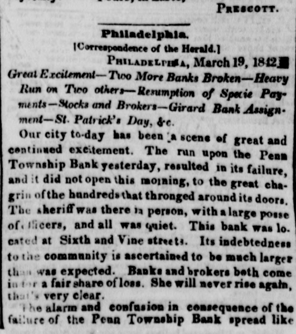 PRESCOTT. Philadelphia. I Correspondence of the Herald.] March 19, 1812] Great Excitement- Two More Banks Broken-Heavy Run on Two others-Resumption of Specie Payments-Stocks and Brokers-Girard Bank Assign. ment-St. Patrick's Day, Sc. Our city to-day has been a scene of great and continued excitement. The run upon the Penn Township Bank yesterday, resulted in its failure, and it did not open this moining, to the great chagrin of the hundredsthat thronged around its doors. The sheriff was there in person, with a large posse of dicers, and all was quiet. This bank was lo. eated at Sixth and Vine streets. Its indebtedness to the community is ascertained to be much larger than was expected. Banks and brokers both come in for a fair share of loss. She will never rise again, that's very clear. The alarm and confusion in consequence of the failure of the Penn Township Bank spread like