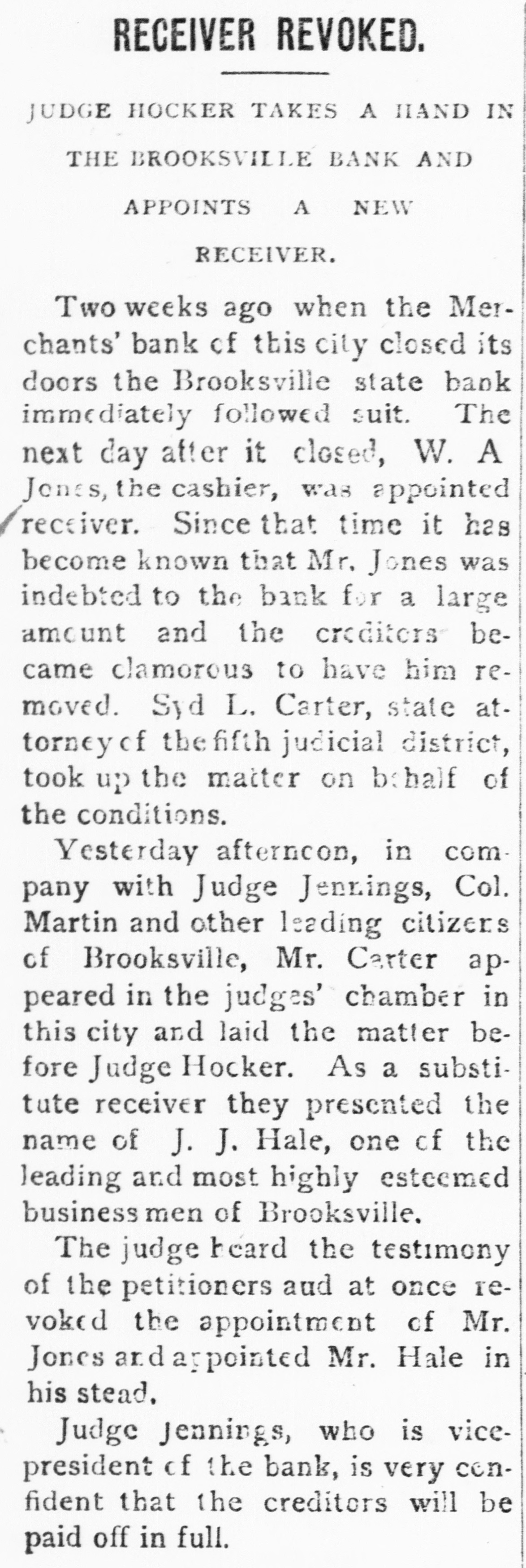 FLORIDA HAS THREE FAILURES. BANKS CLOSE AT OCALA, ORANGE CITY AND BROOKSVILLE. The Merchants National the One Involved at Ocala and Its Liabilities $154,000-The Orange City Bank a Private Concern Run by the Stillman Brothers-The Failure at Brooksville Brought on by the Assignment at Ocala. Ocala, Fla., Jan. 14.-The Merchants' National Bank closed its doors this morning. To many it was not a surprise, but to the public at large it was, as it was thought it had passed through its worst trials. President McConnell was absent in New York, trying to arrange with its correspondent there to get help. From statements made to the Morning News correspondent by persons, who ought to know what they are talking about, the story runs about in this way: For several weeks there has been a stealy withdrawal of deposits, amounting to about $50,000. Yesterday the climax was reached, about $12,000 being withdrawn, carrying the cash on hand down to $1,500. The directors held a meeting last night, and knowing big demands would be made this morning, decided to close the bank's doors. Long before 9 o'clock this morning a crowd began to gather, many in the hope that the bank would open, ready to demand their deposits. By 9 o'clock several hundred people were around the corner, and when the notice was posted "closed by order of the directors," the excitement became intense. Men wept in disappointment, others gesticulated wildly, and the air was lurid with hot speech, It is a sad and sore blow to Ocala. The people were just beginning to recover from the effects of the freeze, and the failure of the First National Bank, when this new calamity sends them reeling. On Monday of last week the bank examiner was here, went through the bank's accounts and pronounced it all right, at least so the public print expressed. A director said this morning the deposits ran down for the month from $120,000 to $70,000 at its close. It is also learned that a deed executed last August for $13,000 on the bank building to J. N. C. Stockton, a Jacksonville banker, was filed for record this morning before 8 o'clock. It is also stated that President McConnell's property is mortgaged. Business men say it has been next to impossible for the past six months to get any accommodation. The failure hits the Ocala newspaper men for a $1,000, notably F. E. Harris for nearly $800. A winter visitor placed $200 in the bank several weeks ago for his use and others who came to enjoy the climate small sums. While some of the Ocala people are hopeful others are the reverse. Many are finding fault at President McConnell's absence and others that the directors were not better advised regarding the condition of the bank. Washington, Jan. 14.-The controller of the currency was advised this morning by the directors of the Merchants' National Bank of Ocala, Fla., that the bank had closed its doors. The bank had a capital of $100,000. Its liabilities are $154,000, as follows: $108,000 Due depositors 38,000 Borrowed money 8,000 Due to banks Bank Examiner Shubrick has been placed in charge of the bank. Jacksonville, Fla., Jan. 14.-The Orange City Bank, a private institution of which John E. Stillman, chairman of the republican executive committee of this state, is president, has closed its doors, and R. S. Leavitt of Orange City, the assignee, is now in charge. The cashier of the bank was Arthur Stillman, a brother of the president. The Stillman brothers were the principal owners of the bank, and they have assigned all of their property to R. S. Leavitt for the benefit of their creditors. There was no warning of the failure, and within the past few weeks several northern people, who have winter homes in the vicinity of Orange City, have deNo posited various sums in the bank. statement of the assets or liabilities of the bank has yet been announced Brooksville, Fla., Jan. 14.-The Brooksville State Bank has closed its doors tem. porarily on account of the suspension f the Merchants National Bank of Ocala this morning. The losses are pretty general. Confidence, however, remains in the honesty of the officials of this bank.