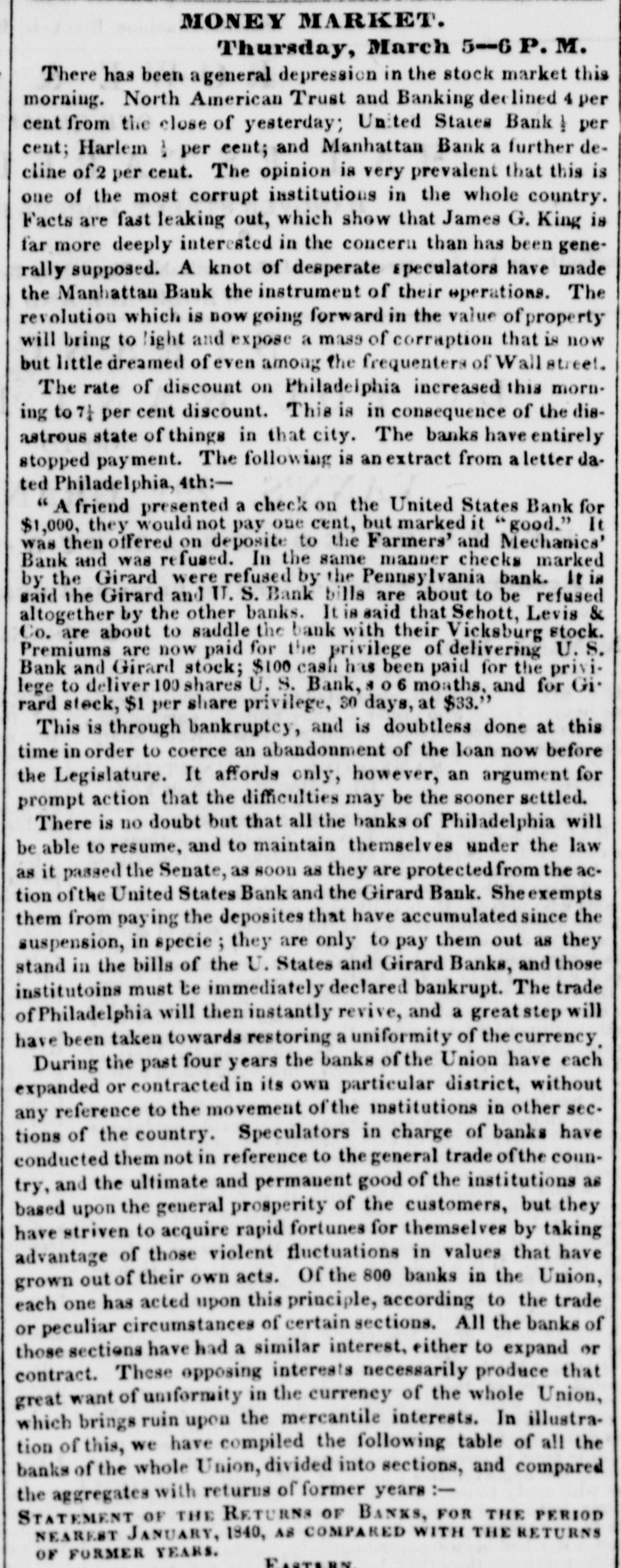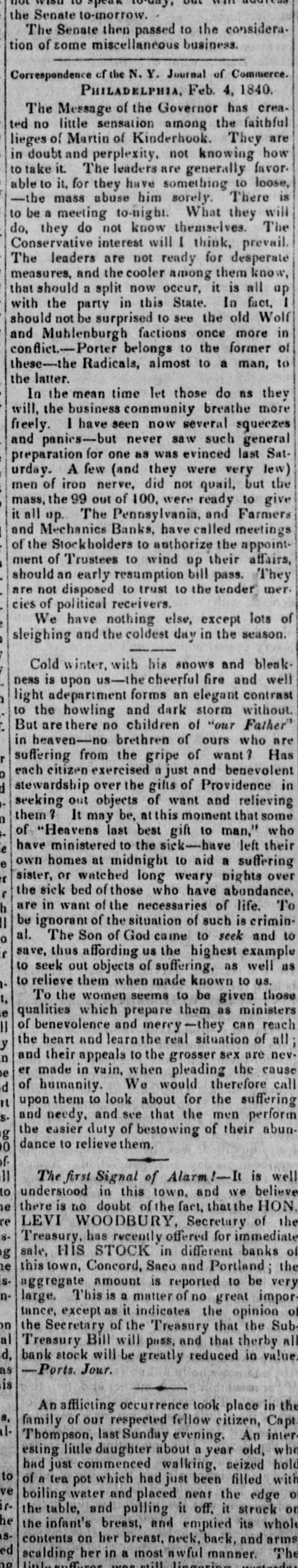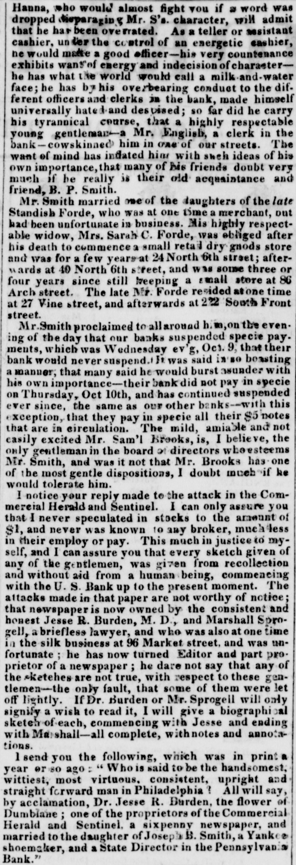 Hanna, who would almost fight you if a word was dropped disparaging Mr. S's. character, will admit that he has been overrated. As a teller or assistant cashier, under the control of an energetic cashier, ne would make a good officer-his very countenance exhibits want of energy and indecision of character-he has what the world would call a milk-and-water face; he has by his overbearing conduct to the different officers and clerks in the bank, made himself universally hated and despised; so far did he carry his tyrannical course, that a highly respectable young gentleman-a Mr. English, a clerk in the bank-cowskinned him in one of our streets. The want of mind has indated him with such ideas of his own importance, that many of his friends doubt very much if he really is their old acquaintance and friend, B. P. Smith. Mr. Smith married one of the daughters of the late Standish Forde, who was at one time a merchant, out had been unfortunate in business. His highly respectable widow, Mrs. Sarah C. Forde, was obliged after his death to commence a small retail dry goods store and was for a few years at 24 North 6th street; afterwards at 40 North 6th street, and was some three or four years since still keeping a small store at 86 Arch street. The late Mr. Forde resided stone time at 27 Vine street, and afterwards at 222 South Front street. Mr.Smith proclaimed to all around him, on the evening of the day that our banks suspended specie payments, which was Wednesday ev'g, Oct. 9, that their bank would never suspend. It was said in so boasting a manner; that many said he would burst asunder with his own importance-their bank did not pay in specie on Thursday, Oct 10th, and has continued suspended ever since, the same as our other banks--with this exception, that they pay in specie all their $5 notes that are in circulation. The mild, amiable and not easily excited Mr. Sam'l Brooks, is, I believe, the only gentleman in the board of directors who esteems Mr. Smith, and was it not that Mr. Brooks has one of the most gentle dispositions, I doubt much if he would tolerate him. I notice your reply made to the attack in the Commercial Herald and Sentinel. I can only assure you that I never speculated in stocks to the amount of $1, and never was known to any broker, much less in their employ or pay. This much in justice to myself, and I can assure you that every sketch given of any of the gentlemen, was given from recollection and without aid from a human being, commencing with the U. S. Bank up to the present moment. The attacks made in that paper are not worthy of notice; that newspaper is now owned by the consistent and honest Jesse R. Burden, M. D., and Marshall Sprogell, a briefless lawyer, and who was also at one time in the silk business at 96 Market street, and was unfortunate; he has now turned Editor and part proprietor of a newspaper; he dare not say that any of the sketches are not true, with respect to these gentlemen-the only fault, that some of them were let off lightly. If Dr. Burden or Mr. Sprogeil will only signify a wish to read it, I will give a biographical sketch of each, commencing with Jesse and ending with Marshall-all complete, with notes and annotations. I send you the following, which was in print a year or so ago: "Who is said to be the handsomest, wittiest, most virtuous, consistent, upright and straight forward man in Philadelphia? All will say, by acclamation, Dr. Jesse R. Burden, the flower of Dumbiane; one of the proprietors of the Commercial Herald and Sentinel, a sixpenny newspaper, and married to the daughter of Joseph B. Smith, a Yankee shoemaker, and a State Director in the Pennsylvania Bank."