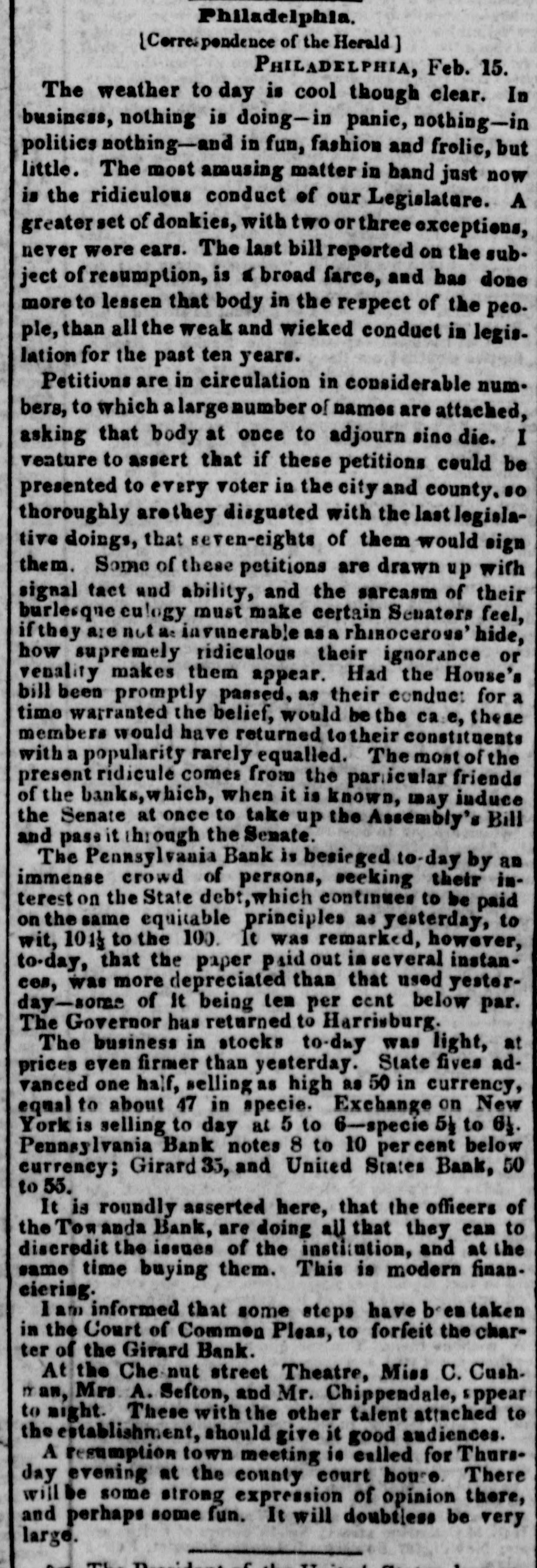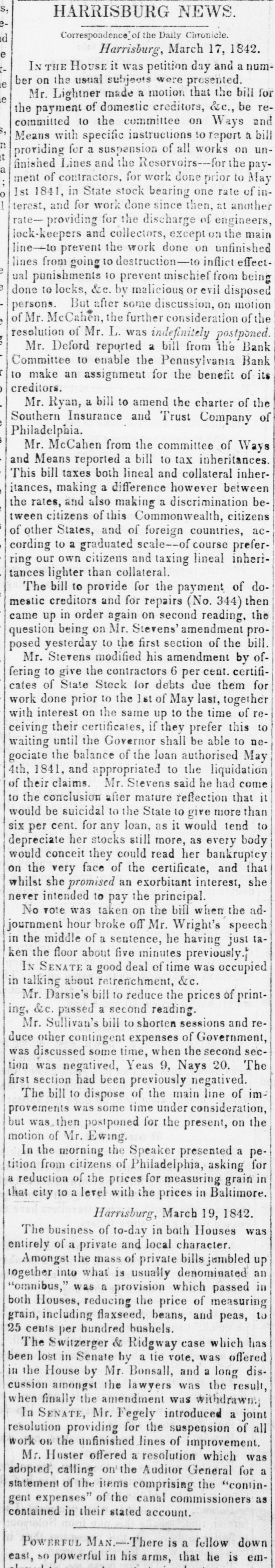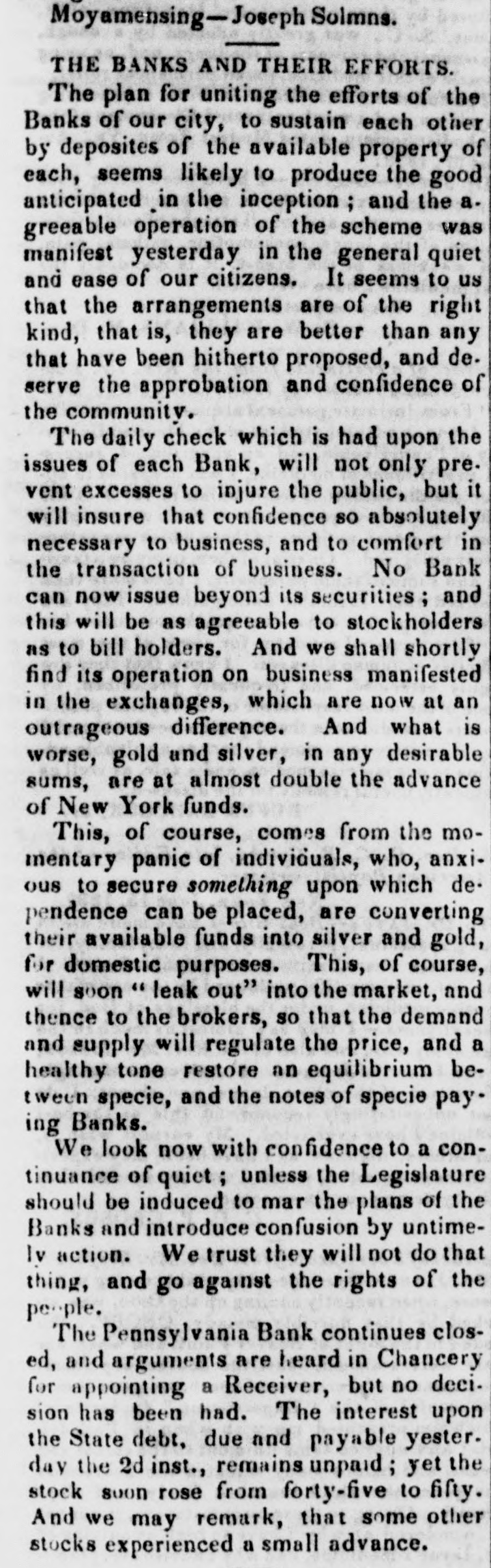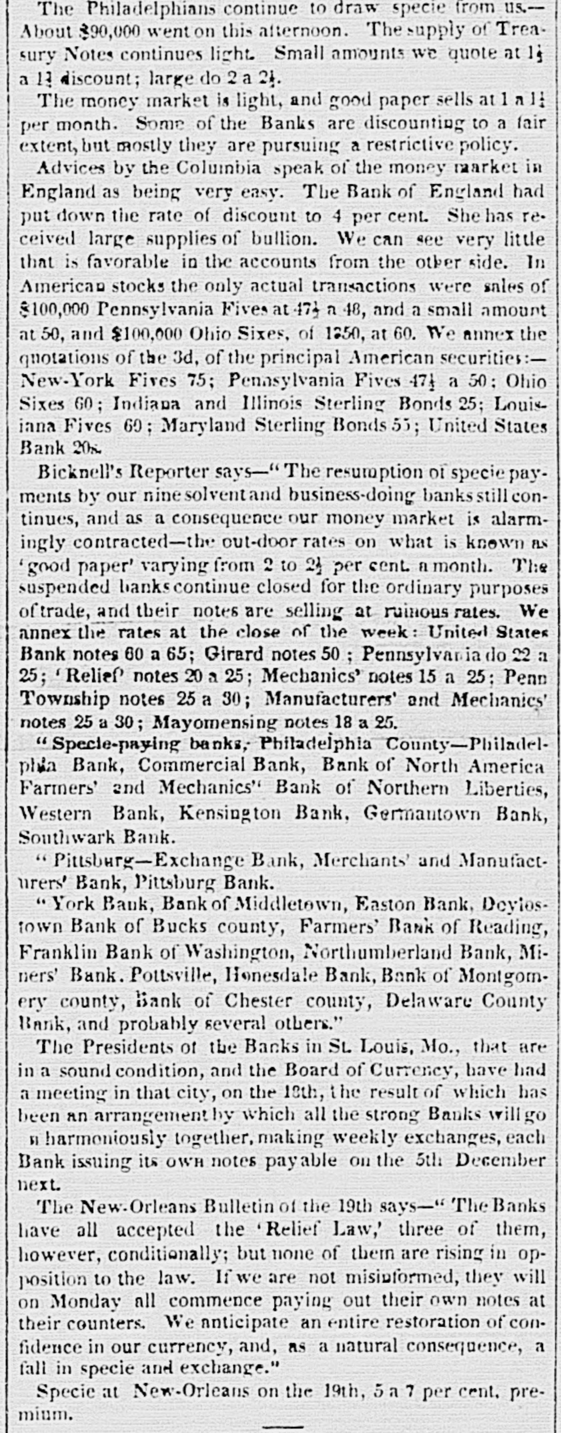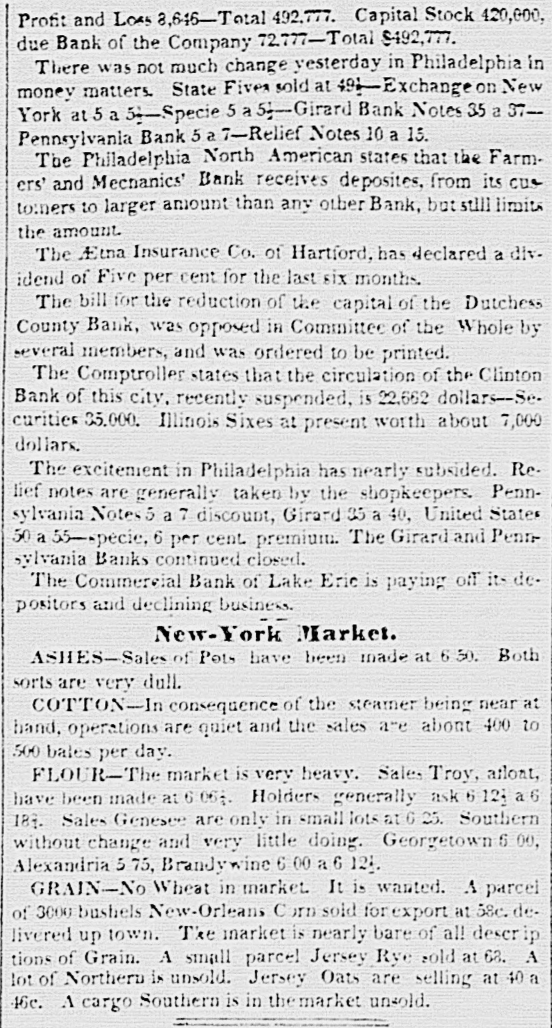 $88,322,496 $88,862,248 Total To determine the circulation of all the Banks, the amount of notes of other Banks contained in the statements should bedecutted. The notes of the Northampton Bank, Pa., are becoming pre depreciated. Sales have been made at SO a SS per cent discount. The following counterfeits are in circulation Counterfeit twos on the Otseg Co. Bank are is circulation Rob't Campbell, President S. Scott, Cashier, Pay F. Cooperdate Aug. 4, 1842. Bank of Auburn, pay J. Long, dated Auburn, Nov. 1, 1842-J.S Seymour, Cashier E. Beach, Pre sident. Letter A.-No. 1456. The words Safety Fund' are heavy. corresponding with the general lettering of the bill; but New-York is lighter colored and longerle tered than it should be. The city banksa Rochester are discounting butlittle. Their circulation has greatly decreased the pastyear. Their presenticondition is such as to stimulate spring trade, should confidence become a little more restored. Exchange on New-York is from 1 to 1 per cent. Bickneli's Philadelphia Reporter says Money continues abuedant. Good paper is very scarce. The rate may be quoted at per cent per annum. The Manufacturers' and Mechanics' Bank has resumed specie payments on all liabilliles, except in Relief notes, since our last. The Moyamensing, the Peonsylvania, the Girard, and the U. S. Banks continue closed. Business is rather more active, but is yet regarded as very dull. Specie is plenty, Treasury notes on Saturday la 11 per cent. Relief notes without change.Nothing has been done by our Legislature in relation to the State Debt. The branches of the State Bank of Alabama have now all been put in liquidation and there was supposed to be little doubt that the Mother Bank at Tuscaloosa would SOGR be placed in the same category. Someot the New Orleans Banks and the Bank of Missouri St. Louis, refuse to received on general deposite or in payment Spanish quarters, bits or picayunes The latter has on hand $30,000 in dimes. The Mobile Advertiser of the 4th has the following remarks upon a panic in the Exchange market The market opened in the first of the week at 20 a 22 for starling, 18 for Ne w-York sight and 21 a 22 for New Orleans specie-from which it continued steadily advancing at the rate et 2 per cent. a day, until Wednesday, when it jumped up about 5 per sent, and on Thursday fully 10 per ceau more, sterling being rated at 40, New-York 35 to 40, and specie 40 per cent. premium on currency. A complete panic pervaded the community, almost every one hastening to invest his Alabama money in specie, exchange, cotton, or wbatever else could be had. In this state of things sellers of exchange could not be otherwise than affected with the general distrust, and in consequence were rather afraid to draw to the extent of their means. Yesterday morning the rates opened S to 5 per cent higher than the average rates of Thursday, but there was evi ently less anxiety to boy-whether because the most timid had suc. ceeded in ridding themselves of their money, or from areturn to the sober second thought, by the community, we cannot say, but the rates declined before noox on an arerage 5 per cent. Gold was sold early in the morning at 45, and hy noon 41 was the highest that could be obtained.e think it very doubtful whether the currency will for a good while to come stand as well in general estimation.The present blow, although admitted to have been uncalled for and altogether unnecessary, is one which will not lightly away with the occasion We give the average rates 90 yesteruny--sterling 40, New York and Boston 60 days, 35; 30 days, S4 a 36; sight S8 a 40; New Orleans 40; Specie 48 a 41. At New Orleans, on tbe 4th inst., no material improvement in Exchange. Sterling S a 53 per cent premium; Francs 5 53 a 5 57; New-York 60 days 24 a 23 per cent. discount; Sight Checks 1/4 a 1 per cent. discount. large amounts of specie were going over to Mobile. Markets-Carefully reported for The Tribune. TUESDAY, P. M. ASHES-We hear of no operations to-day 10 either description. The prices remain as before quoted. Pots 525 a531t offered, 5 50 asked; Pearls 6.50-nominal. There appears to be no demand for Pearls, but a few Pots could sold at 5313 COTTON-The demand to-day is rather dull, and we can bear of only some 500 to 600 bales sold. Prices are without no iceable change, but for qualities below7fair rates rather in favor of the buyer. Fair and above are firm al rather enhanced prices. Some fine is in the market, but held high-3c The recent arrivals have not on the 4th, the not been business was at below fair. was 5 a 5}; middling fair a fair a At Mobile on advices decline been sampled. having 7t and 72; upward. At Middling good N received, Orleans 81 quoted 83. steamer's light, of the of which were for investment of Alabama to 1c then some factors asking a much 41h, sales ces closed on the 2d, 1 mostly week higher 20,000 bales, previous week, 10,000 money. sold Pri- the greater advance. Quotations were unsettied. Ordinary a 6;; middling 6 a7; middling fair 71 a 74: receipts 20,657, stock 88,185 bales. At Augusta on the Bill, all received taken at iat advance. Middling fair 5 a fair to good fair 6 63. FLOUR AND MEAL-There is a moderate inquiry for and the market has become cleared of all Flour to be had below 4 434. For round Western, the the demand flas hoop nearly boop is We fiat Western 4 4S3 a 50. recent of N Orleans we have heard of no 551 obis of a fancy brand, on private or resexcepting the receipts light quote terms. brands In Southern there little and the lower are pressing on 4 12 a 4 25. How in very Common the market. doing, Small are worth Georgetownat about 12j. grades Ivania, s.c. 100 a 12); Richmond and-st, Peterburg, Alabama, sales Pennsy wine a small lot of N Men, farther sales at hhds 12:25 cash, 12 75 Mills sold Jersey City 250; 5 50; Brandywine Rye Brandy Flour 262); 312). 4 50; 4 mos. AtN Orleans Flour was dull at S 12) a 25. The BL Louis New Kra Upwards of 9000 abls of Flour