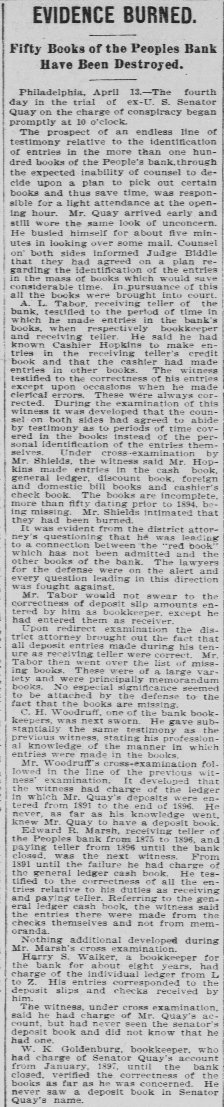 EVIDENCE BURNED. Fifty Books of the Peoples Bank Have Been Destroyed. Philadelphia, April 13.-The fourth day in the trial of ex-U. S. Senator Quay on the charge of conspiracy began promptly at 10 o'clock. The prospect of an endless line of testimony relative to the identification of entries in the more than one hundred books of the People's bank, through the expected inability of counsel to decide upon a plan to pick out certain books and thus save time, was responsible for a light attendance at the opening hour. Mr. Quay arrived early and still wore the same look of unconcern. He busied himself for about five minutes in looking over some mail. Counsel on' both sides informed Judge Biddle that they had agreed on a plan regarding the identification of the entries in the mass of books which would save considerable time. In pursuance of this all the books were brought into court. A. L. Tabor, receiving teller of the bank, testified to the period of time in which he made entries in the bank's books, when respectively bookkeeper and receiving teller. He said he had known Cashier Hopkins to make entries in the receiving teller's credit book and that the cashier had made entries in other books. The witness testified to the correctness of his entries except upon occasions when he made clerical errors. These were always corrected. During the examination of this witness it was developed that the counsel on both sides had agreed to abide by testimony as to periods of time covered in the books instead of the personal identification of the entries themselves. Under cross-examination by Mr. Shields, the witness said Mr. Hopkins made entries in the cash book, general ledger, discount book, foreign and domestic bill books and cashier's check book. The books are incomplete, more than fifty dating prior to 1894, being missing. Mr. Shields intimated that they had been burned. It was evident from the district attorney's questioning that he was leading to a connection between the "red book" which has not been admitted and the other books of the bank. The lawyers for the defense were on the alert and every question leading in this direction was fought against. Mr. Tabor would not swear to the correctness of deposit slip amounts entered by him as bookkeeper. except he had entered them as receiver. Upon redirect examination the distriet attorney brought out the fact that all deposit entries made during his tenure as receiving teller were correct. Mr. Tabor then went over the list of missing books. These were of a large varlety and were principally memorandum books. No especial significance seemed to be attached by the defense to the fact that the books are missing. C. H. Woodruff, one of the bank bookkeepers, was next sworn. He gave substantially the same testimony as the previous witness. stating his professional knowledge of the manner in which entries were made in the books. Mr. Woodruff's cross-examination followed in the line of the previous witness' examination. It developed that the witness had charge of the ledger in which Mr. Quay's deposits were entered from 1891 to the end of 1896. He never, as far as his knowledge went, knew Mr. Quay to have a deposit book. Edward R. Marsh, receiving teller of the Peoples bank from 1875 to 1896, and paying teller from 1896 until the bank closed. was the next witness. From 1891 until the failure he had charge of the general ledger cash book. He testified to the correctness of all the entries relative to his duties as receiving and paying teller. Referring to the general ledger cash book, the witness said the entries there were made from the checks themselves and not from memoranda. Nothing additional developed during Mr. Marsh's cross examination. Harry S. Walker, a bookkeeper for the bank for about eight years, had charge of the individual ledger from L to Z. His entries corresponded to the deposit slips and checks received by him. The witness, under cross examination, said he had charge of Mr. Quay's account, but had never seen the senator's deposit book and did not know that he had one. W. K. Goldenburg, bookkeeper, who had charge of Senator Quay's account from January, 1897, until the bank closed, verified the correctness of the books as far as he was concerned. He never saw a deposit book in Senator Quay's name.