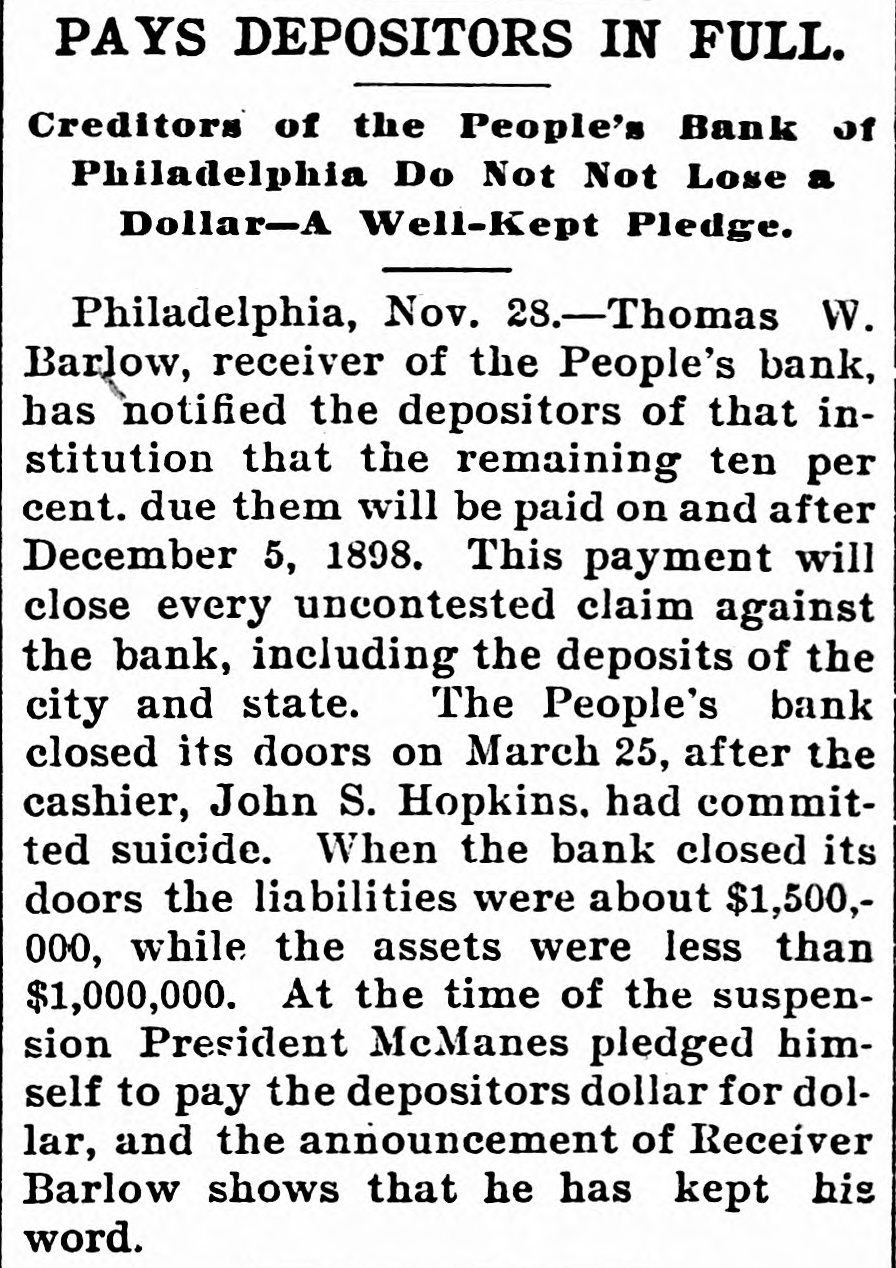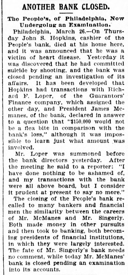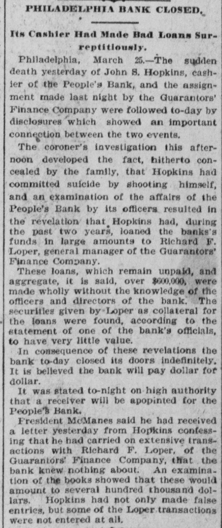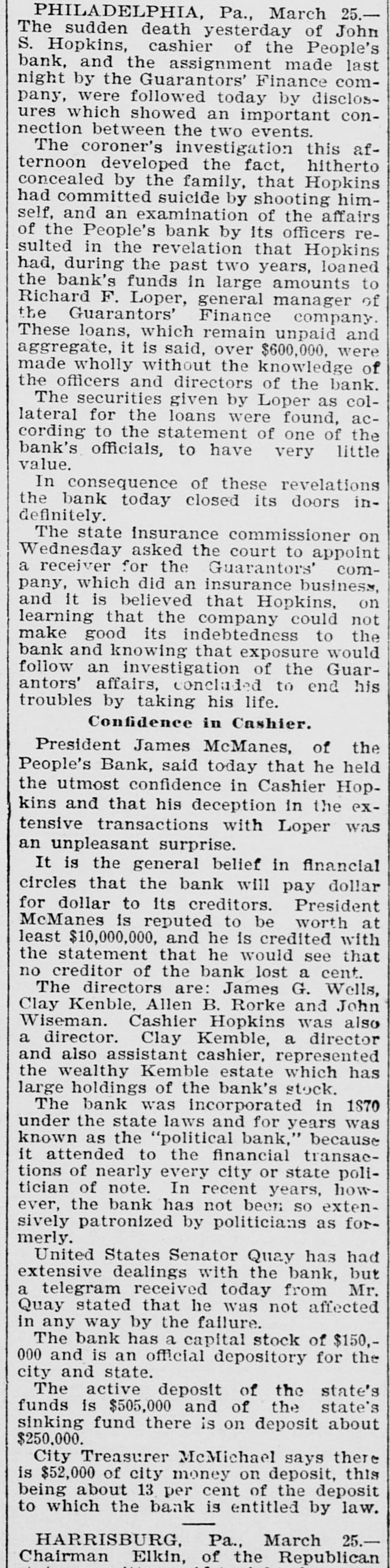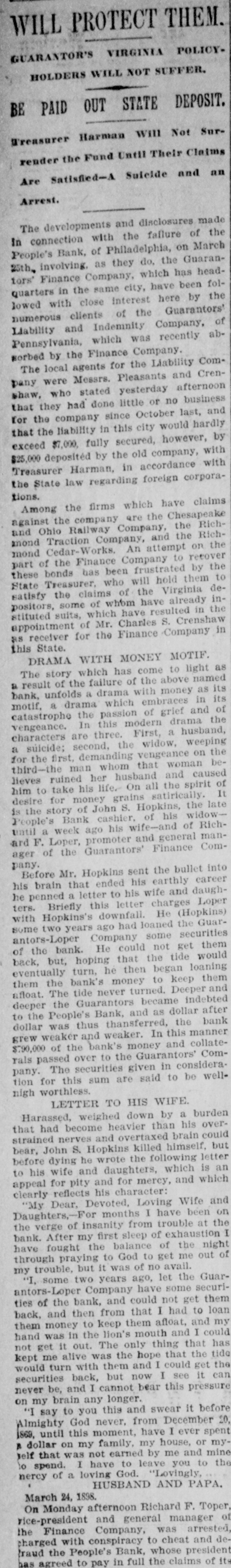 WILL PROTECT THEM. GUARANTOR'S VIRGINIA POLICYHOLDERS WILL NOT SUFFER. BE PAID OUT STATE DEPOSIT. Treasurer Harman will Not Surrender the Fund Until Their Claims Are Satisfied-A Suicide and an Arrest. The developments and disclosures made the connection with the failure of People's In Bank, of Philadelphia, on March 25th. involving. as they do, the Guaran- headtors' Finance Company, which has folquarters in the same city, have been the lowed with close interest here by numerous clients of the Guarantors' of Liability and Indemnity Company, abPennsylvania, which was recently morbed by the Finance Company The local agents for the Liability Comwere Messrs. Pleasants and Crenpany shaw, who stated yesterday afternoon that they had done little of no business and for the company since October last, that the liability in this city would hardly by exceed $7,000, fully secured, however, $25,000 deposited by the old company, with with Treasurer Harman, in accordance the State law regarding foreign corporations. Among the firms which have claims the company are the Chesapeake RichRailway Company, Traction Company, and and mond against Ohio the the on Rich- the mond Cedar-Works. An attempt recover of the Finance Company to the part these bonds has been frustrated them by to State Treasurer, who will hold desatisfy the claims of the Virginia inpositors, some of whom have already in the stituted suits, which have resulted Crenshaw appointment of Mr. Charles S. in RS receiver for the Finance Company this State. DRAMA WITH MONEY MOTIF. story which has come to light named as The result of the failure of the above its bank, a unfolds a drama with money in as its motif, a drama which embraces and of catastrophe the passion of grief the vengeance. In this modern drama husband, are three. First, a second, the the a demanding vengeance for characters suicide; the first, widow, woman weeping on bethird-the man whom that ruined her husband and caused of lieves to take his life. On all the spirit It him for money grains satirically. late is desire the story of John S. Hopkins, widow- the Bank cashier, of his RichPeople's week ago his wife-and of until F. a Loper, promoter and general man- Comard ager of the Guarantors' Finance pany. Before Mr. Hopkins sent the bullet career into brain that ended his earthly his penned a letter to his wife and daugh- Loper he ters. Briefly this letter charges with Hopkins's downfall. He (Hopkins) the Guartwo years ago had loaned securities some antors-Loper Company some them the bank. He could not get would of but, hoping that the tide eventually back, turn, hé then began loaning them the bank's money to keep and afloat. them The tide never turned. Deeper indebted the Guarantors became after deeper the People's Bank, and as dollar bank to was thus thansferred, the dollar weaker and weaker. In this manner collategrew $790,000 of the bank's money and Comrals passed over to the Guarantors' consideraThe securities given in wellpany. tion for this sum are said to be night worthless. LETTER TO HIS WIFE. Harassed, weighed down by a burden overhad become heavier than his could strained that nerves and overtaxed brain but John S. Hopkins killed himself, letter bear, before dying he wrote the following is an his wife and daughters, which which appeal to for pity and for mercy, and clearly reflects his character: "My Dear, Devoted, Loving Wife and on Daughters, For months I have been the verge of insanity from trouble at bank. the After my first sleep of exhaustion fought the balance of the night of have through praying to God to get me out my trouble, but it was of no avail. "I, some two years ago, let the Guarantors-Loper Company have some securi- them of the bank, and could not get back, ties and then from that I had to loan money to keep them afloat, and could my them was in the lion's mouth and I has hand get it out. The only thing that tide not me alive was the hope that the would kept turn with them and I could get can the securities back, but now I see it never be, and I cannot bear this pressure on my brain any longer. "I say to you this and swear it before Almighty God never, from December 20. until this moment, have I on my family, my or 1869, dollar house, ever and spent mine my A yelf that was not earned by me the spend. I have to leave you to to nercy of a loving God. "Lovingly, HUSBAND AND PAPA. March 24, 1898. On Monday afternoon Richard F. Toper, of rice-president and general manager arrested Finance Company, was dethe charged with conspiracy to cheat and the People's Bank, whose president its !raud has agreed to pay in full the claims of