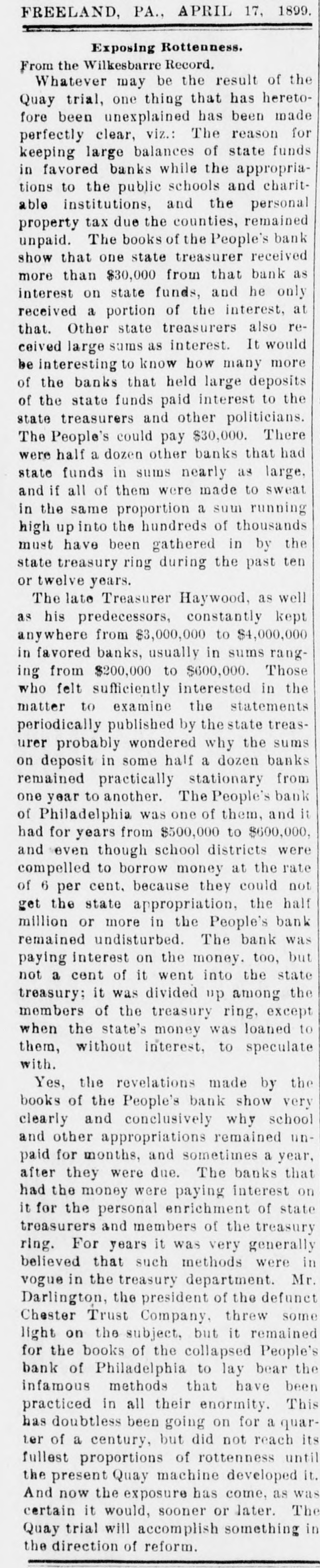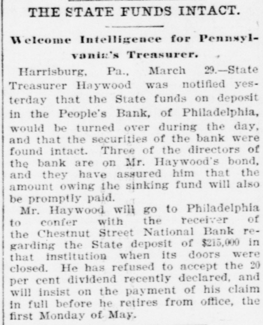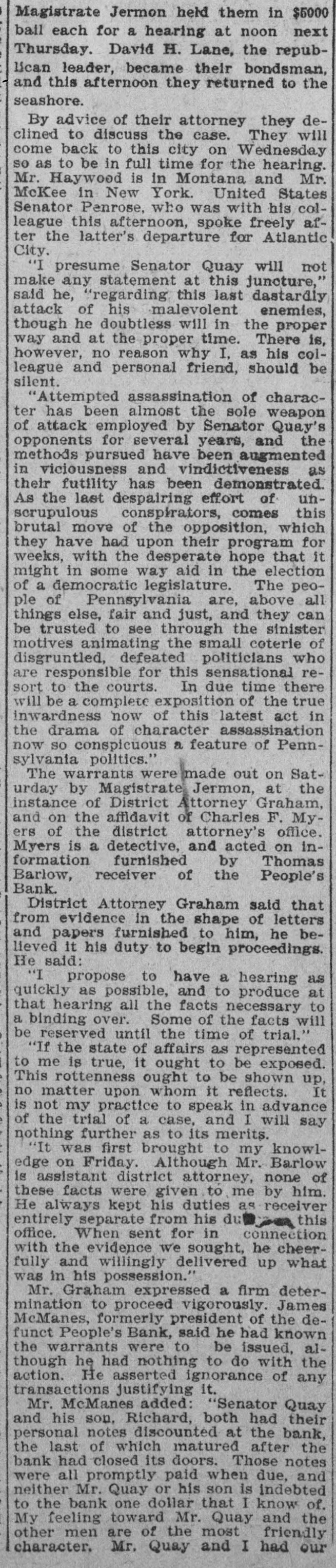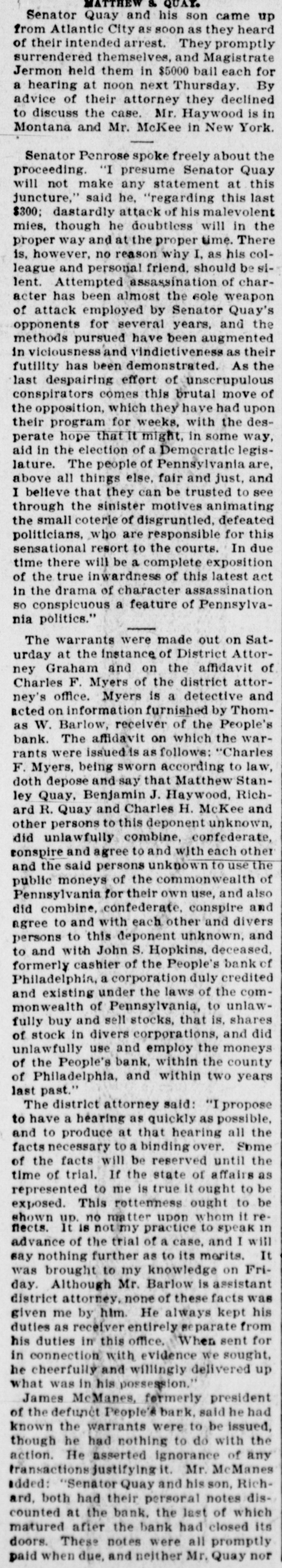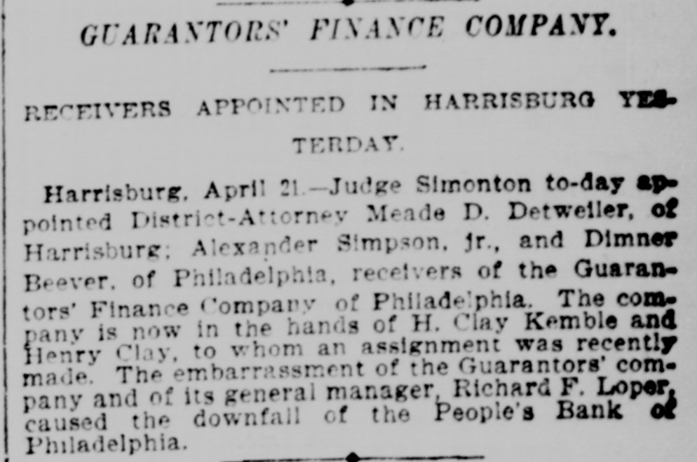 WILL PROTECT THEM. GUARANTOR'S VIRGINIA POLICYHOLDERS WILL NOT SUFFER. BE PAID OUT STATE DEPOSIT. Treasurer Harman will Not Surrender the Fund Until Their Claims Are Satisfied-A Suicide and an Arrest. The developments and disclosures made the connection with the failure of People's In Bank, of Philadelphia, on March 25th. involving. as they do, the Guaran- headtors' Finance Company, which has folquarters in the same city, have been the lowed with close interest here by numerous clients of the Guarantors' of Liability and Indemnity Company, abPennsylvania, which was recently morbed by the Finance Company The local agents for the Liability Comwere Messrs. Pleasants and Crenpany shaw, who stated yesterday afternoon that they had done little of no business and for the company since October last, that the liability in this city would hardly by exceed $7,000, fully secured, however, $25,000 deposited by the old company, with with Treasurer Harman, in accordance the State law regarding foreign corporations. Among the firms which have claims the company are the Chesapeake RichRailway Company, Traction Company, and and mond against Ohio the the on Rich- the mond Cedar-Works. An attempt recover of the Finance Company to the part these bonds has been frustrated them by to State Treasurer, who will hold desatisfy the claims of the Virginia inpositors, some of whom have already in the stituted suits, which have resulted Crenshaw appointment of Mr. Charles S. in RS receiver for the Finance Company this State. DRAMA WITH MONEY MOTIF. story which has come to light named as The result of the failure of the above its bank, a unfolds a drama with money in as its motif, a drama which embraces and of catastrophe the passion of grief the vengeance. In this modern drama husband, are three. First, a second, the the a demanding vengeance for characters suicide; the first, widow, woman weeping on bethird-the man whom that ruined her husband and caused of lieves to take his life. On all the spirit It him for money grains satirically. late is desire the story of John S. Hopkins, widow- the Bank cashier, of his RichPeople's week ago his wife-and of until F. a Loper, promoter and general man- Comard ager of the Guarantors' Finance pany. Before Mr. Hopkins sent the bullet career into brain that ended his earthly his penned a letter to his wife and daugh- Loper he ters. Briefly this letter charges with Hopkins's downfall. He (Hopkins) the Guartwo years ago had loaned securities some antors-Loper Company some them the bank. He could not get would of but, hoping that the tide eventually back, turn, hé then began loaning them the bank's money to keep and afloat. them The tide never turned. Deeper indebted the Guarantors became after deeper the People's Bank, and as dollar bank to was thus thansferred, the dollar weaker and weaker. In this manner collategrew $790,000 of the bank's money and Comrals passed over to the Guarantors' consideraThe securities given in wellpany. tion for this sum are said to be night worthless. LETTER TO HIS WIFE. Harassed, weighed down by a burden overhad become heavier than his could strained that nerves and overtaxed brain but John S. Hopkins killed himself, letter bear, before dying he wrote the following is an his wife and daughters, which which appeal to for pity and for mercy, and clearly reflects his character: "My Dear, Devoted, Loving Wife and on Daughters, For months I have been the verge of insanity from trouble at bank. the After my first sleep of exhaustion fought the balance of the night of have through praying to God to get me out my trouble, but it was of no avail. "I, some two years ago, let the Guarantors-Loper Company have some securi- them of the bank, and could not get back, ties and then from that I had to loan money to keep them afloat, and could my them was in the lion's mouth and I has hand get it out. The only thing that tide not me alive was the hope that the would kept turn with them and I could get can the securities back, but now I see it never be, and I cannot bear this pressure on my brain any longer. "I say to you this and swear it before Almighty God never, from December 20. until this moment, have I on my family, my or 1869, dollar house, ever and spent mine my A yelf that was not earned by me the spend. I have to leave you to to nercy of a loving God. "Lovingly, HUSBAND AND PAPA. March 24, 1898. On Monday afternoon Richard F. Toper, of rice-president and general manager arrested Finance Company, was dethe charged with conspiracy to cheat and the People's Bank, whose president its !raud has agreed to pay in full the claims of