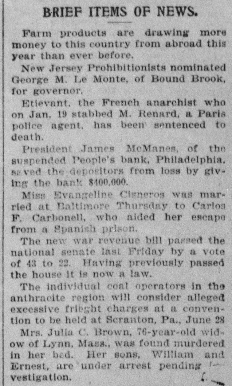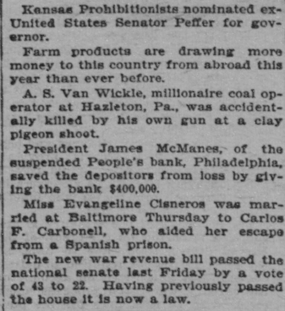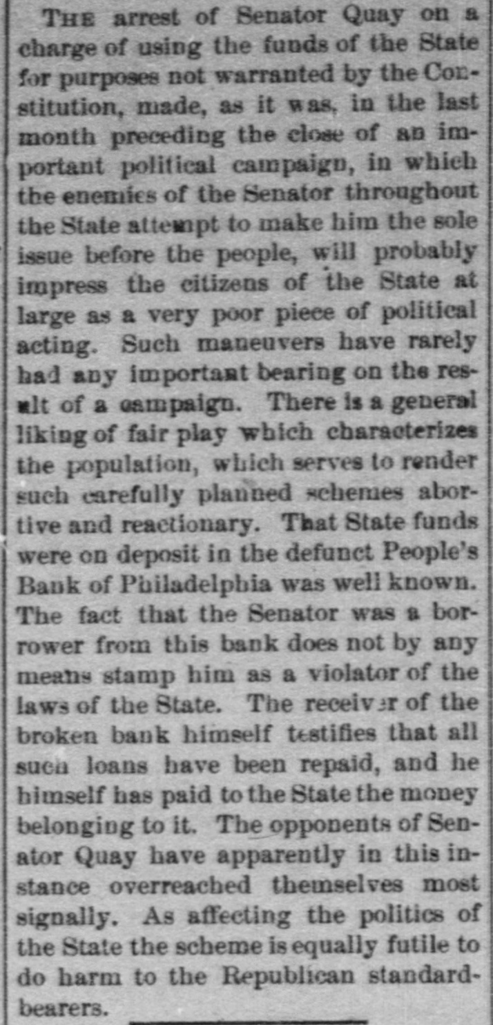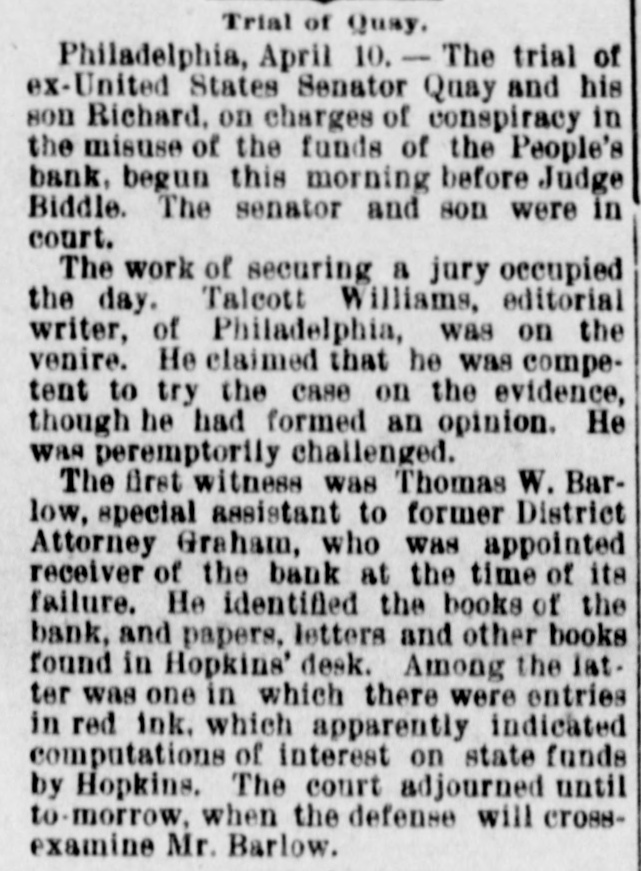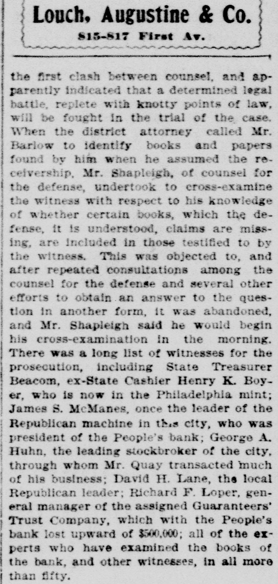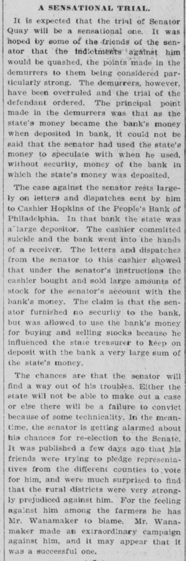 WILL PROTECT THEM. GUARANTOR'S VIRGINIA POLICYHOLDERS WILL NOT SUFFER. BE PAID OUT STATE DEPOSIT. Treasurer Harman will Not Surrender the Fund Until Their Claims Are Satisfied-A Suicide and an Arrest. The developments and disclosures made the connection with the failure of People's In Bank, of Philadelphia, on March 25th. involving. as they do, the Guaran- headtors' Finance Company, which has folquarters in the same city, have been the lowed with close interest here by numerous clients of the Guarantors' of Liability and Indemnity Company, abPennsylvania, which was recently morbed by the Finance Company The local agents for the Liability Comwere Messrs. Pleasants and Crenpany shaw, who stated yesterday afternoon that they had done little of no business and for the company since October last, that the liability in this city would hardly by exceed $7,000, fully secured, however, $25,000 deposited by the old company, with with Treasurer Harman, in accordance the State law regarding foreign corporations. Among the firms which have claims the company are the Chesapeake RichRailway Company, Traction Company, and and mond against Ohio the the on Rich- the mond Cedar-Works. An attempt recover of the Finance Company to the part these bonds has been frustrated them by to State Treasurer, who will hold desatisfy the claims of the Virginia inpositors, some of whom have already in the stituted suits, which have resulted Crenshaw appointment of Mr. Charles S. in RS receiver for the Finance Company this State. DRAMA WITH MONEY MOTIF. story which has come to light named as The result of the failure of the above its bank, a unfolds a drama with money in as its motif, a drama which embraces and of catastrophe the passion of grief the vengeance. In this modern drama husband, are three. First, a second, the the a demanding vengeance for characters suicide; the first, widow, woman weeping on bethird-the man whom that ruined her husband and caused of lieves to take his life. On all the spirit It him for money grains satirically. late is desire the story of John S. Hopkins, widow- the Bank cashier, of his RichPeople's week ago his wife-and of until F. a Loper, promoter and general man- Comard ager of the Guarantors' Finance pany. Before Mr. Hopkins sent the bullet career into brain that ended his earthly his penned a letter to his wife and daugh- Loper he ters. Briefly this letter charges with Hopkins's downfall. He (Hopkins) the Guartwo years ago had loaned securities some antors-Loper Company some them the bank. He could not get would of but, hoping that the tide eventually back, turn, hé then began loaning them the bank's money to keep and afloat. them The tide never turned. Deeper indebted the Guarantors became after deeper the People's Bank, and as dollar bank to was thus thansferred, the dollar weaker and weaker. In this manner collategrew $790,000 of the bank's money and Comrals passed over to the Guarantors' consideraThe securities given in wellpany. tion for this sum are said to be night worthless. LETTER TO HIS WIFE. Harassed, weighed down by a burden overhad become heavier than his could strained that nerves and overtaxed brain but John S. Hopkins killed himself, letter bear, before dying he wrote the following is an his wife and daughters, which which appeal to for pity and for mercy, and clearly reflects his character: "My Dear, Devoted, Loving Wife and on Daughters, For months I have been the verge of insanity from trouble at bank. the After my first sleep of exhaustion fought the balance of the night of have through praying to God to get me out my trouble, but it was of no avail. "I, some two years ago, let the Guarantors-Loper Company have some securi- them of the bank, and could not get back, ties and then from that I had to loan money to keep them afloat, and could my them was in the lion's mouth and I has hand get it out. The only thing that tide not me alive was the hope that the would kept turn with them and I could get can the securities back, but now I see it never be, and I cannot bear this pressure on my brain any longer. "I say to you this and swear it before Almighty God never, from December 20. until this moment, have I on my family, my or 1869, dollar house, ever and spent mine my A yelf that was not earned by me the spend. I have to leave you to to nercy of a loving God. "Lovingly, HUSBAND AND PAPA. March 24, 1898. On Monday afternoon Richard F. Toper, of rice-president and general manager arrested Finance Company, was dethe charged with conspiracy to cheat and the People's Bank, whose president its !raud has agreed to pay in full the claims of