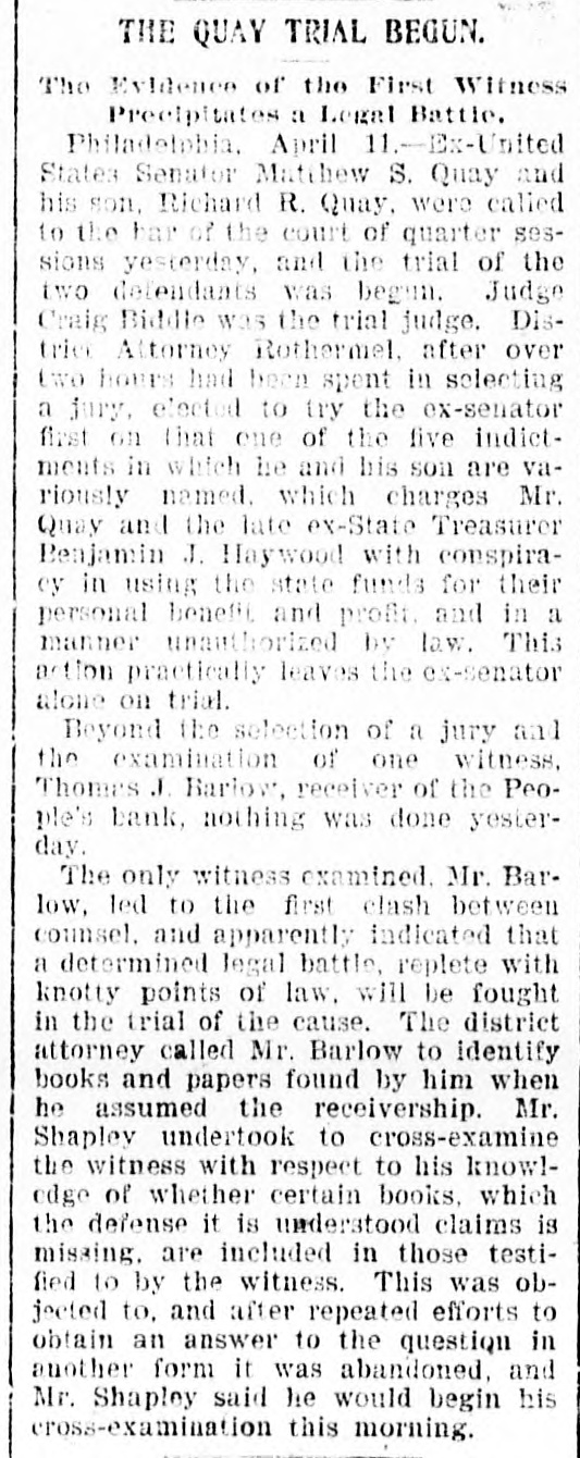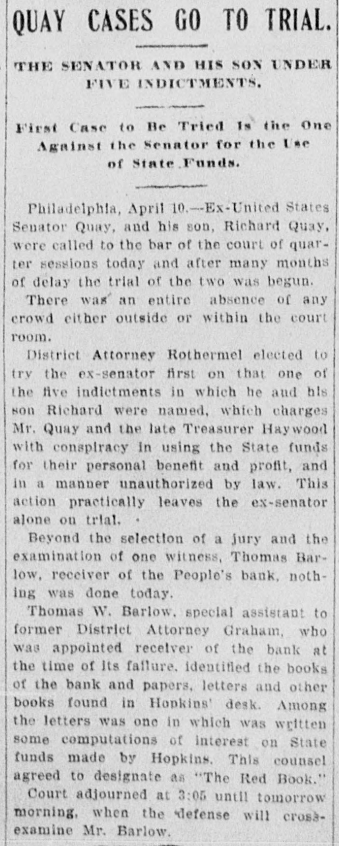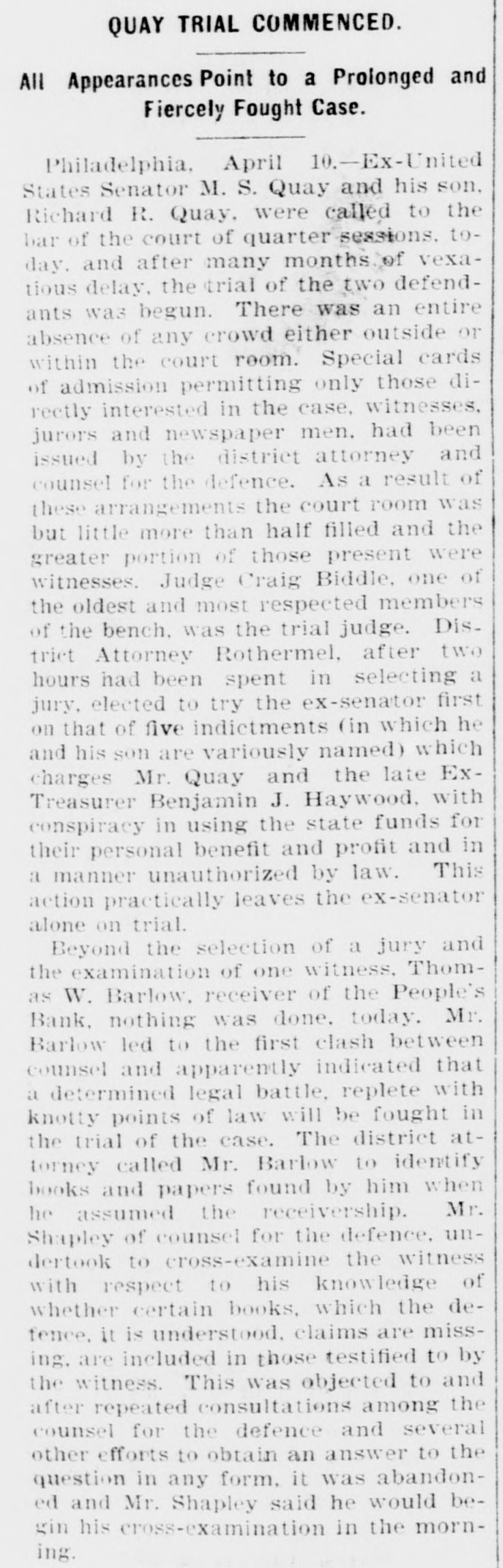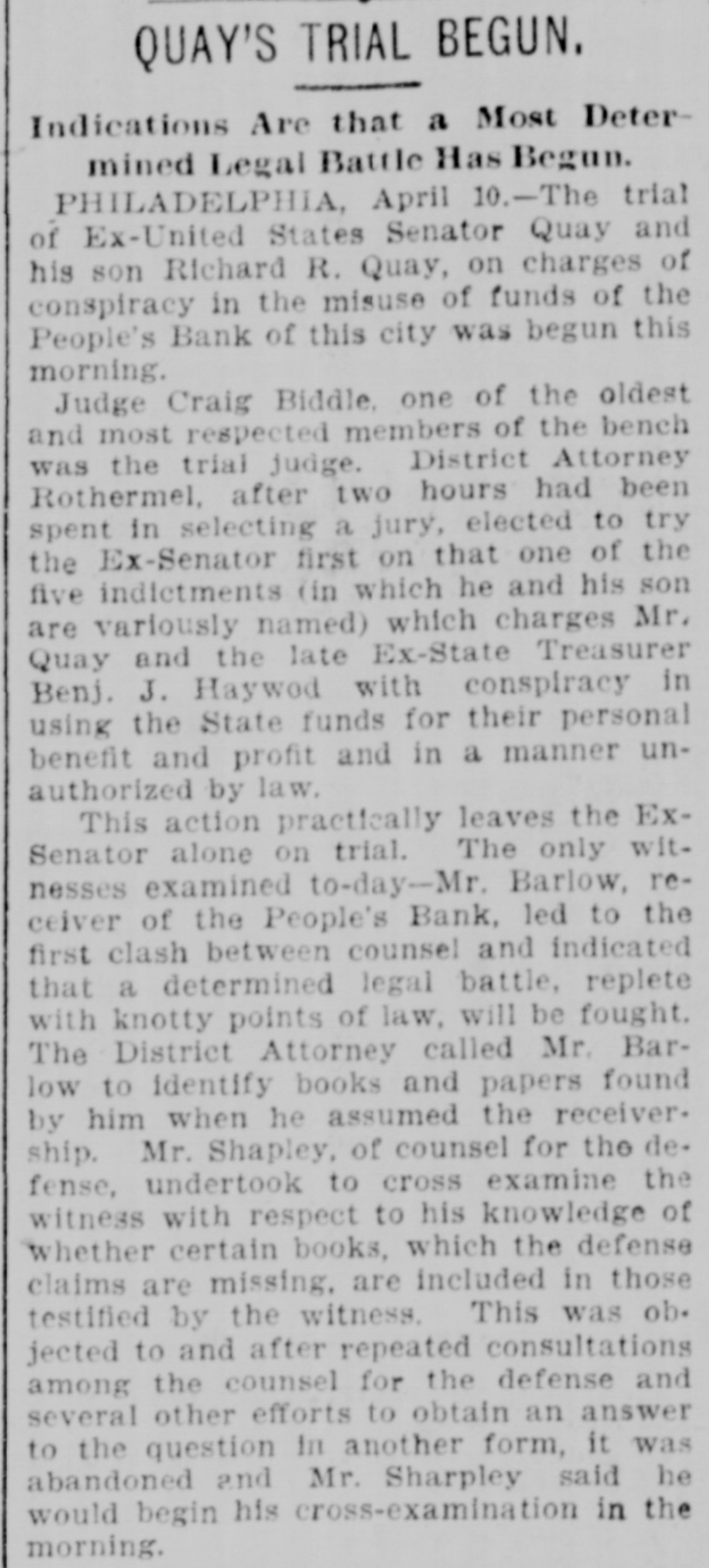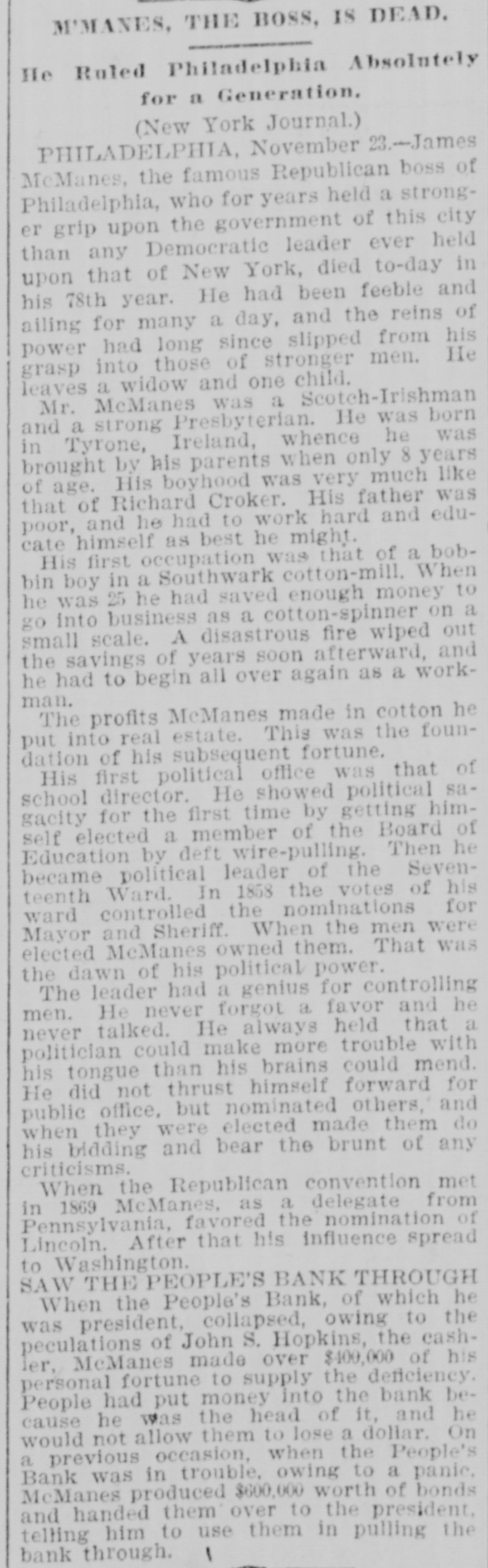 WILL PROTECT THEM. GUARANTOR'S VIRGINIA POLICYHOLDERS WILL NOT SUFFER. BE PAID OUT STATE DEPOSIT. Treasurer Harman will Not Surrender the Fund Until Their Claims Are Satisfied-A Suicide and an Arrest. The developments and disclosures made the connection with the failure of People's In Bank, of Philadelphia, on March 25th. involving. as they do, the Guaran- headtors' Finance Company, which has folquarters in the same city, have been the lowed with close interest here by numerous clients of the Guarantors' of Liability and Indemnity Company, abPennsylvania, which was recently morbed by the Finance Company The local agents for the Liability Comwere Messrs. Pleasants and Crenpany shaw, who stated yesterday afternoon that they had done little of no business and for the company since October last, that the liability in this city would hardly by exceed $7,000, fully secured, however, $25,000 deposited by the old company, with with Treasurer Harman, in accordance the State law regarding foreign corporations. Among the firms which have claims the company are the Chesapeake RichRailway Company, Traction Company, and and mond against Ohio the the on Rich- the mond Cedar-Works. An attempt recover of the Finance Company to the part these bonds has been frustrated them by to State Treasurer, who will hold desatisfy the claims of the Virginia inpositors, some of whom have already in the stituted suits, which have resulted Crenshaw appointment of Mr. Charles S. in RS receiver for the Finance Company this State. DRAMA WITH MONEY MOTIF. story which has come to light named as The result of the failure of the above its bank, a unfolds a drama with money in as its motif, a drama which embraces and of catastrophe the passion of grief the vengeance. In this modern drama husband, are three. First, a second, the the a demanding vengeance for characters suicide; the first, widow, woman weeping on bethird-the man whom that ruined her husband and caused of lieves to take his life. On all the spirit It him for money grains satirically. late is desire the story of John S. Hopkins, widow- the Bank cashier, of his RichPeople's week ago his wife-and of until F. a Loper, promoter and general man- Comard ager of the Guarantors' Finance pany. Before Mr. Hopkins sent the bullet career into brain that ended his earthly his penned a letter to his wife and daugh- Loper he ters. Briefly this letter charges with Hopkins's downfall. He (Hopkins) the Guartwo years ago had loaned securities some antors-Loper Company some them the bank. He could not get would of but, hoping that the tide eventually back, turn, hé then began loaning them the bank's money to keep and afloat. them The tide never turned. Deeper indebted the Guarantors became after deeper the People's Bank, and as dollar bank to was thus thansferred, the dollar weaker and weaker. In this manner collategrew $790,000 of the bank's money and Comrals passed over to the Guarantors' consideraThe securities given in wellpany. tion for this sum are said to be night worthless. LETTER TO HIS WIFE. Harassed, weighed down by a burden overhad become heavier than his could strained that nerves and overtaxed brain but John S. Hopkins killed himself, letter bear, before dying he wrote the following is an his wife and daughters, which which appeal to for pity and for mercy, and clearly reflects his character: "My Dear, Devoted, Loving Wife and on Daughters, For months I have been the verge of insanity from trouble at bank. the After my first sleep of exhaustion fought the balance of the night of have through praying to God to get me out my trouble, but it was of no avail. "I, some two years ago, let the Guarantors-Loper Company have some securi- them of the bank, and could not get back, ties and then from that I had to loan money to keep them afloat, and could my them was in the lion's mouth and I has hand get it out. The only thing that tide not me alive was the hope that the would kept turn with them and I could get can the securities back, but now I see it never be, and I cannot bear this pressure on my brain any longer. "I say to you this and swear it before Almighty God never, from December 20. until this moment, have I on my family, my or 1869, dollar house, ever and spent mine my A yelf that was not earned by me the spend. I have to leave you to to nercy of a loving God. "Lovingly, HUSBAND AND PAPA. March 24, 1898. On Monday afternoon Richard F. Toper, of rice-president and general manager arrested Finance Company, was dethe charged with conspiracy to cheat and the People's Bank, whose president its !raud has agreed to pay in full the claims of
