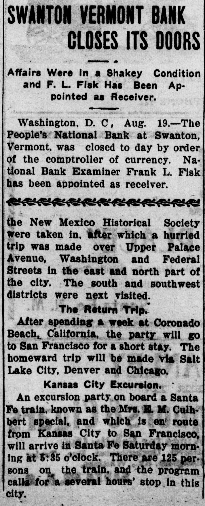 BANK BECOMES UNSAFE. Troubles of People's National at Swanton, Vt. St. Albans. Vt., Aug. 19.-The People's National Bank of Swanton, a small town 10 miles north of this city and near the Canadian border, did not open for business, today, its finances having been found to be in an unsafe condition. National Bank Examiner Frank L. Fish of Vergennes, who has been named as temporary receiver of the institution, was in charge of its affairs, this forenoon, but up to noon he had not made any statement except to say that the bank had been closed by order of the Washington authorities. The People's Bank did not do any extensive business, its capital amounting to but $50,000. It was patronized largely by the country people in the section of the state which is northeast of St. Albans. C. H. Sanborn was cashier. The deposits amount to less than $150,000 and the surat the last was as beplus The unimportant, suspension report although is regarded in June number here $500. of ing a St. Albans people are creditors. Examiner Fish has been in Swanton two or thr days making a thorough investigation et the books. and at its conclusion, last night, he decided that the list 01 the as sets was so unsatisfactory that the door of the concern should be closed. The comptroller of the currency was notified by telegraph of the situation and Mr. Fish was named as temporary receiver. The special cause of the trouble was the inability of officials to collect on a number of notes which were due and which we: held as collateral by the institution. T. prevalent opinion in Swanton is that all the creditors will be paid in full are many think the bank may resume atte a short period. A. J. Ferris of Swanto: is the president of the institution. Mr. Fish is one of the leading nation bank experts in New England. It Will he who detected the unsafe condition the Farmers' National Bank in his hom town. Vergennes, and caused the are of Cashier D. H. Lewis. He was made ceiver of the institution, a position h still holds. Mr. Fish was also appointed et receiver of the Packard National Bank Greenfield, Mass., a year or two ago. 11. completed the liquidation of its affairs in a comparatively short time. Washington, Aug. 19.-The People's Na tional bank at Swanton, Vt., was closed today. by order of the comptroller of the currency. National Bank Examiner Frank I.. Fish has been appointed receiver. The following is a statement of the resources and liabilities of the bank as shown by its last report of condition dated June 9. 1904: Resources: Loans and discounts. $106.412: overdrafts, $1352 U. S. bonds, $ 9.000; bonds. securities, etc., $42.252 real estate, $15,058; due from banks. $11,229; cash and cash items. $19,435 total. $258,380. Liabilities: Capital stock, $50,000; surplus and undivided profits, $493; circuiation, $50,000; deposits. $142,886; bills payable, $15,000; total, $258,380.