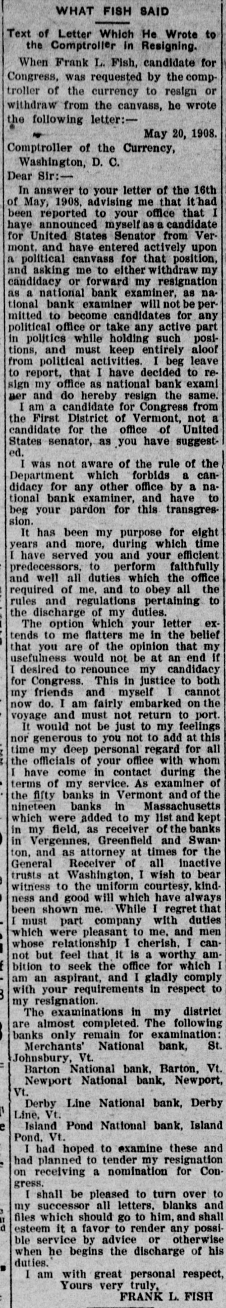 WHAT FISH SAID Text of Letter Which He Wrote to the Comptroller in Resigning. When Frank L. Fish, candidate for Congress, was requested by the comptroller of the currency to resign or withdraw from the canvass, he wrote the following letter:May 20, 1908. Comptroller of the Currency, Washington, D. C. Dear Sir:In answer to your letter of the 16th of May, 1908, advising me that it had been reported to your office that I have announced myself as a candidate for United States Senator from Vermont. and have entered actively upon a political canvass for that position, and asking me to either withdraw my candidacy or forward my resignation as a national bank examiner, as national bank examiner will not be permitted to become candidates for any political office or take any active part in politics while holding such positions, and must keep entirely aloof from political activities. I beg leave to report, that I have decided to resign my office as national bank exami ner and do hereby resign the same. I am a candidate for Congress from the First District of Vermont, not a candidate for the office of United States senator, as you have suggested. I was not aware of the rule of the Department which forbids a candidacy for any other office by a national bank examiner, and have to beg your pardon for this transgression. It has been my purpose for eight years and more, during which time I have served you and your efficient predecessors, to perform faithfully and well all duties which the office required of me, and to obey all the rules and regulations pertaining to the discharge of my duties. The option which your letter extends to me flatters me in the belief that you are of the opinion that my usefulness would not be at an end If I desired to renounce my candidacy for Congress. This in justice to both my friends and myself I cannot now do. I am fairly embarked on the voyage and must not return to port. It would not be just to my feelings nor generous to you not to add at this time my deep personal regard for all the officials of your office with whom I have come in contact during the terms of my service. As examiner of the fifty banks in Vermont and of the nineteen banks in Massachusetts which were added to my list and kept in my field, as receiver of the banks in Vergennes, Greenfield and Swan ton, and as attorney at times for the General Receiver of all inactive trusts at Washington, I wish to bear witness to the uniform courtesy. kindness and good will which have always been shown me. While I regret that I must part company with duties which were pleasant to me, and men whose relationship I cherish, I cannot but feel that it is a worthy ambition to seek the office for which I am an aspirant, and I gladly comply with your requirements in respect to my resignation. The examinations in my district are almost completed. The following banks only remain for examination: Merchants' National bank, St. Johnsbury, Vt. Barton National bank, Barton, Vt. Newport National bank, Newport, Vt. Derby Line National bank, Derby Line, Vt. e Island Pond National bank, Island Pond, Vt. I had hoped to examine these and had planned to tender my resignation on receiving a nomination for Congress. I shall be pleased to turn over to my successor all letters, blanks and files which should go to him, and shall d esteem it a favor to render any possible service by advice or otherwise when he begins the discharge of his duties. I am with great personal respect, Yours very truly, FRANK L FISH