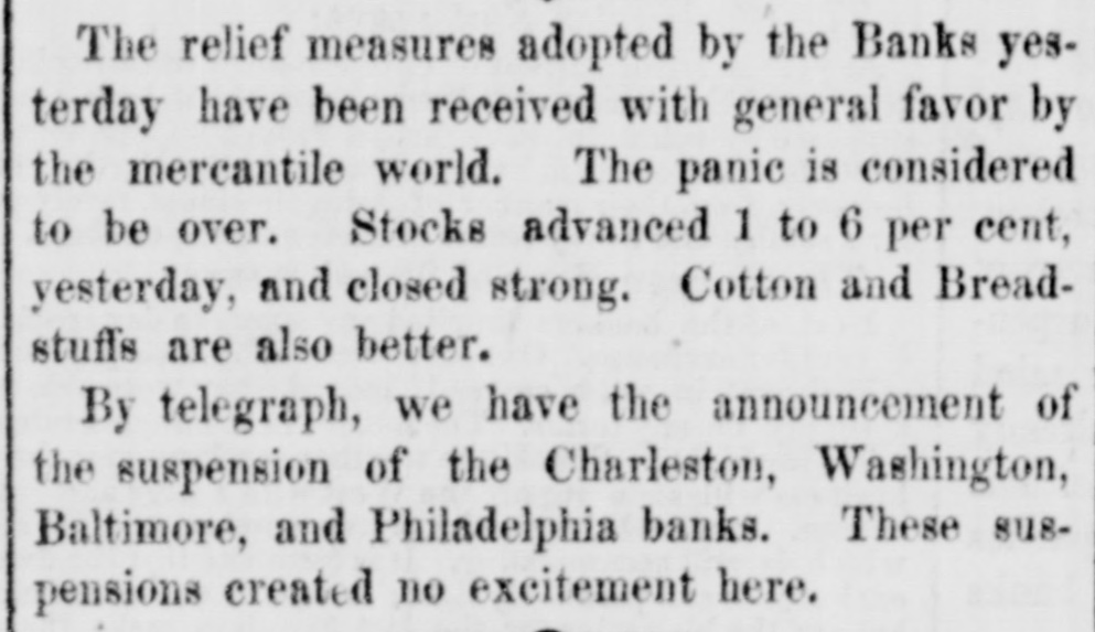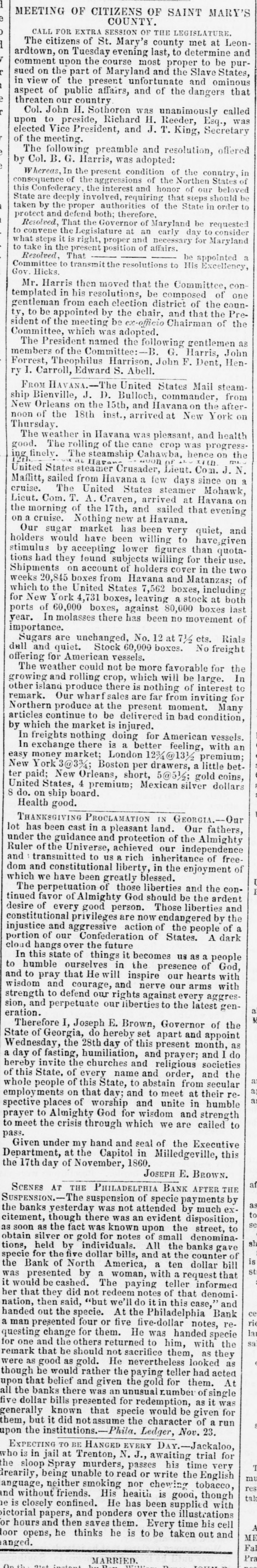 OF CITIZENS OF SAINT MARY'S COUNTY. R EXTRA SESSION OF THE LEGISLATURE. ens of St. Mary's county met at Leonni Tuesday evening last, to determine and pon the course most proper to be pur: part of Maryland and the Slave States, the present unfortunate and ominous public affairs, and of the dangers that r country n H. Sothoron was unanimously called preside, Richard H. Reeder, Esq., was e President, and J. T. King, Secretary ting. wing preamble and resolution, offered G. Harris, was adopted: In the present condition of the conntry, in of the aggressions of the Northen States of racy, the interest and honor of our beloved eply involved, requiring that steps should be proper authorities of the State in order to defend both; therefore, That the Governor of Maryland be requested he Legislature at an early day to consider is right, proper and necessary for Maryland e present position of affairs. That be appointed a o transmit the resolutions to His Excellency, is then moved that the Committee, conni his resolutions, be composed of one from each election district of the counpointed by the chair, and that the Pree meeting be ex-officio Chairman of the which was adopted. ident named the following gentlemen as the Committee: B. G. Harris, John eophilus Harrison, John F. Dent, Hen11, Edward S. Abell. VANA.-The United States Mail steamlle, J. D. Bulloch, commander. from s on the 15th, and Havanao the aftere 18th inst., arrived at New York on her in Havana was pleasant, and health SUM do.10 outo the Jo rolling F The steamship Cahawba, hence on the UIII 10 Unon " no tes steamer Crusader, Lieut. Com. J. N. ed from Havana a few days since on a he United States steamer Mohawk, uo HAVAN 18 arrived Crasent 'V L : g of the 17th, and sailed that evening Nothing new at Havana. ar market has been very quiet, and ould have been willing to have,given y accepting lower figures than quotahey found subjects willing for their use. on account of holders cover in the two 5 boxes from Havana and Matanzas; of e United States 7,562 boxes, including rk 4,731 boxes, leaving a stock at both 0,000 boxes, against 80,000 boxes last nolasses there has been no movement of re unchanged, No. 12 at 7½ ets. Rials uiet. Stock 60,000 boxes. No freight American vessels. her could not be more favorable for the d rolling crop, which will be large. In produce there is nothing of interest to ur wharf sales are far from inviting for roduce at the present moment. Many tinue to be delivered in bad condition, he market is injured. ts nothing doing for American vessels. age there is a better feeling, with an market; London 123/4@13½ premium; 3@33/4; Boston per drawers, a little betTew Orleans, short, 5@5½)/2; gold coins, tes, 4 premium; Mexican silver dollars board d) 'poc VING PROCLAMATION IN GEORGIA.-Our ni cast in a pleasant land. Our fathers, uidance and protection of the Almighty ) Universe, achieved our independence nitted to us a rich inheritance of freenstitutional liberty, in the enjoyment of ave been greatly blessed. etuation of those liberties and the conr of Almighty God should be the ardent very good person. Those liberties and al privileges are now endangered by the d aggressive action of the people of a ur Confederation of States. A dark over the future peeple E SE sn becomes 7! things Jo the ourselves in the presence of God, that He will inspire our hearts with d courage, and nerve our arms with defend our rights against every aggres0 rpetuate our liberties to the latest genI, Joseph E. Brown, Governor of the orgia, do hereby set apart and appoint the 28th day of this present month, as ting, humiliation, and prayer; and I do te the churches and religious societies . of every name and order, and the E e of this State, to abstain from secular E s on that day; and to meet at their reU ces of worship and unite in humble mighty God for wisdom and strength crisis through which we are called to ler my hand and seal of the Executive , at the Capitol in Milledgeville, this of November, 1860. JOSEPH E. BROWN. at r THE PHILADELPHIA BANK AFTER THE -The suspension of specie payments by B sterday was not attended by much ex-