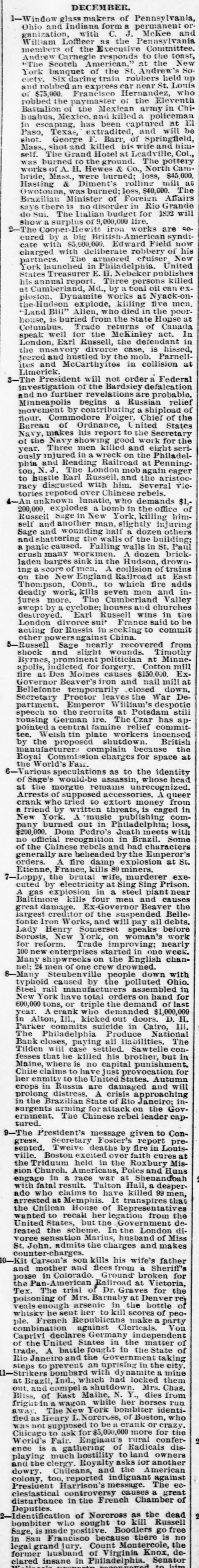 DECEMBER. 1-Window glass makers of a Pennsylvania, permanent or ganization, Ohio and Indiana with form C. J. McKee and the Pennsylvania William Loffleer Executive as Committee. members Andrew Carnegie of the responds at to the the toast, New "The Scotch American, the St. Andrew's SoYork banquet of train robbers held up clety. Six daring car near St. Louis and robbed an express Hernandez, who of $75,000 Francisco of the Eleventh robbed the paymaster Mexican army in ChiBattalion of the and killed a policeman huabua, Mexico. been captured at El in escaping, has and will be Paso, Texas, extradited, F. Barr, of Springfield, shot. George killed his wife and himMass., shot and at Leadville, Col., self. The Grand Hotel ground. The pottery was burned to the & Co., North Camworks of A. H. Hewes burned; loss, $45,000. bride, Mass., were rolling mill at Hasting & Diment's burned; loss, $40,000. The Owotonna, was of Foreign Affairs Brazilian Minister disorder in Rio Grande of a show surplus do says Sui. there The is Italian no 000,000 budget lire. for 1832 will seare works 2-The Cooper-He British iron American syndicured by a $5,000,000. big Edward Field now cate with deliberate robbery of his charged with armored cruiser New partners. The in Philadelphia. United York launched E. H. Nebeker publishes States Treasurer Three persons killed his annual report Md., by a toal oil can exat Cumberland, works at Nyack-onplosion. Dynamite killing five men. the-Hudson explode, who died in the poorLand Bill" buried Allen, from the State House at house, is Trade returns of Canada Columbus the McKinley act. In London, speak well Earl for Russell, the defendant in is case, hissed, the unsa divorce by the mob. Parnelljeered ites and and McCarthyites hustled in collision at Limerick. President will not order a Federal -The restigation of the Bardsley defalcation and no further revelations a Russian are probable. relief Minneapolis by begins contributing a shiploud of movement flour. Commodore Folger, United Chief States of the Bureau makes of Ordnance, his report to the Secretary Navy, Navy showing good work for the of the men killed and eight seriyear. injured Three in a wreck on the Philadelously Reading Railroad at Penningphis and The London mob again eager ton, N.J. Earl Russell, and the aristocto hustle disgusted with him. Several vicracy repoted over Chinese rebels. tories unknown lunatic, who demands $1.An explodes a bomb in the office of 200,000 in New York, killing himself Russell and Sage another man, half slightly a dozen others juring Sage and wounding the walls of the uilding; a panic and shattering caused. Falling walls in St. Paul A brickdozen crush many workmen. sink in the Hudson, drownladen barges A coilision of trains ing a score of men. England Railroad at East on the New Conn., to which fire adds Thompson, kills seven men and indeadly work, The Cumberland Valley jures more. houses and churches swept by a cyclone; Earl Russell wins in the destroyed. suit France said to be for acting London divorce Russia in seeking to commit China. other powers against nearly recovered from Russell Sage slight wounds. Timothy shock and politician at MinneByrnes, prominent forgery. Cotton mill apolis, indicted for causes $150,000 ExGovernor fire at Des Beaver's Moines iron and closed nail mill down. at Bellefonte temporarily leaves the War DeSecretary Proctor William's despotic partment. Emperor recruits at Potsdam still speech to the ire. The Czar has aprousing German famine relief commitpointed central incensed tee. Weish tin plate shutdown. workers British by the proposed complain because the Royal nufacturers Commission charges for space at the World's Fair. as to the identity 6 -Various speculations head of Sage's would-be remains assassin, unrecognized. whose at the morgue supposed accessories. A queer Arrests who of tried to extort money from a crank friend by written threats, is caged in compublishing New York. A music Philadelphia; loss, Dom $200,000. pany burned out Pedro's in death meets with Some Brazil. no official recognition and in had characters are generally of the Chinese beheaded rebels by the Emperor's at St. damp explosion orders. Etienne, France, A fire kills 80 miners. wife, murderer exe7-Loppy, the brutal at Sing Sing Prison. A gas cuted by explosion electricity in a steel plant near and men causes Baltimore kills Ex-Governor four Beaver the great damage. of the suspended Bellelargest fonte Iron creditor Works, and will speaks pay all before debts. Lady Henry York, Somerset on woman's work in one Sorosis, for reform. New Trade improving; nearly week. Many 100 new shipwrecks enterprises on started the English channel: 24 men of one crew people drowned. down with 8-Many typhoid Steubenville caused by the polluted assembled Ohio. in Steel rail manufactur orders on hand for New York have total the demand of last 600,000 tons, or triple demanded $1,000,000 year A crank who kicked out doors. D. H. Parker in Alton, commits Ill., suicide in Cairo, III. The Philadelphia all Produce liabilities. National The Bank closes, paying settled. Sawtelle confesses Tilden that will he case killed his brother, but in Maine, where is no capital provocation punishment. for Chile claims to have United just States. Autumn in crops her enmity Russia to the are damaged and will A crisis distress. prolong approaching in the of Rio inBrazilian State Janeiro; the on Govattack erninent. surgents arming The Chinese for rebel leader cap9-The tured. President's message Foster's given report to Con- preover gress. sented. Secretary Twelve deaths by faith fire in cures Louis- at the ville. Triduum Boston held excited in the Roxbury MisPoles and Huns sion Church. Americans, race war at Shenandoah engage fatal in result. a Talton Hall, a desperwith claims to have killed 99 men, ado who Memphis. It transpires that her arrested the Chilean at House of Representative from the legation wanted States, to recall but the Government deU