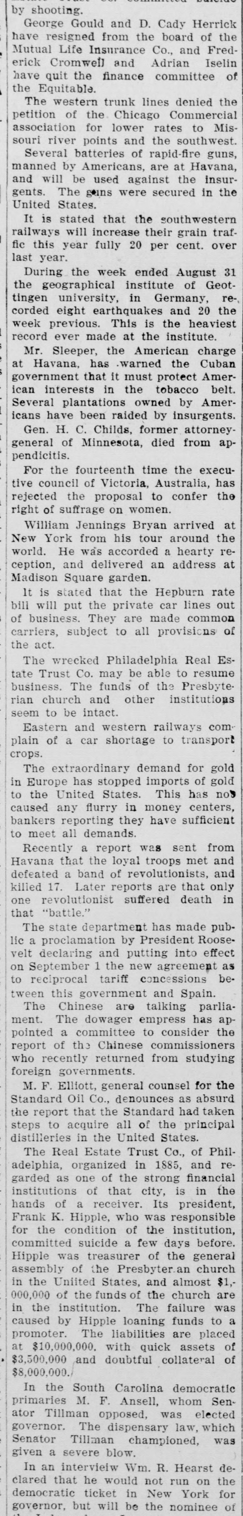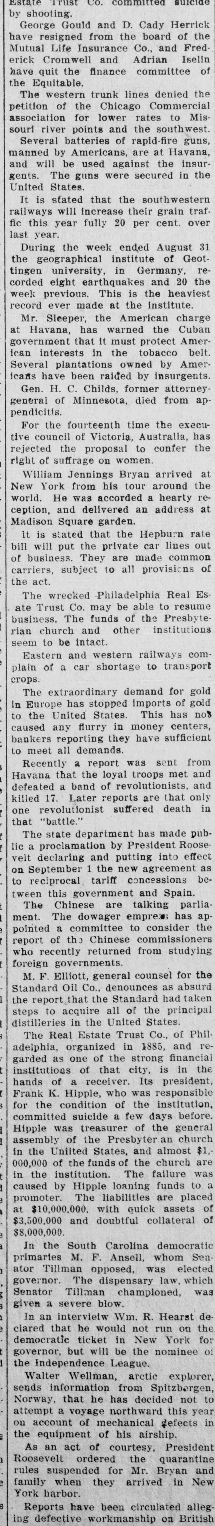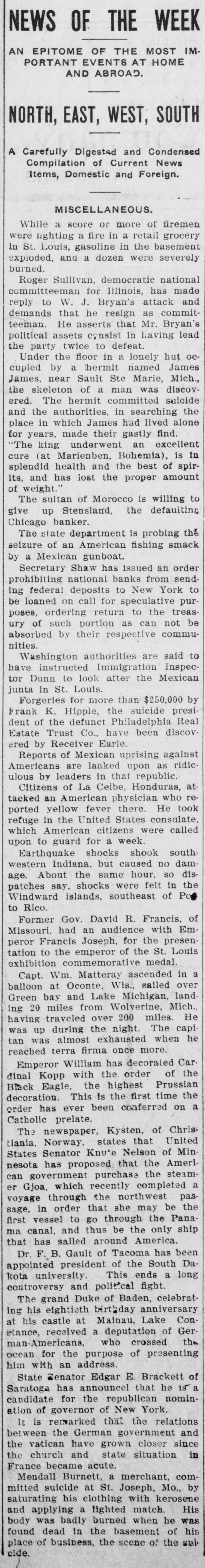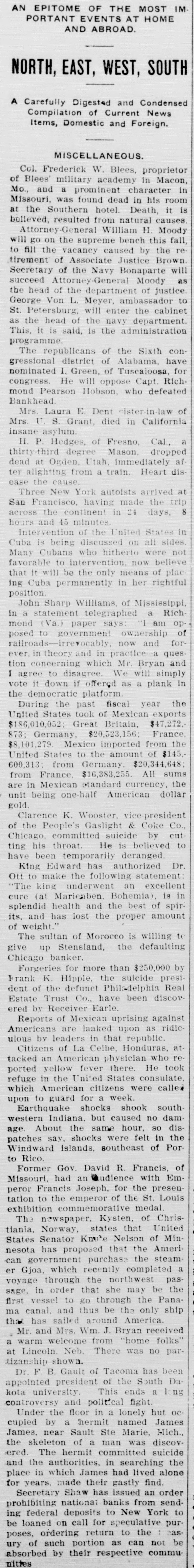 NORTH, EAST, WEST, SOUTH A Carefully Digested and Condensed Compilation of Current News Items, Domestic and Foreign. MISCELLANEOUS. Col. Frederick W. Blees, proprietor of Blees' military academy in Macon, Mo., and a prominent character in Missouri, was found dead in his room at the Southern hotel. Death, it is believed, resulted from natural causes. Attorney-General William H. Moody will go on the supreme bench this fall, to fill the vacancy caused by the re tirement of Associate Justice Brown. Secretary of the Navy Bonaparte will succeed Attorney-General Moody as the head of the department of justice. George Von L. Meyer, ambassador to St Petersburg, will enter the cabinet as the head of the navy department. This, it is said, is the administration programme. The republicans of the Sixth congressional district of Alabama, have nominated I. Green, of Tuscaloosa, for congress. He will oppose Capt. Richmond Pearson Hobson. who defeated Bankhead. Mrs. Laura E. Dent lister-in-la of Mrs. U. S. Grant, died in California insane asylum. a H. P. Hedges, of Fresno, Cal. thirty-this degree Mason. dropped dead at Ogden. Utah, immediately af ter alighting from a train. Heart dis ease the cause Three New York autoists arrived at San Francisco, having made the trip 8 across the continent in 24 days, hours and 45 minutes. Intervention of the United States in Cuba is being discussed on all sides. Many Cubans who hitherto were not favorable to intervention now believe that it will be the only means of placing Cuba permanently in her rightful position John Sharp Williams, of Mississippi, in a statement telegraphed a Richmond (Va.) paper says I am opposed to government ownership of rallroads-irrevocably, now and forever. in theory and in practice--a question concerning which Mr. Bryan and I agree to disagree. We will simply vote it down if offered as a plank in the democratic platform During the past fiscal year the United States took of Mexican exports $186,010,052; Great Britain, $47,272. 873; Germany, $20,523,156 France, $8,101,279 Mexico imported from the United States to the amount of $145. 600,313; from Germany, $20,344,648; from France. $16,383,255. All sums are in Mexican standard currency, the unit being one-half American dollar gold. Clarence K. Wooster, vice -president of the People's Gaslight & Coke Co., Chicago, committed suicide by cutting his throat. He is believed to have been temporarily deranged. King Edward has authorized Dr. Ott to make the following statement The king underwent an excellent cure (at Marienben. Bohemia), is in splendid health and the best of spirits. and has lost the proper amount of weight." The sultan of Morocco is willing to give up Stensland, the defaulting Chicago banker. Forgeries for more than $250,000 by Frank K. Hipple, the suicide president of the defunct Philadelphia Real Estate Trust Co., have been discovered by Receiver Earle. Reports of Mexican uprising against Americans are laaked upon as ridiculous by leaders in that republic. Citizens of La Ceibe, Honduras, attacked an American physician who reported yellow fever there. He took refuge in the United States consulate which American citizens were called upon to guard for a week. Earthquake shocks shook southwestern Indiana. but caused no damage. About the same hour. so dispatches say. shocks were felt in the Windward islands. southeast of Porto Rico. Former Gov. David R. Francis, of Missouri. had an audience with Emperor Francis Joseph, for the presentation to the emperor of the St. Louis exhibition commemorative medal. The newspaper, Kysten, of Christiania, Norway, states that United States Senator Knote Nelson of Minnesota has proposed that the American government purchase the steamer Gjoa, which recently completed a voyage through the northwest passage. in order that she may be the first vessel to go through the Panama canal. and thus be the only ship that has sailed around America. Mr. and Mrs. Wm. J. Bryan received a warm welcome from "home folks" at Lincoln Neb. There was no partizanship shown. Dr. F. B. Gault of Tacoma has been appointed president of the South Dakota university. This ends a long controversy and political fight. Under the floor in a lonely hut occupied by a hermit named James James. near Sault Ste Marie, Mich., the skeleton of a man was discovered. The hermit committed suicide and the authorities. in searching the place in which James had lived alone for years. made their gastly find. Secretary Shaw has issued an order prohibiting national banks from sending federal deposits to New York to be loaned on call for speculative purposes, ordering return to the 1 easury of such portion as can not be absorbed by their respective commu-
