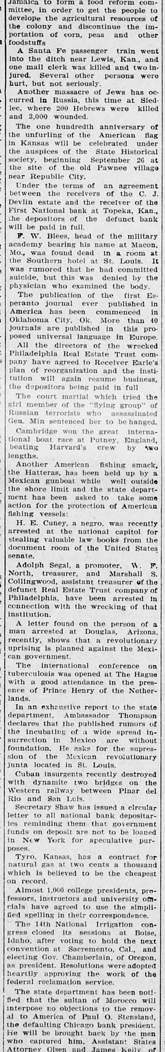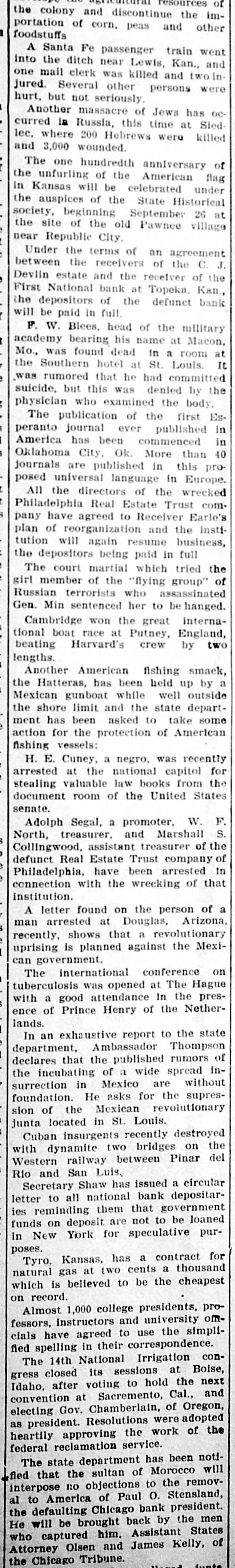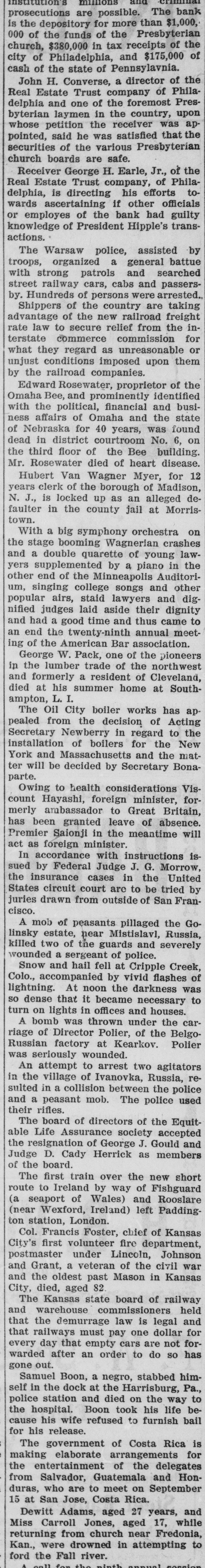and acrimina institution's minons The bank prosecutions the depository are for possible. more Presbyterian than $1,000, the funds of of Philadelphia, and church, city 000 is of of $380,000 in tax the Pennsylavnia. receipts $175,000 the the of of the state of of cash John H. Converse, a director of PhilaEstate Trust company foremost Presdelphia byterian Real and laymen one the of in the the receiver country, was upon apwhose petition satisfied that the securities of the pointed, said he was various Presbyterian church boards are safe. of the Receiver George H. company, Earle, Jr., of PhilatoEstate Trust his efforts delphia, Real is directing if other officials wards ascertaining of the bank had guilty transknowledge or employes of President Hipple's by actions. Warsaw police, general assisted battue and troops, The strong organized patrols a and searched passerswith street railway cars, cabs were arrested. by. Hundreds of of the persons country are freight taking rate law to advantage Shippers of the new relief railroad from the interstate commerce secure as commission unreasonable for or railroad what unjust they conditions regard companies. imposed upon of them the by the Rosewater, proprietor identified of Omaha Edward Bee, and prominently financial and state busiwas with the political, Omaha and the found ness Nebraska affairs for 40 years, No. 6, on of in district courtroom Bee building. dead the third Rosewater floor of died the of heart Myer, disease. for 12 Mr. Hubert Van Wagner of Madison, clerk of the borough alleged defaulter years N. J., is in locked the county up as jail an at Morrison town. a big symphony orchestra crashes With booming Wagnerian lawthe quarette in and stage a double by a of piano young Auditori- the yers supplementslinneapolis the and other other end of songs digum, singing college staid lawyers and popular laid aside came an end the nified a good time and annual and had judges airs, twenty-ninth association. thus their dignity meet- to ing George of the W. American Pack, one Bar of of the the northwest pioneers the lumber trade of Cleveland, died at his and in formerly summer a resident home at SouthapL. I. works has ampton, The Oil from City the boiler decision regard of Acting to the pealed Newberry in for the New ter installation Secretary Massachusetchetary of boilers and the Bona- matYork will and be decided by Visparte. health considerations minister, forOwing Hayashi, to foreign Great Britain, count ambassador leave to of absence. will has merly been granted in the meantime In Premier foreign Saionji minister. isinstructions act as accordance with Judge J. G. Morrow, United sued by Federal cases in to the be tried by juries the States insurance drawn circuit from court outside are of San Franthe Gocisco. linsky A mob estate, of peasants near guards pillaged and severely Russia, killed two of the of police. Creek, the wounded Snow accompanied and a sergeant hail fell by at vivid Cripple darkness flashes was of to lightning. Colo., dense that At in it noon offices became and necessary houses. the carso on lights under Belgoriage turn A bomb of Director was thrown at Polier, Kearkov. of the Polier agitators Russian seriously factory wounded. two was attempt to Ivanovka, arrest Russia, reAn village of between the police peasant sulted in the in a collision mob. The police used Equitand their a rifles. of directors society of the accepted and The board Assurance J. Gould Judge D. board. able the resignation Life Cady of Herrick George as members new short of The the first train by over way the of Fishguard Rooslare route to Ireland of Wales) and left Padding(a seaport Wexford, Ireland) ton (near station, Francis London. Foster, fire chief department, of Johnson Kansas Col. volunteer Lincoln, war City's first under of the civil postmaster Grant, a veteran past Mason in Kansas and and the died, oldest aged state 82 board of railway held City, The Kansas commissioners is and and that the warehouse demurrage must pay law one are dollar not has for- for warded that every railways day after that an empty order cars to stabbed do so him gone out. Samuel Boon, dock at a negro, the died Harrisburg, on the way Pa., be- to self in the and his life bail cause release. of the police hospital. his station wife Boon refused took to Costa furnish Rica is for for his government arrangements delegates making The tertainmenutemala elaborate of the September and Honfrom are Rica. the Salvador, to meet on and duras, who Jose, Costa 27 years, while 15 at San Adams, aged aged 17, Fredonia, Kan., ford the were Fall river. ninth annual all earth Miss returning Dewitt Carroll from drowned Jones, church in near attempting cassion to