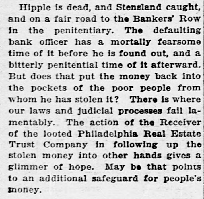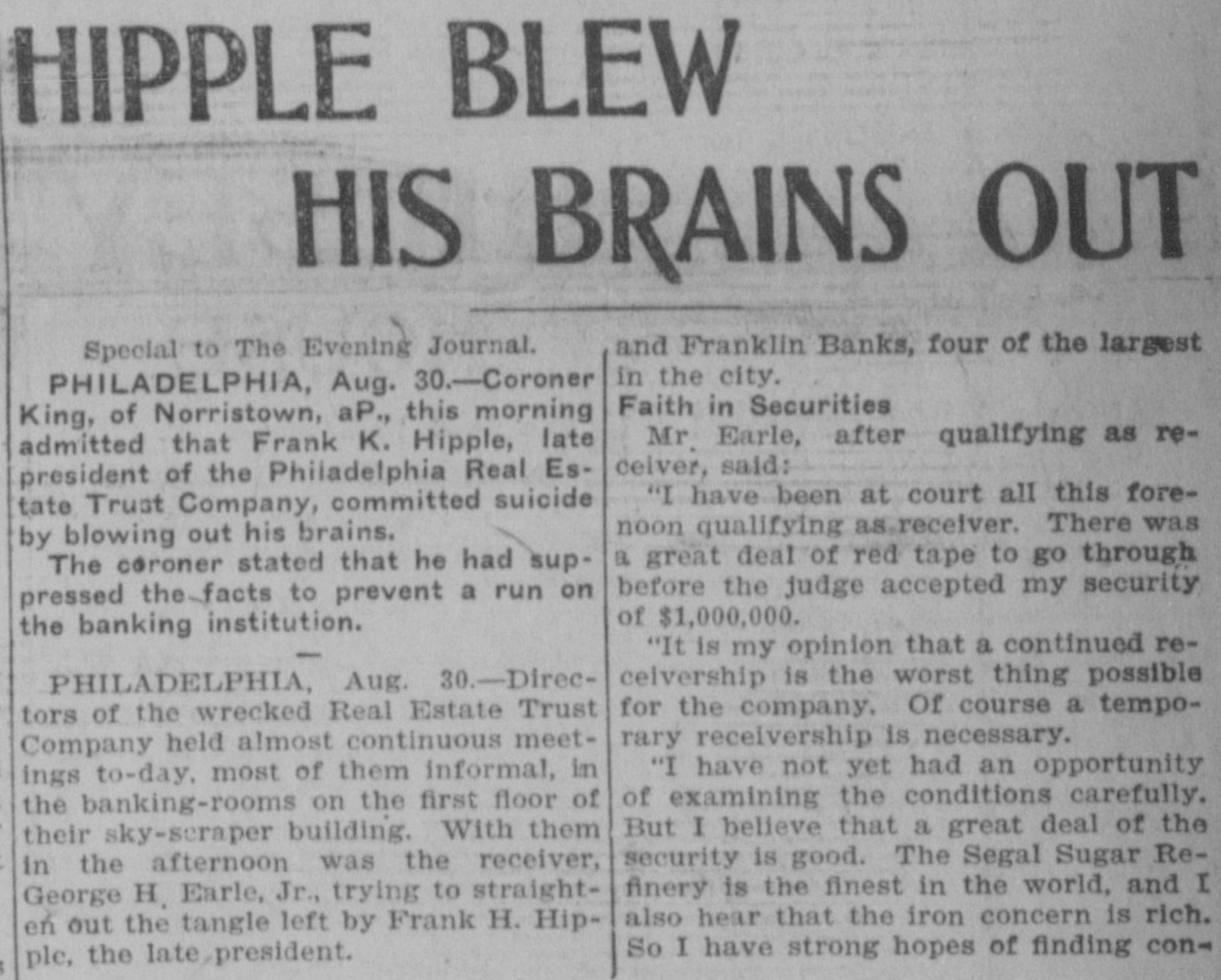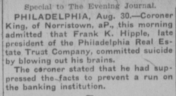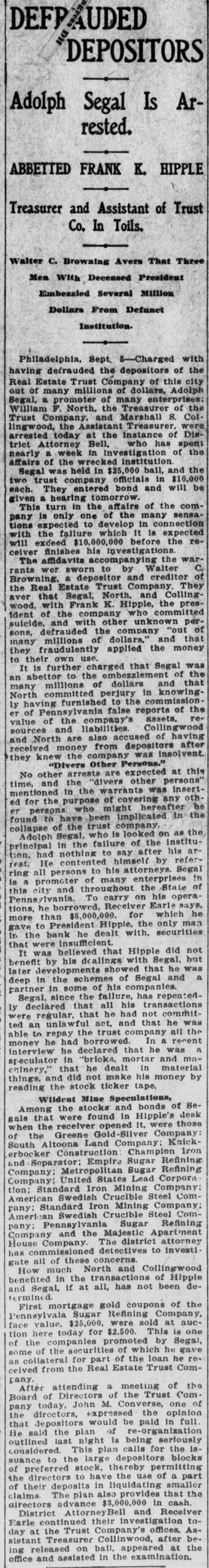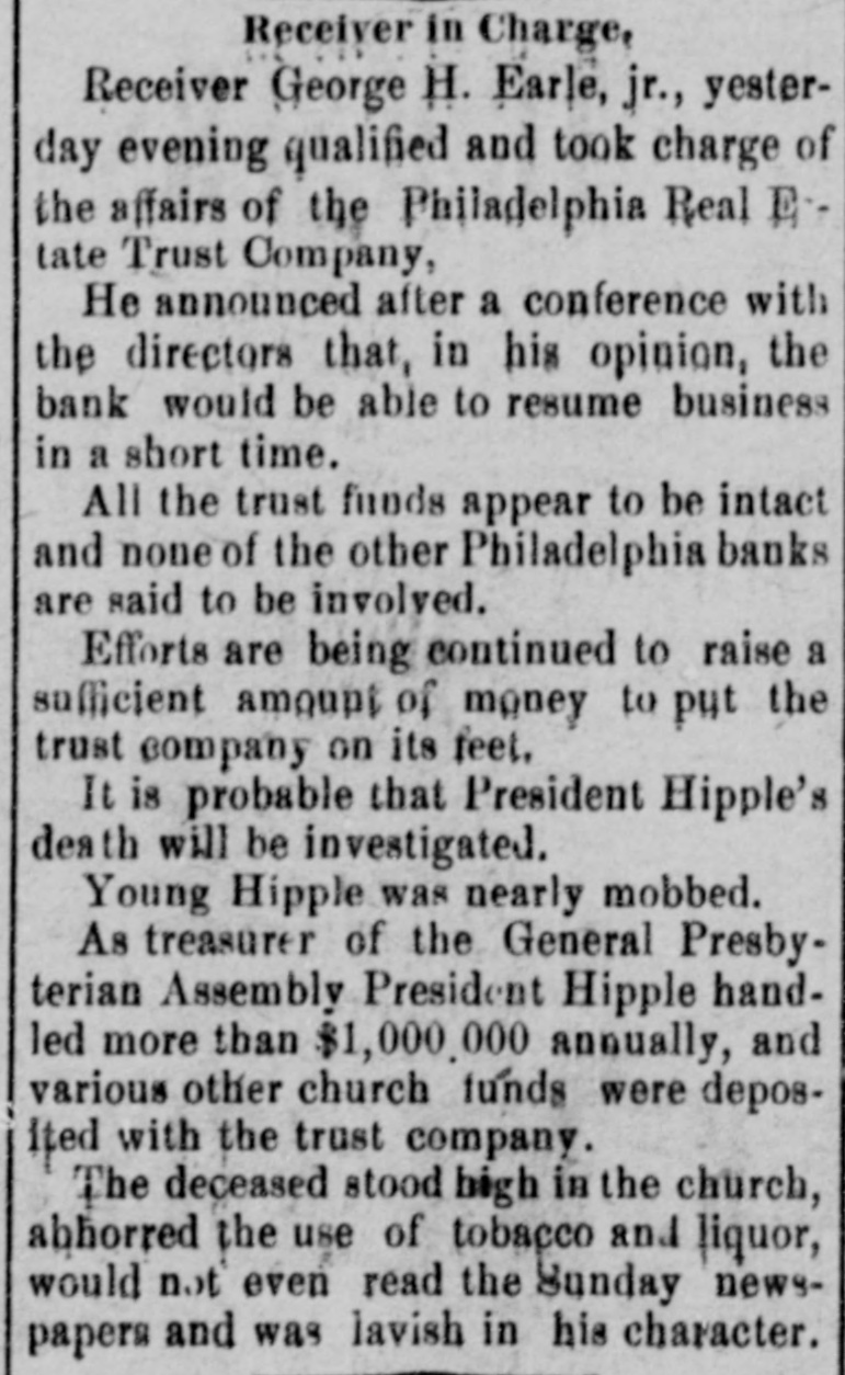 and acrimina institution's minons The bank prosecutions the depository are for possible. more Presbyterian than $1,000, the funds of of Philadelphia, and church, city 000 is of of $380,000 in tax the Pennsylavnia. receipts $175,000 the the of of the state of of cash John H. Converse, a director of PhilaEstate Trust company foremost Presdelphia byterian Real and laymen one the of in the the receiver country, was upon apwhose petition satisfied that the securities of the pointed, said he was various Presbyterian church boards are safe. of the Receiver George H. company, Earle, Jr., of PhilatoEstate Trust his efforts delphia, Real is directing if other officials wards ascertaining of the bank had guilty transknowledge or employes of President Hipple's by actions. Warsaw police, general assisted battue and troops, The strong organized patrols a and searched passerswith street railway cars, cabs were arrested. by. Hundreds of of the persons country are freight taking rate law to advantage Shippers of the new relief railroad from the interstate commerce secure as commission unreasonable for or railroad what unjust they conditions regard companies. imposed upon of them the by the Rosewater, proprietor identified of Omaha Edward Bee, and prominently financial and state busiwas with the political, Omaha and the found ness Nebraska affairs for 40 years, No. 6, on of in district courtroom Bee building. dead the third Rosewater floor of died the of heart Myer, disease. for 12 Mr. Hubert Van Wagner of Madison, clerk of the borough alleged defaulter years N. J., is in locked the county up as jail an at Morrison town. a big symphony orchestra crashes With booming Wagnerian lawthe quarette in and stage a double by a of piano young Auditori- the yers supplementslinneapolis the and other other end of songs digum, singing college staid lawyers and popular laid aside came an end the nified a good time and annual and had judges airs, twenty-ninth association. thus their dignity meet- to ing George of the W. American Pack, one Bar of of the the northwest pioneers the lumber trade of Cleveland, died at his and in formerly summer a resident home at SouthapL. I. works has ampton, The Oil from City the boiler decision regard of Acting to the pealed Newberry in for the New ter installation Secretary Massachusetchetary of boilers and the Bona- matYork will and be decided by Visparte. health considerations minister, forOwing Hayashi, to foreign Great Britain, count ambassador leave to of absence. will has merly been granted in the meantime In Premier foreign Saionji minister. isinstructions act as accordance with Judge J. G. Morrow, United sued by Federal cases in to the be tried by juries the States insurance drawn circuit from court outside are of San Franthe Gocisco. linsky A mob estate, of peasants near guards pillaged and severely Russia, killed two of the of police. Creek, the wounded Snow accompanied and a sergeant hail fell by at vivid Cripple darkness flashes was of to lightning. Colo., dense that At in it noon offices became and necessary houses. the carso on lights under Belgoriage turn A bomb of Director was thrown at Polier, Kearkov. of the Polier agitators Russian seriously factory wounded. two was attempt to Ivanovka, arrest Russia, reAn village of between the police peasant sulted in the in a collision mob. The police used Equitand their a rifles. of directors society of the accepted and The board Assurance J. Gould Judge D. board. able the resignation Life Cady of Herrick George as members new short of The the first train by over way the of Fishguard Rooslare route to Ireland of Wales) and left Padding(a seaport Wexford, Ireland) ton (near station, Francis London. Foster, fire chief department, of Johnson Kansas Col. volunteer Lincoln, war City's first under of the civil postmaster Grant, a veteran past Mason in Kansas and and the died, oldest aged state 82 board of railway held City, The Kansas commissioners is and and that the warehouse demurrage must pay law one are dollar not has for- for warded that every railways day after that an empty order cars to stabbed do so him gone out. Samuel Boon, dock at a negro, the died Harrisburg, on the way Pa., be- to self in the and his life bail cause release. of the police hospital. his station wife Boon refused took to Costa furnish Rica is for for his government arrangements delegates making The tertainmenutemala elaborate of the September and Honfrom are Rica. the Salvador, to meet on and duras, who Jose, Costa 27 years, while 15 at San Adams, aged aged 17, Fredonia, Kan., ford the were Fall river. ninth annual all earth Miss returning Dewitt Carroll from drowned Jones, church in near attempting cassion to
