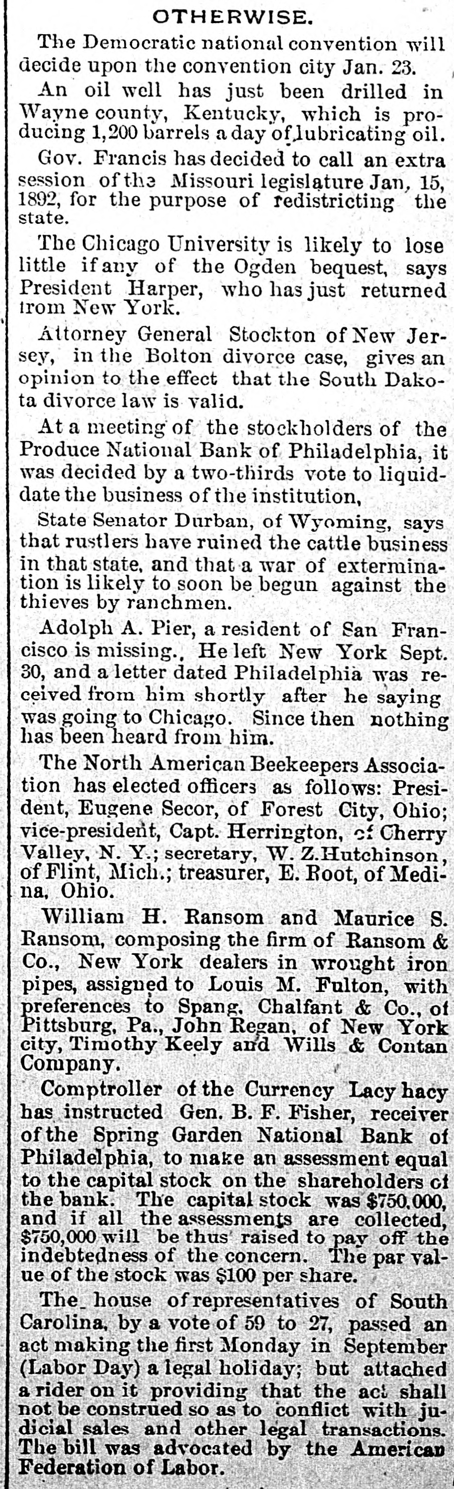 OTHERWISE. The Democratic national convention will decide upon the convention city Jan. 23. An oil well has just been drilled in Wayne county, Kentucky, which is producing 1,200 barrels a day of lubricating oil. Gov. Francis has decided to call an extra session of the Missouri legislature Jan, 15, 1892, for the purpose of redistricting the state. The Chicago University is likely to lose little if any of the Ogden bequest, says President Harper, who has just returned from New York. Attorney General Stockton of New Jersey, in the Bolton divorce case, gives an opinion to the effect that the South Dakota divorce law is valid. At a meeting of the stockholders of the Produce National Bank of Philadelphia, it was decided by a two-thirds vote to liquiddate the business of the institution, State Senator Durban, of Wyoming, says that rustlers have ruined the cattle business in that state, and that a war of extermination is likely to soon be begun against the thieves by ranchmen. Adolph A. Pier, a resident of San Francisco is missing. He left New York Sept. 30, and a letter dated Philadelphia was received from him shortly after he saying was going to Chicago. Since then nothing has been heard from him. The North American Beekeepers Association has elected officers as follows: President, Eugene Secor, of Forest City, Ohio; vice-president, Capt. Herrington, of Cherry Valley, N. Y.; secretary, W. Z. Hutchinson, of Flint, Mich.; treasurer, E. Root, of Medina, Ohio. William H. Ransom and Maurice S. Ransom, composing the firm of Ransom & Co., New York dealers in wrought iron pipes, assigned to Louis M. Fulton, with preferences to Spang. Chalfant & Co., of Pittsburg, Pa., John Regan, of New York city, Timothy Keely and Wills & Contan Company. Comptroller of the Currency Lacy hacy has instructed Gen. B. F. Fisher, receiver of the Spring Garden National Bank of Philadelphia, to make an assessment equal to the capital stock on the shareholders of the bank. The capital stock was $750,000, and if all the assessments are collected, $750,000 will be thus raised to pay off the indebtedness of the concern. The par value of the stock was $100 per share. The_ house of representatives of South Carolina, by a vote of 59 to 27, passed an act making the first Monday in September (Labor Day) a legal holiday; but attached a rider on it providing that the act shall not be construed so as to conflict with judicial sales and other legal transactions. The bill was advocated by the American Federation of Labor.