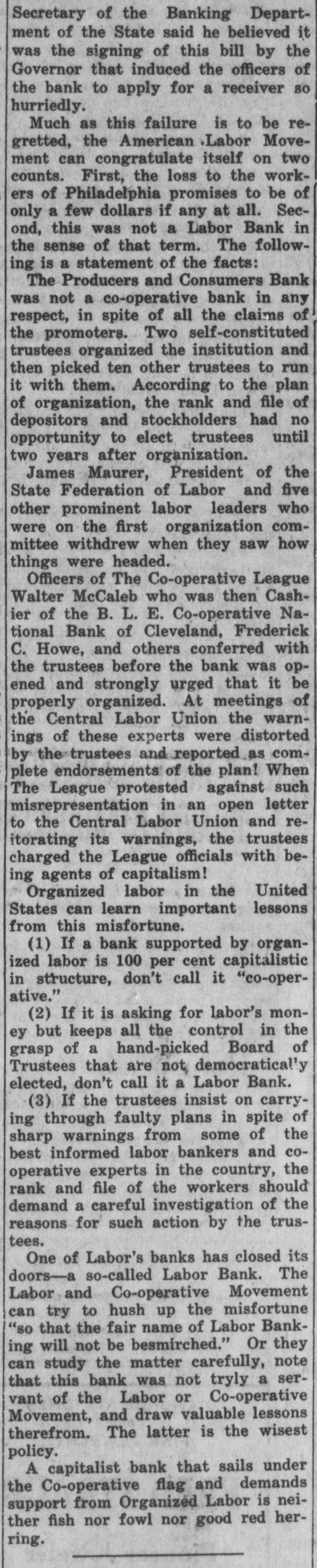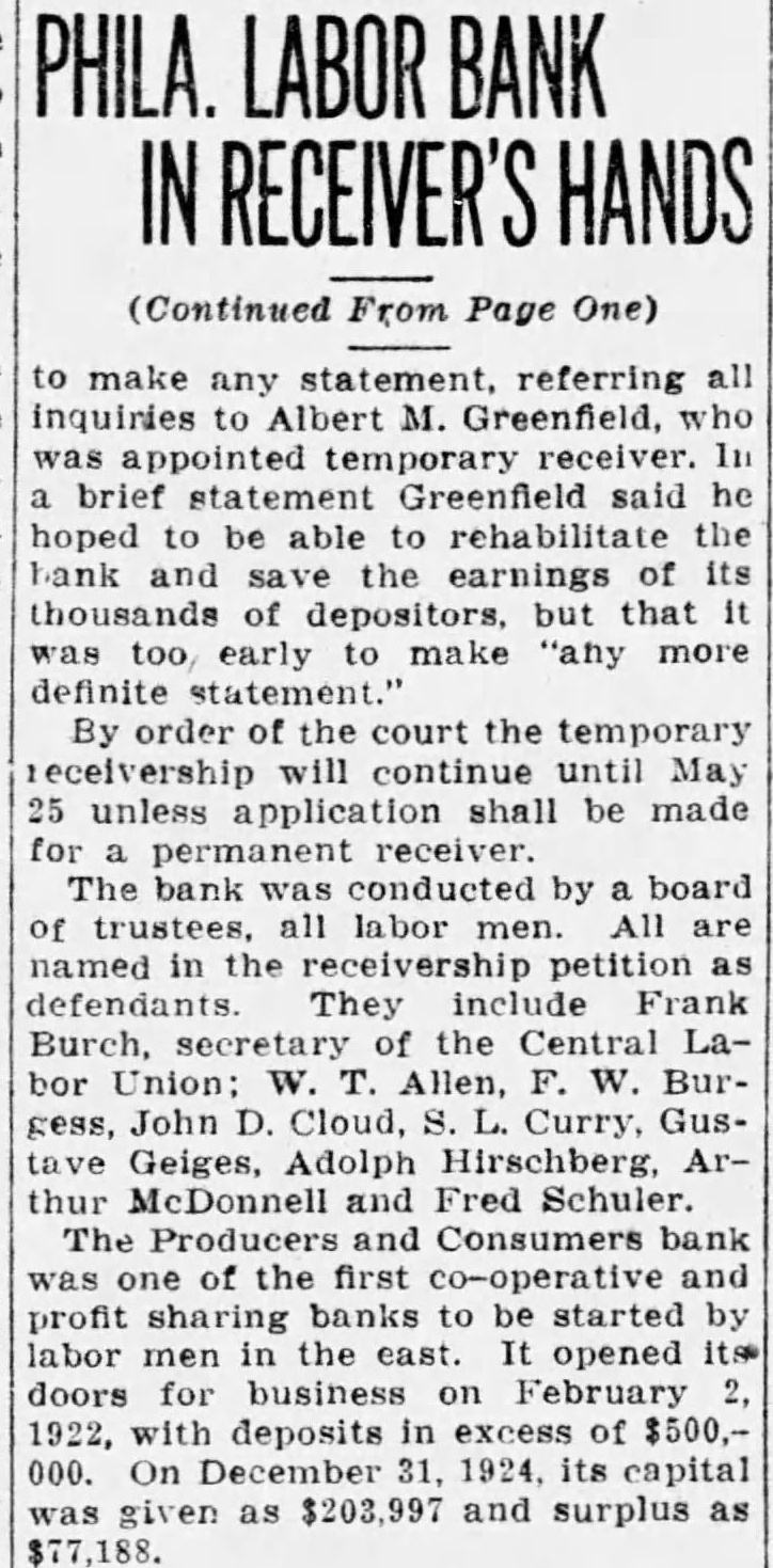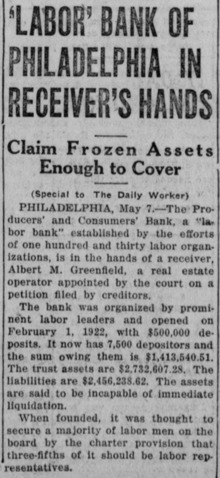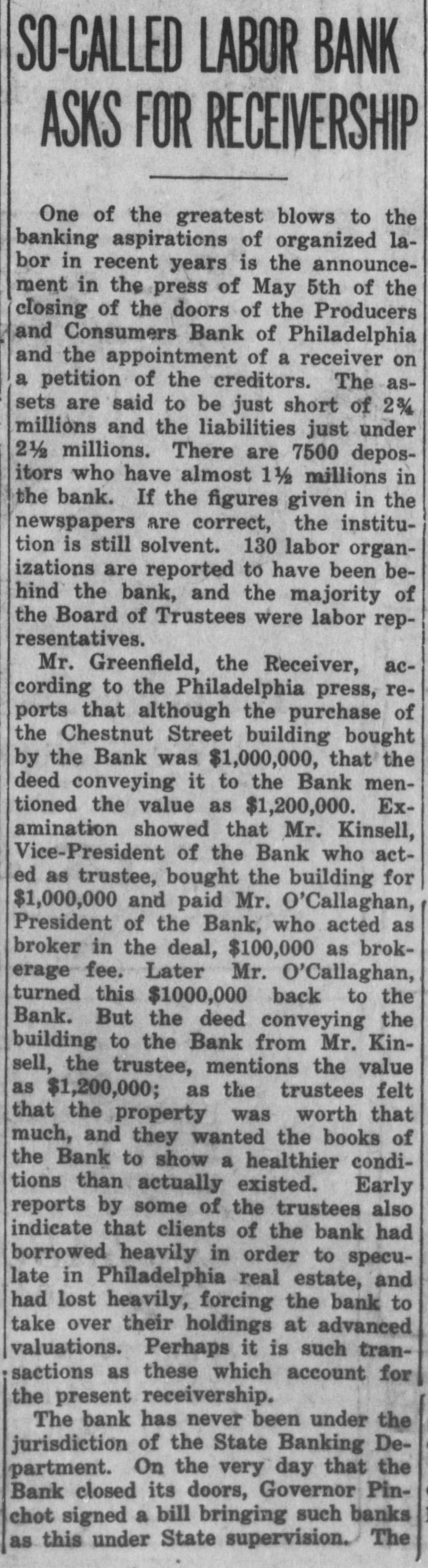 SO-CALLED LABOR BANK ASKS FOR RECEIVERSHIP One of the greatest blows to the banking aspirations of organized labor in recent years is the announcement in the press of May 5th of the closing of the doors of the Producers and Consumers Bank of Philadelphia and the appointment of a receiver on a petition of the creditors. The assets are said to be just short of 23/4 millions and the liabilities just under 2½ millions. There are 7500 depositors who have almost 1½ millions in the bank. If the figures given in the newspapers are correct, the institution is still solvent. 130 labor organizations are reported to have been behind the bank, and the majority of the Board of Trustees were labor representatives. Mr. Greenfield, the Receiver, according to the Philadelphia press, reports that although the purchase of the Chestnut Street building bought by the Bank was $1,000,000, that the deed conveying it to the Bank mentioned the value as $1,200,000. Examination showed that Mr. Kinsell, Vice-President of the Bank who acted as trustee, bought the building for $1,000,000 and paid Mr. O'Callaghan, President of the Bank, who acted as broker in the deal, $100,000 as brokerage fee. Later Mr. O'Callaghan, turned this $1000,000 back to the Bank. But the deed conveying the building to the Bank from Mr. Kinsell, the trustee, mentions the value as $1,200,000; as the trustees felt that the property was worth that much, and they wanted the books of the Bank to show a healthier conditions than actually existed. Early reports by some of the trustees also indicate that clients of the bank had borrowed heavily in order to speculate in Philadelphia real estate, and had lost heavily, forcing the bank to take over their holdings at advanced valuations. Perhaps it is such transactions as these which account for the present receivership. The bank has never been under the jurisdiction of the State Banking Department. On the very day that the Bank closed its doors, Governor Pinchot signed a bill bringing such banks as this under State supervision. The