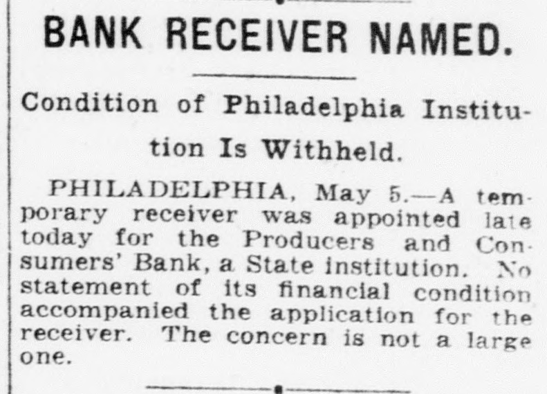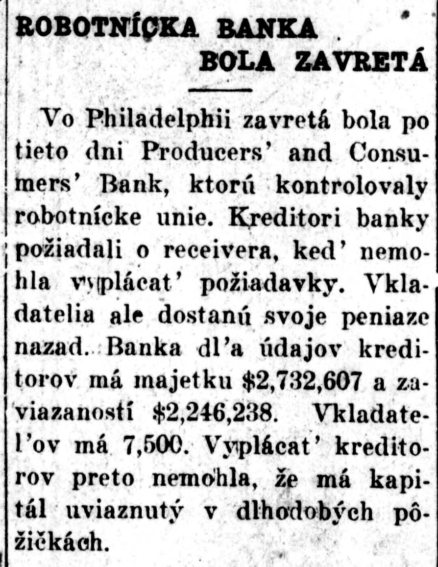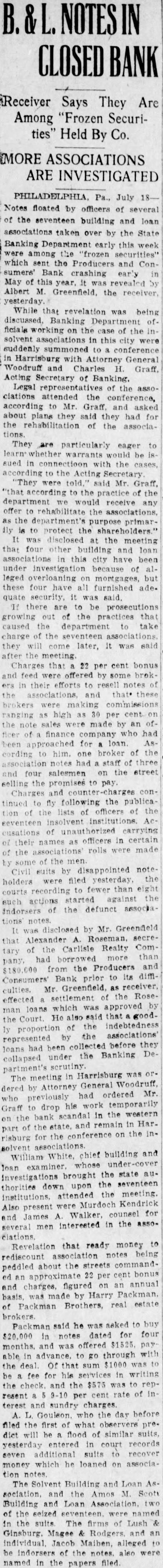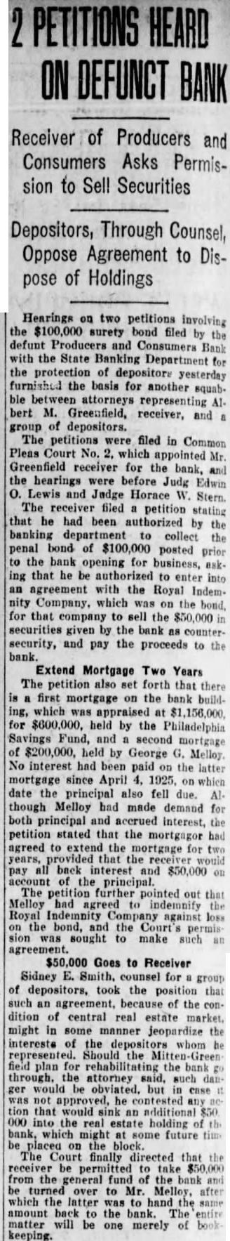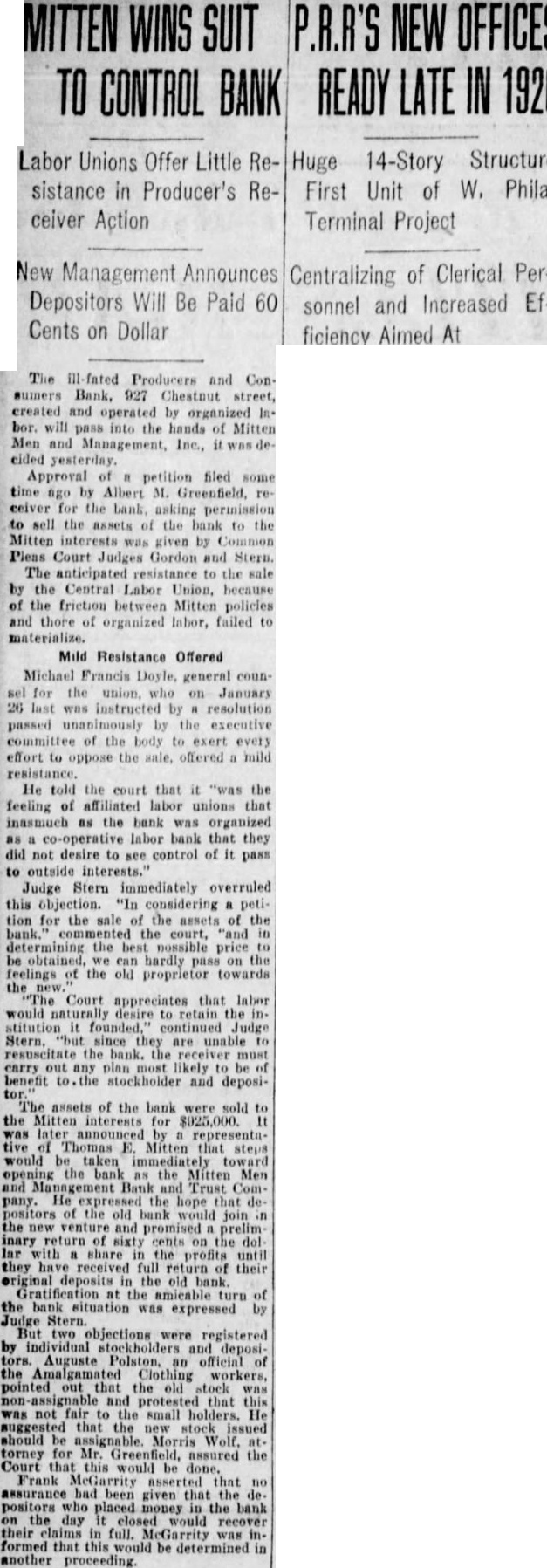 SO-CALLED LABOR BANK ASKS FOR RECEIVERSHIP One of the greatest blows to the banking aspirations of organized labor in recent years is the announcement in the press of May 5th of the closing of the doors of the Producers and Consumers Bank of Philadelphia and the appointment of a receiver on a petition of the creditors. The assets are said to be just short of 23/4 millions and the liabilities just under 2½ millions. There are 7500 depositors who have almost 1½ millions in the bank. If the figures given in the newspapers are correct, the institution is still solvent. 130 labor organizations are reported to have been behind the bank, and the majority of the Board of Trustees were labor representatives. Mr. Greenfield, the Receiver, according to the Philadelphia press, reports that although the purchase of the Chestnut Street building bought by the Bank was $1,000,000, that the deed conveying it to the Bank mentioned the value as $1,200,000. Examination showed that Mr. Kinsell, Vice-President of the Bank who acted as trustee, bought the building for $1,000,000 and paid Mr. O'Callaghan, President of the Bank, who acted as broker in the deal, $100,000 as brokerage fee. Later Mr. O'Callaghan, turned this $1000,000 back to the Bank. But the deed conveying the building to the Bank from Mr. Kinsell, the trustee, mentions the value as $1,200,000; as the trustees felt that the property was worth that much, and they wanted the books of the Bank to show a healthier conditions than actually existed. Early reports by some of the trustees also indicate that clients of the bank had borrowed heavily in order to speculate in Philadelphia real estate, and had lost heavily, forcing the bank to take over their holdings at advanced valuations. Perhaps it is such transactions as these which account for the present receivership. The bank has never been under the jurisdiction of the State Banking Department. On the very day that the Bank closed its doors, Governor Pinchot signed a bill bringing such banks as this under State supervision. The