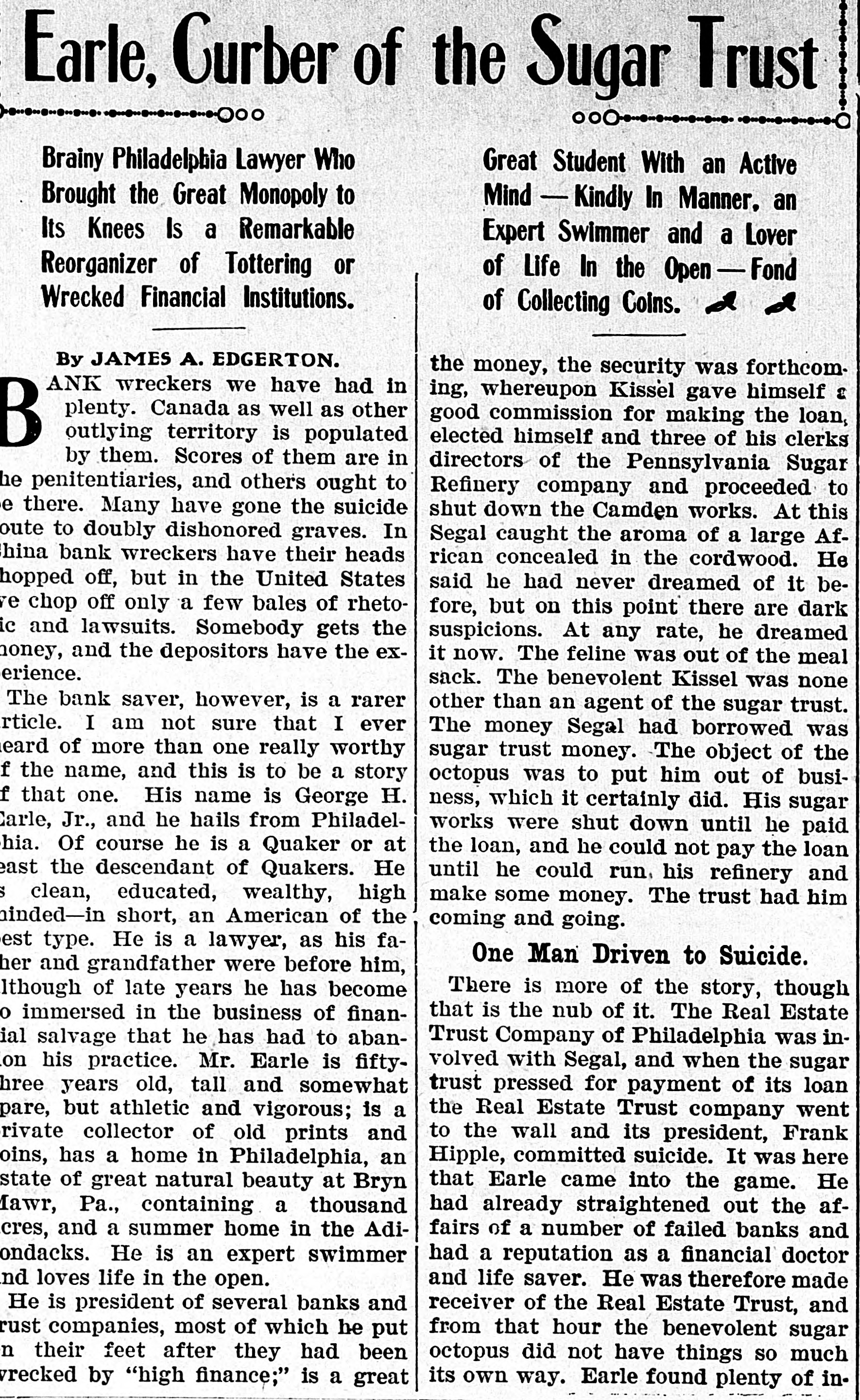 # Earle, Curber of the Sugar Trust Brainy Philadelphia Lawyer Who Brought the Great Monopoly to Its Knees Is a Remarkable Reorganizer of Tottering or Wrecked Financial Institutions. By JAMES A. EDGERTON. BANK wreckers we have had in plenty. Canada as well as other outlying territory is populated by them. Scores of them are in the penitentiaries, and others ought to be there. Many have gone the suicide route to doubly dishonored graves. In China bank wreckers have their heads chopped off, but in the United States we chop off only a few bales of rhetoric and lawsuits. Somebody gets the money, and the depositors have the experience. The bank saver, however, is a rarer article. I am not sure that I ever heard of more than one really worthy of the name, and this is to be a story of that one. His name is George H. Earle, Jr., and he hails from Philadelphia. Of course he is a Quaker or at least the descendant of Quakers. He is clean, educated, wealthy, high minded—in short, an American of the best type. He is a lawyer, as his father and grandfather were before him, although of late years he has become so immersed in the business of financial salvage that he has had to abandon his practice. Mr. Earle is fifty-three years old, tall and somewhat spare, but athletic and vigorous; is a private collector of old prints and coins, has a home in Philadelphia, an estate of great natural beauty at Bryn Mawr, Pa., containing a thousand acres, and a summer home in the Adirondacks. He is an expert swimmer and loves life in the open. He is president of several banks and trust companies, most of which he put on their feet after they had been wrecked by "high finance;" is a great # Great Student With an Active Mind - Kindly In Manner, an Expert Swimmer and a Lover of Life In the Open - Fond of Collecting Coins. the money, the security was forthcoming, whereupon Kissel gave himself a good commission for making the loan, elected himself and three of his clerks directors of the Pennsylvania Sugar Refinery company and proceeded to shut down the Camden works. At this Segal caught the aroma of a large African concealed in the cordwood. He said he had never dreamed of it before, but on this point there are dark suspicions. At any rate, he dreamed it now. The feline was out of the meal sack. The benevolent Kissel was none other than an agent of the sugar trust. The money Segal had borrowed was sugar trust money. The object of the octopus was to put him out of business, which it certainly did. His sugar works were shut down until he paid the loan, and he could not pay the loan until he could run his refinery and make some money. The trust had him coming and going. # One Man Driven to Suicide. There is more of the story, though that is the nub of it. The Real Estate Trust Company of Philadelphia was involved with Segal, and when the sugar trust pressed for payment of its loan the Real Estate Trust company went to the wall and its president, Frank Hipple, committed suicide. It was here that Earle came into the game. He had already straightened out the affairs of a number of failed banks and had a reputation as a financial doctor and life saver. He was therefore made receiver of the Real Estate Trust, and from that hour the benevolent sugar octopus did not have things so much its own way. Earle found plenty of in-