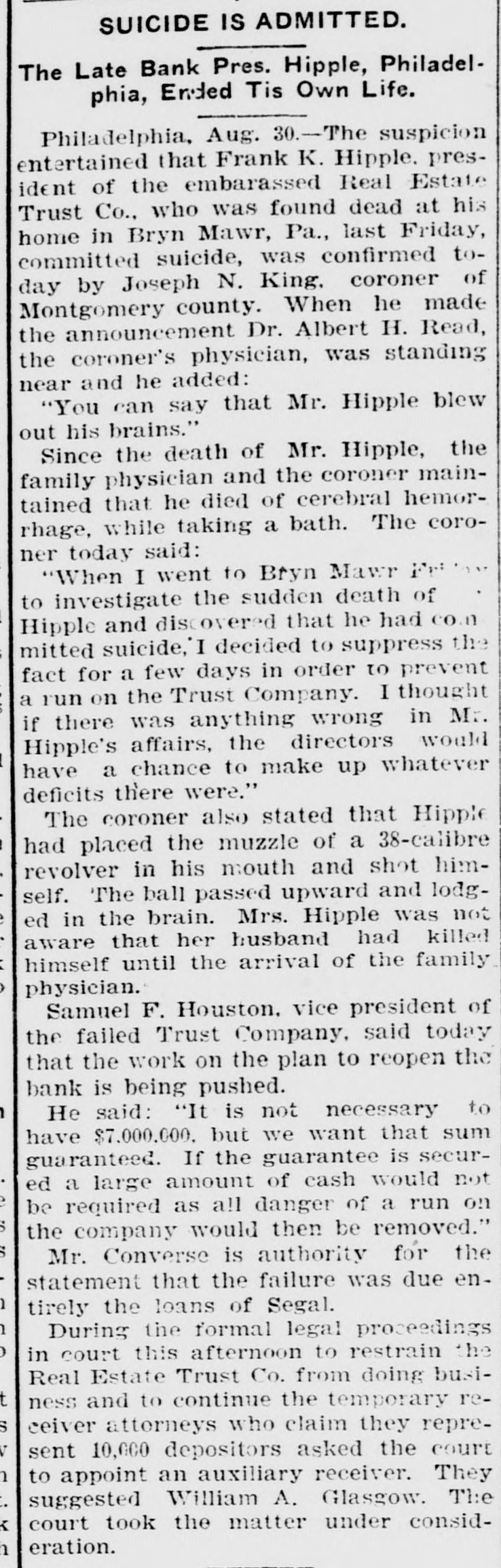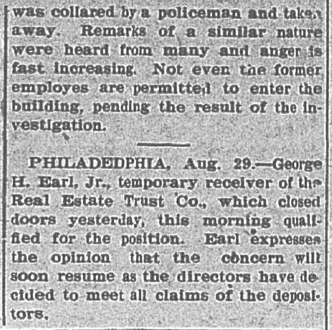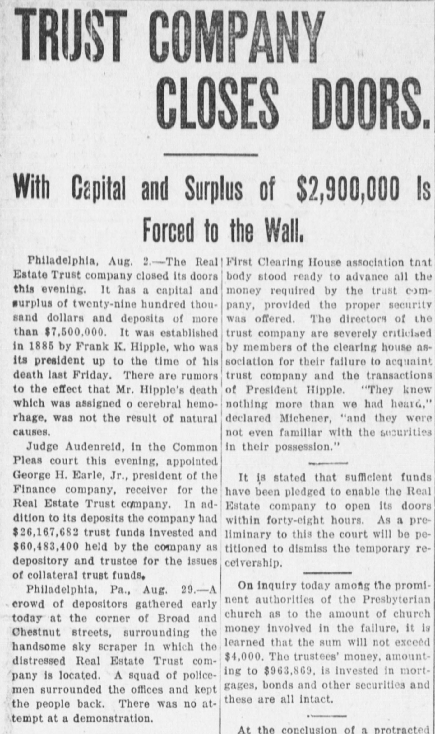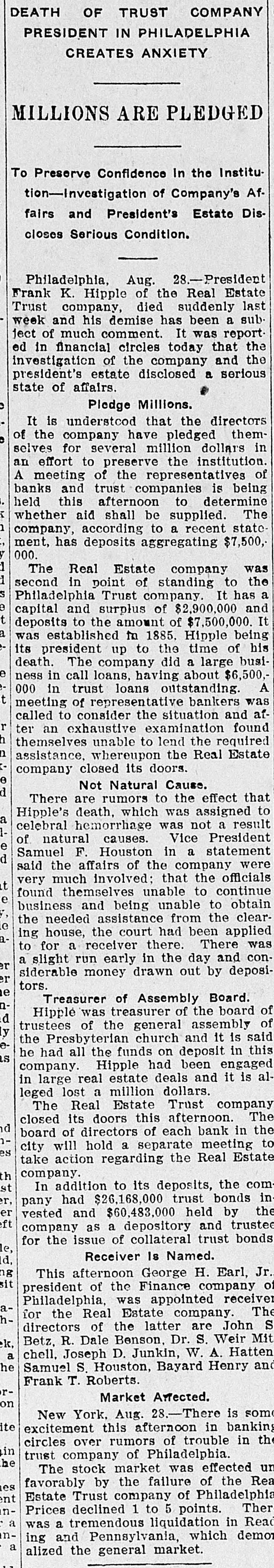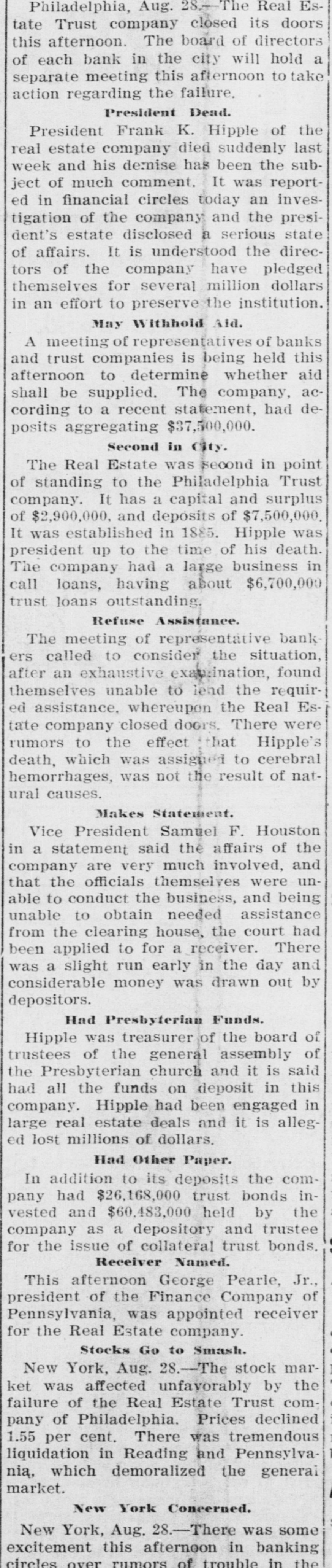 Philadelphia, Aug. 28.+ The Real Estate Trust company closed its doors this afternoon. The board of directors of each bank in the city will hold a separate meeting this afternoon to take action regarding the failure. President Dead. President Frank K. Hipple of the real estate company died suddenly last week and his demise has been the subject of much comment. It was reported in financial circles today an investigation of the company and the president's estate disclosed a serious state of affairs. It is understood the directors of the company have pledged themselves for several million dollars in an effort to preserve the institution. May Withhold Aid. A meeting of representatives of banks and trust companies is being held this afternoon to determine whether aid shall be supplied. The company, according to a recent statement, had deposits aggregating $37,500,000. Second in City. The Real Estate was second in point of standing to the Philadelphia Trust company. It has a capital and surplus of $2,900,000. and deposits of $7,500,000. It was established in 1885. Hipple was president up to the time of his death. The company had a large business in call loans, having about $6,700,000 trust loans outstanding, Refuse Assistance. The meeting of representative bank ers called to consider the situation, after an exhaustive examination, found themselves unable to lend the required assistance, whereupon the Real Estate company closed doors. There were rumors to the effect that Hipple's death, which was assigned to cerebral hemorrhages, was not the result of natural causes. Makes Statement. Vice President Samuel F. Houston in a statement said the affairs of the company are very much involved, and that the officials themselves were unable to conduct the business, and being unable to obtain needed assistance from the clearing house, the court had been applied to for a receiver. There was a slight run early in the day and considerable money was drawn out by depositors. Had Presbyterian Funds. Hipple was treasurer of the board of trustees of the general assembly of the Presbyterian church and it is said had all the funds on deposit in this company. Hipple had been engaged in large real estate deals and it is alleged lost millions of dollars. Had Other Paper. In addition to its deposits the company had $26,168,000 trust bonds invested and $60,483,000 held by the company as a depository and trustee for the issue of collateral trust bonds. Receiver Named. This afternoon George Pearle, Jr., president of the Finance Company of Pennsylvania, was appointed receiver for the Real Estate company. Stocks Go to Smash. New York, Aug. 28.-The stock market was affected unfavorably by the failure of the Real Estate Trust company of Philadelphia. Prices declined 1.55 per cent. There was tremendous liquidation in Reading and Pennsylvania, which demoralized the general market. New York Concerned. New York, Aug. 28.-There was some excitement this afternoon in banking over rumors of trouble in the