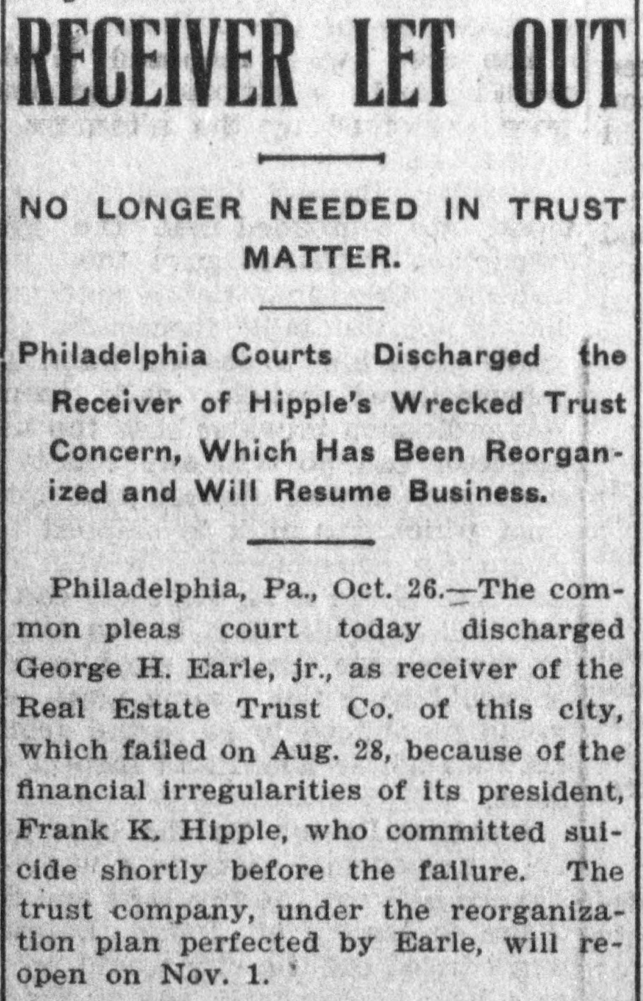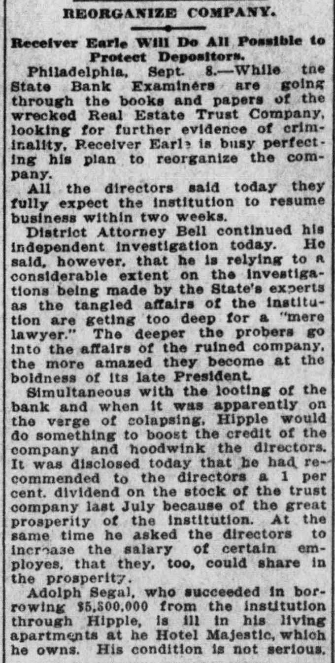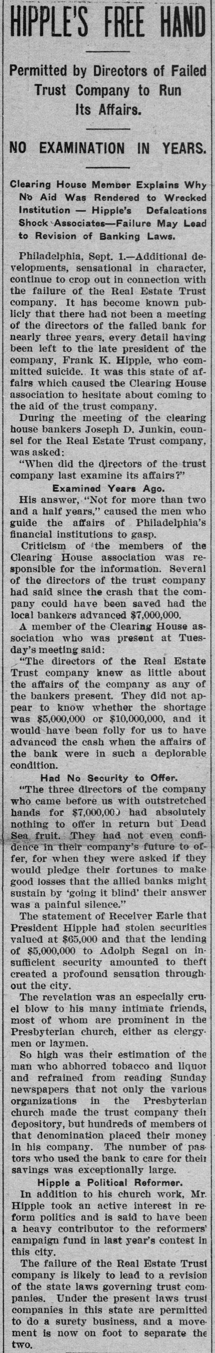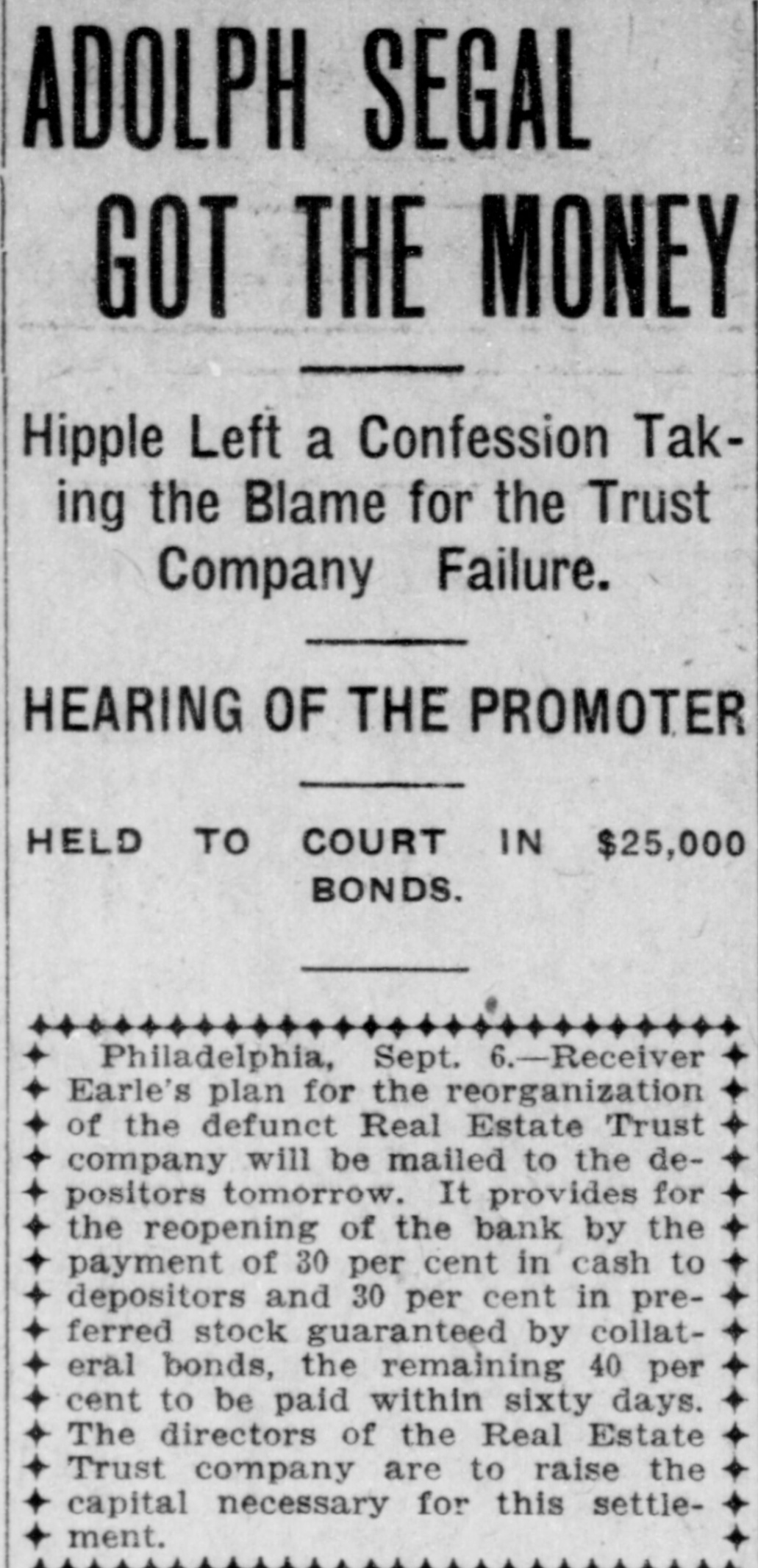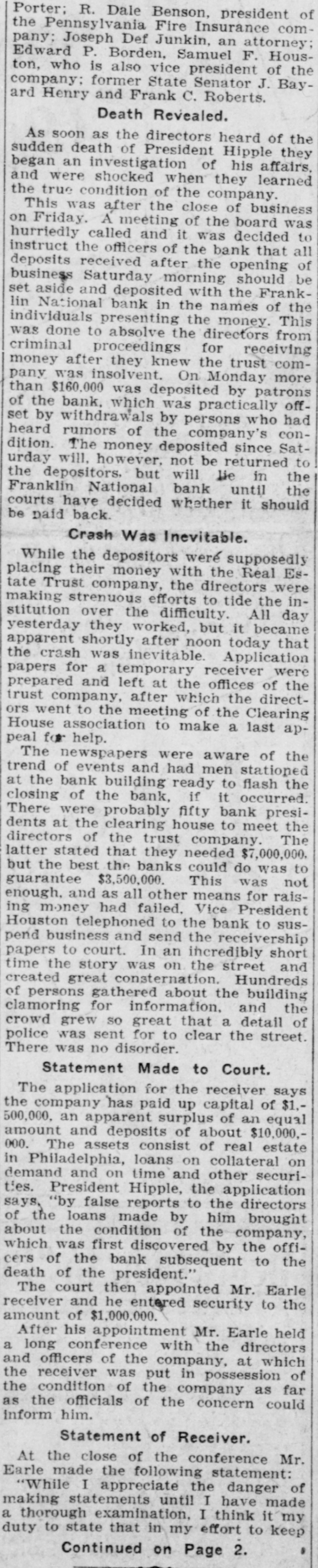 Philadelphia, Aug. 28.+ The Real Estate Trust company closed its doors this afternoon. The board of directors of each bank in the city will hold a separate meeting this afternoon to take action regarding the failure. President Dead. President Frank K. Hipple of the real estate company died suddenly last week and his demise has been the subject of much comment. It was reported in financial circles today an investigation of the company and the president's estate disclosed a serious state of affairs. It is understood the directors of the company have pledged themselves for several million dollars in an effort to preserve the institution. May Withhold Aid. A meeting of representatives of banks and trust companies is being held this afternoon to determine whether aid shall be supplied. The company, according to a recent statement, had deposits aggregating $37,500,000. Second in City. The Real Estate was second in point of standing to the Philadelphia Trust company. It has a capital and surplus of $2,900,000. and deposits of $7,500,000. It was established in 1885. Hipple was president up to the time of his death. The company had a large business in call loans, having about $6,700,000 trust loans outstanding, Refuse Assistance. The meeting of representative bank ers called to consider the situation, after an exhaustive examination, found themselves unable to lend the required assistance, whereupon the Real Estate company closed doors. There were rumors to the effect that Hipple's death, which was assigned to cerebral hemorrhages, was not the result of natural causes. Makes Statement. Vice President Samuel F. Houston in a statement said the affairs of the company are very much involved, and that the officials themselves were unable to conduct the business, and being unable to obtain needed assistance from the clearing house, the court had been applied to for a receiver. There was a slight run early in the day and considerable money was drawn out by depositors. Had Presbyterian Funds. Hipple was treasurer of the board of trustees of the general assembly of the Presbyterian church and it is said had all the funds on deposit in this company. Hipple had been engaged in large real estate deals and it is alleged lost millions of dollars. Had Other Paper. In addition to its deposits the company had $26,168,000 trust bonds invested and $60,483,000 held by the company as a depository and trustee for the issue of collateral trust bonds. Receiver Named. This afternoon George Pearle, Jr., president of the Finance Company of Pennsylvania, was appointed receiver for the Real Estate company. Stocks Go to Smash. New York, Aug. 28.-The stock market was affected unfavorably by the failure of the Real Estate Trust company of Philadelphia. Prices declined 1.55 per cent. There was tremendous liquidation in Reading and Pennsylvania, which demoralized the general market. New York Concerned. New York, Aug. 28.-There was some excitement this afternoon in banking over rumors of trouble in the