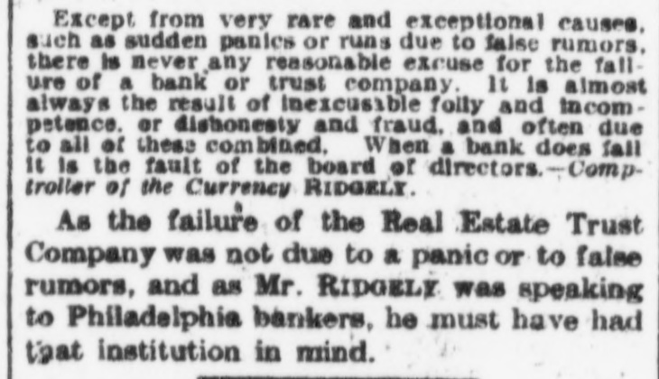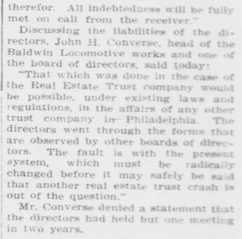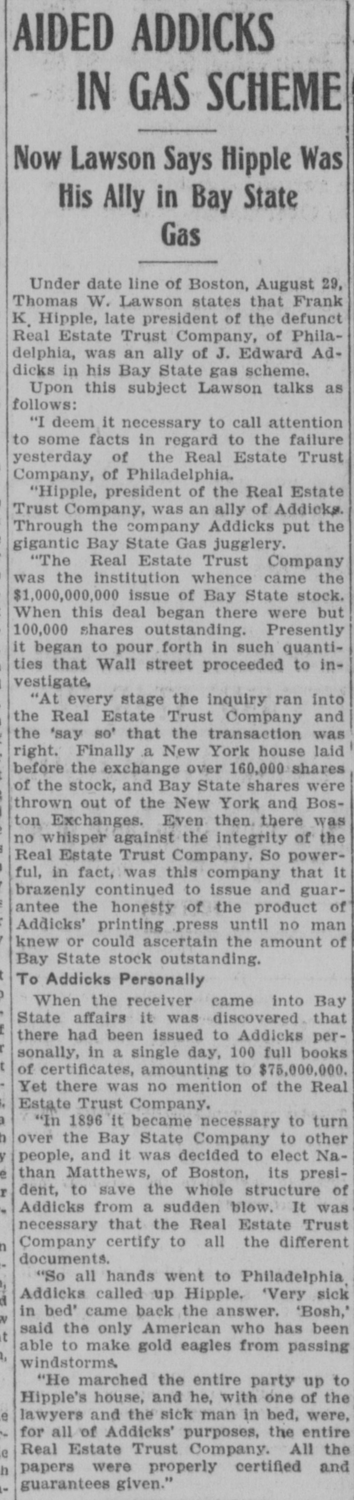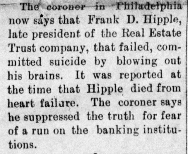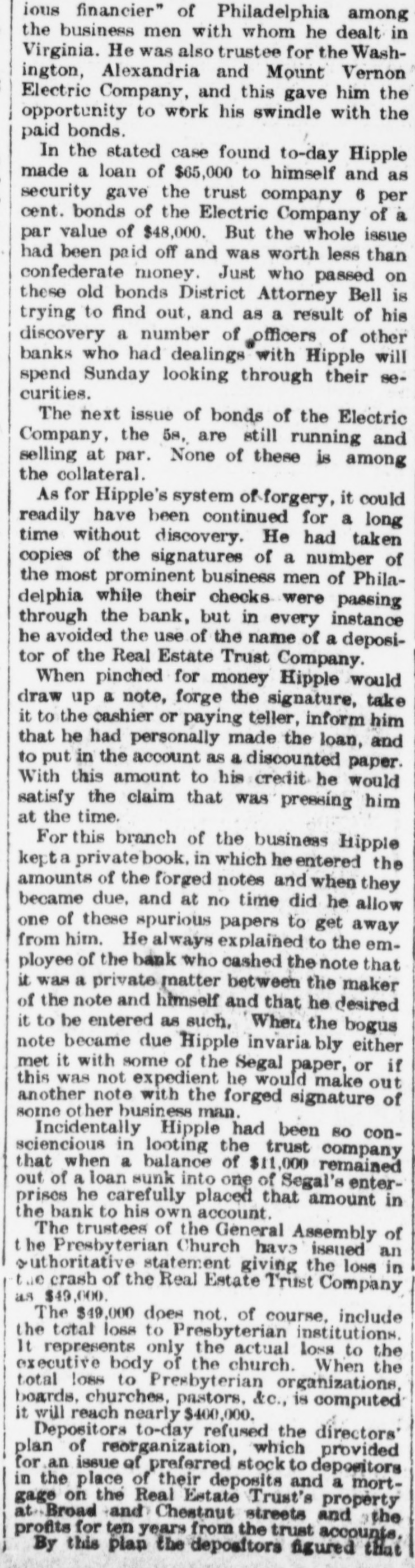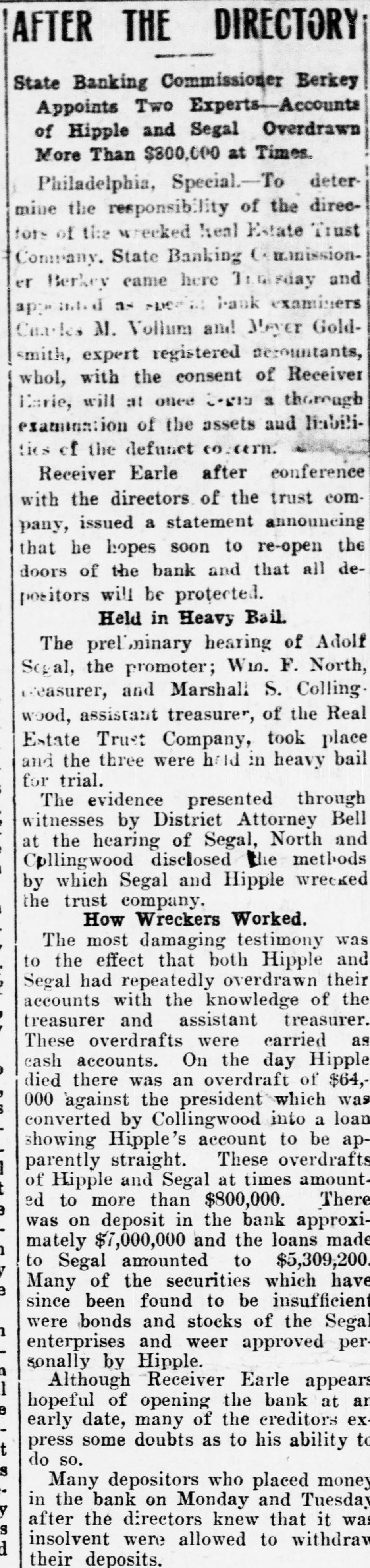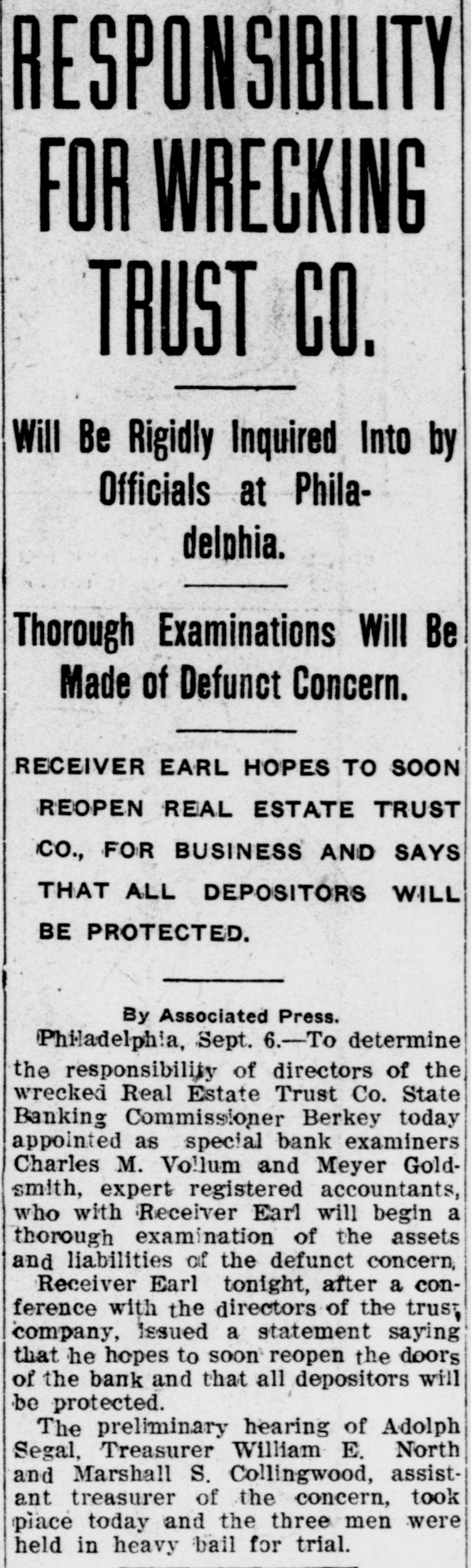 Philadelphia, Aug. 28.+ The Real Estate Trust company closed its doors this afternoon. The board of directors of each bank in the city will hold a separate meeting this afternoon to take action regarding the failure. President Dead. President Frank K. Hipple of the real estate company died suddenly last week and his demise has been the subject of much comment. It was reported in financial circles today an investigation of the company and the president's estate disclosed a serious state of affairs. It is understood the directors of the company have pledged themselves for several million dollars in an effort to preserve the institution. May Withhold Aid. A meeting of representatives of banks and trust companies is being held this afternoon to determine whether aid shall be supplied. The company, according to a recent statement, had deposits aggregating $37,500,000. Second in City. The Real Estate was second in point of standing to the Philadelphia Trust company. It has a capital and surplus of $2,900,000. and deposits of $7,500,000. It was established in 1885. Hipple was president up to the time of his death. The company had a large business in call loans, having about $6,700,000 trust loans outstanding, Refuse Assistance. The meeting of representative bank ers called to consider the situation, after an exhaustive examination, found themselves unable to lend the required assistance, whereupon the Real Estate company closed doors. There were rumors to the effect that Hipple's death, which was assigned to cerebral hemorrhages, was not the result of natural causes. Makes Statement. Vice President Samuel F. Houston in a statement said the affairs of the company are very much involved, and that the officials themselves were unable to conduct the business, and being unable to obtain needed assistance from the clearing house, the court had been applied to for a receiver. There was a slight run early in the day and considerable money was drawn out by depositors. Had Presbyterian Funds. Hipple was treasurer of the board of trustees of the general assembly of the Presbyterian church and it is said had all the funds on deposit in this company. Hipple had been engaged in large real estate deals and it is alleged lost millions of dollars. Had Other Paper. In addition to its deposits the company had $26,168,000 trust bonds invested and $60,483,000 held by the company as a depository and trustee for the issue of collateral trust bonds. Receiver Named. This afternoon George Pearle, Jr., president of the Finance Company of Pennsylvania, was appointed receiver for the Real Estate company. Stocks Go to Smash. New York, Aug. 28.-The stock market was affected unfavorably by the failure of the Real Estate Trust company of Philadelphia. Prices declined 1.55 per cent. There was tremendous liquidation in Reading and Pennsylvania, which demoralized the general market. New York Concerned. New York, Aug. 28.-There was some excitement this afternoon in banking over rumors of trouble in the