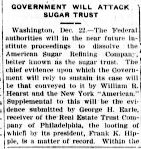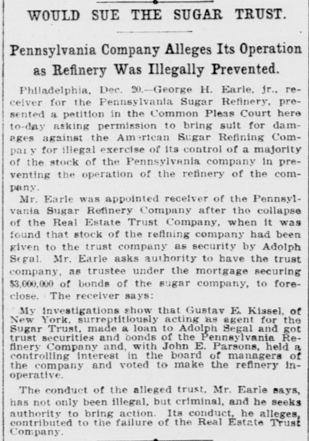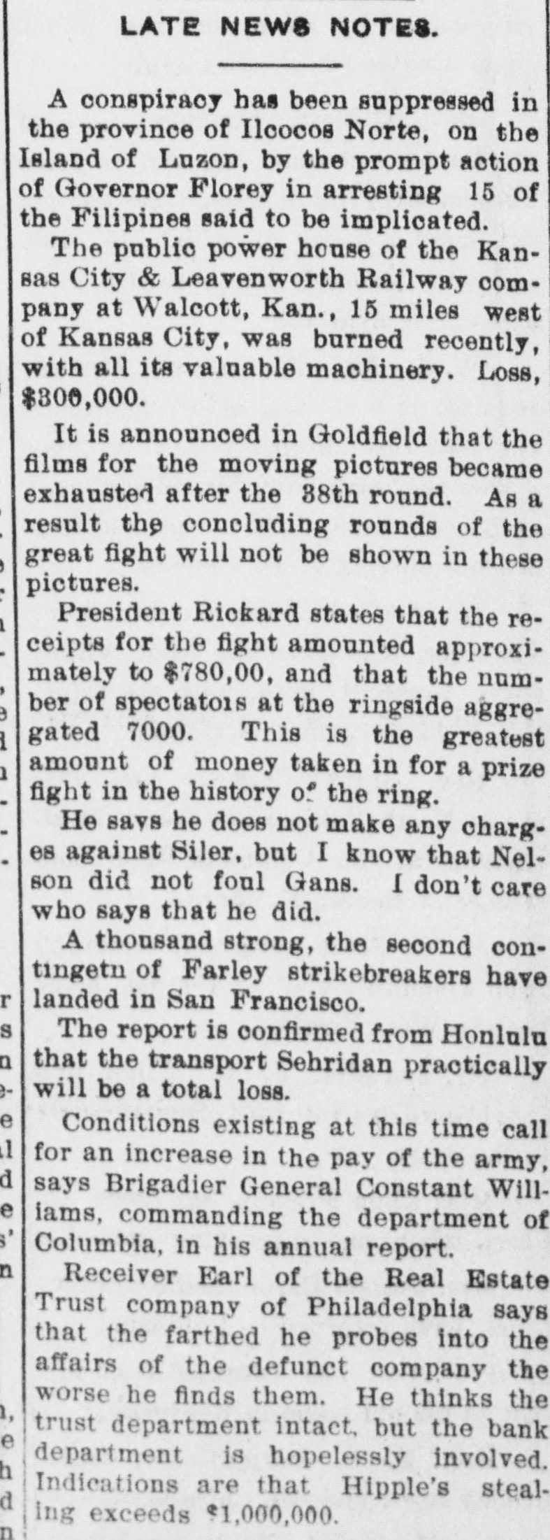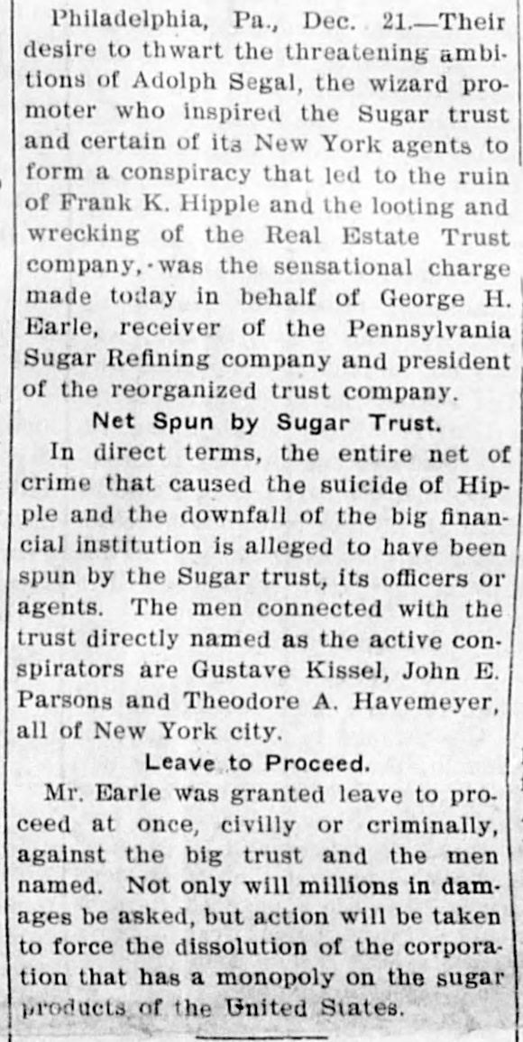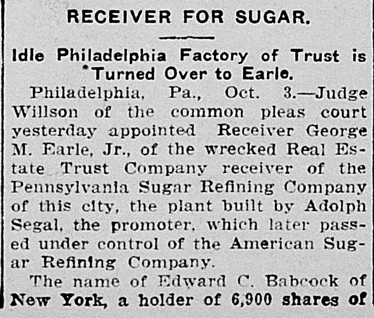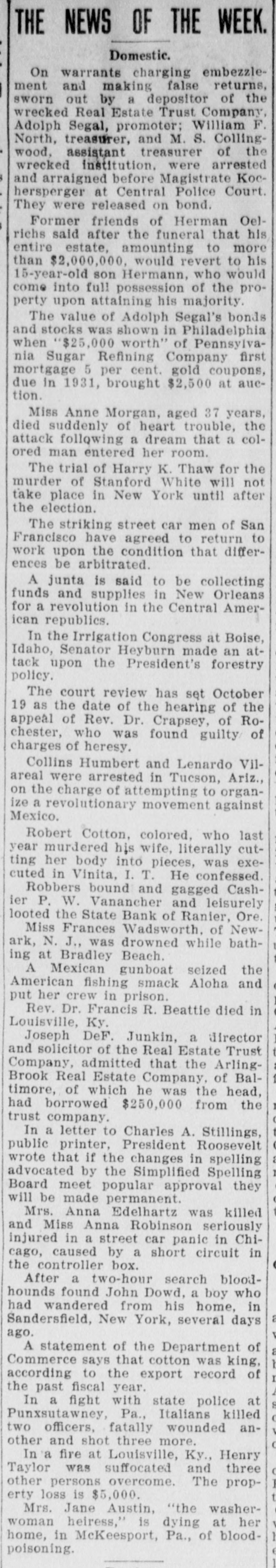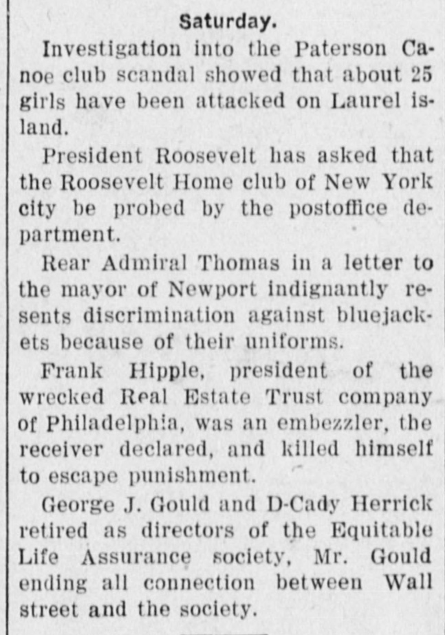 Philadelphia, Aug. 28.+ The Real Estate Trust company closed its doors this afternoon. The board of directors of each bank in the city will hold a separate meeting this afternoon to take action regarding the failure. President Dead. President Frank K. Hipple of the real estate company died suddenly last week and his demise has been the subject of much comment. It was reported in financial circles today an investigation of the company and the president's estate disclosed a serious state of affairs. It is understood the directors of the company have pledged themselves for several million dollars in an effort to preserve the institution. May Withhold Aid. A meeting of representatives of banks and trust companies is being held this afternoon to determine whether aid shall be supplied. The company, according to a recent statement, had deposits aggregating $37,500,000. Second in City. The Real Estate was second in point of standing to the Philadelphia Trust company. It has a capital and surplus of $2,900,000. and deposits of $7,500,000. It was established in 1885. Hipple was president up to the time of his death. The company had a large business in call loans, having about $6,700,000 trust loans outstanding, Refuse Assistance. The meeting of representative bank ers called to consider the situation, after an exhaustive examination, found themselves unable to lend the required assistance, whereupon the Real Estate company closed doors. There were rumors to the effect that Hipple's death, which was assigned to cerebral hemorrhages, was not the result of natural causes. Makes Statement. Vice President Samuel F. Houston in a statement said the affairs of the company are very much involved, and that the officials themselves were unable to conduct the business, and being unable to obtain needed assistance from the clearing house, the court had been applied to for a receiver. There was a slight run early in the day and considerable money was drawn out by depositors. Had Presbyterian Funds. Hipple was treasurer of the board of trustees of the general assembly of the Presbyterian church and it is said had all the funds on deposit in this company. Hipple had been engaged in large real estate deals and it is alleged lost millions of dollars. Had Other Paper. In addition to its deposits the company had $26,168,000 trust bonds invested and $60,483,000 held by the company as a depository and trustee for the issue of collateral trust bonds. Receiver Named. This afternoon George Pearle, Jr., president of the Finance Company of Pennsylvania, was appointed receiver for the Real Estate company. Stocks Go to Smash. New York, Aug. 28.-The stock market was affected unfavorably by the failure of the Real Estate Trust company of Philadelphia. Prices declined 1.55 per cent. There was tremendous liquidation in Reading and Pennsylvania, which demoralized the general market. New York Concerned. New York, Aug. 28.-There was some excitement this afternoon in banking over rumors of trouble in the