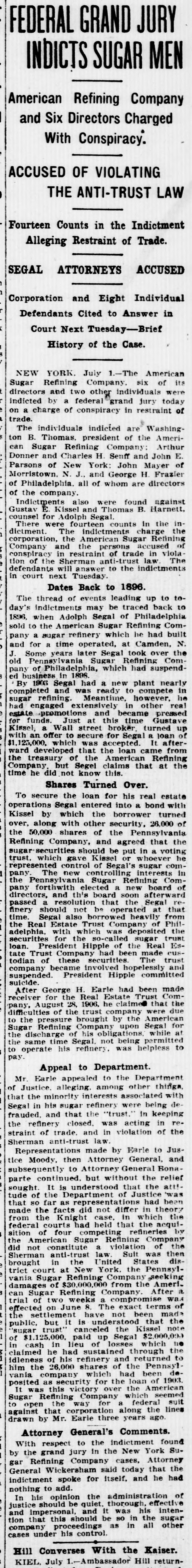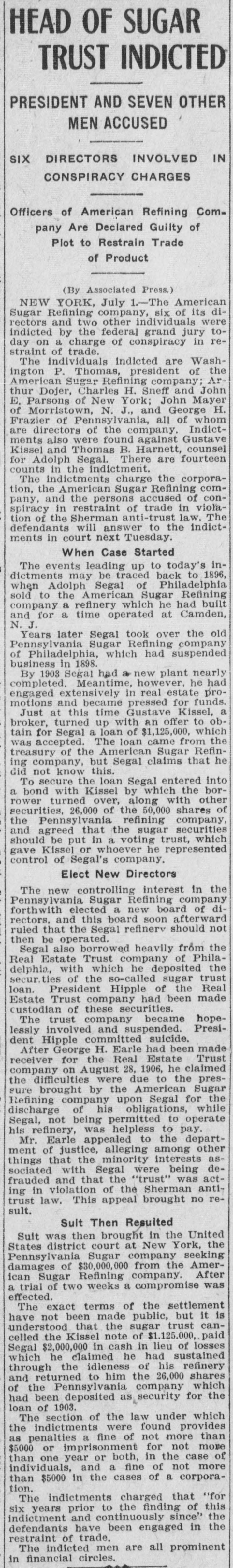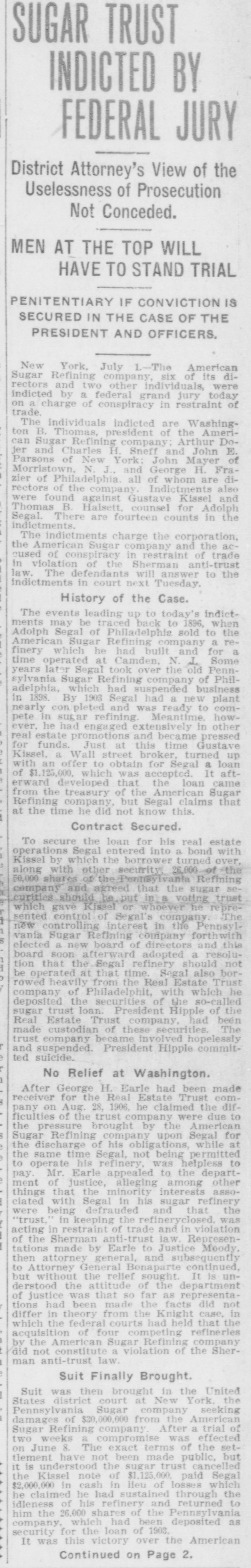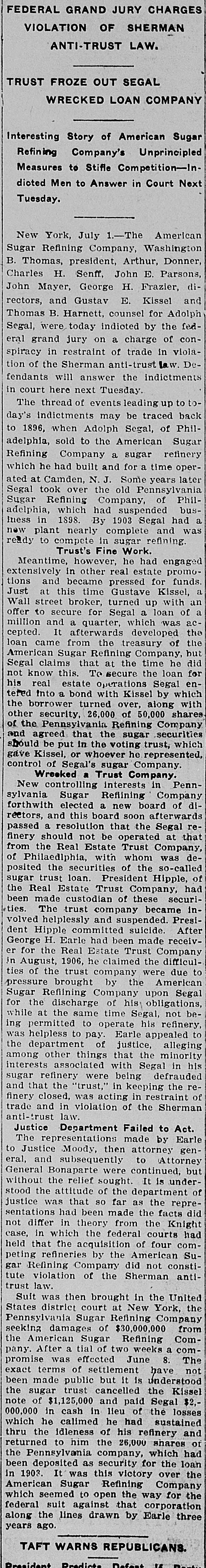REGGIO AND MESSINA REEL AS EARTHQUAKE SHATTERS WALLS LEFT ON LATE RUINS Population Flee in Panic and Attempt to Seize by Force TempoGOVERNOR BROWN'S BIG SUGAR TRUST rary Houses Built With American Money. INITIAL MESSAGE CALLED TO ANSWER SOLDIERS AND SAILORS ARE HURRIED TO KEEP Document Contains Between Six Six Directors and Two Other InVANDALS FROM LOOTING and Seven Thousand Words and dividuals Were Indicted in New Is Conservative in Its General York by Federal Grand Jury Shocks Began Wednesday Night Tone. Thursday. and Continued Until Early Thursday, Causing the Wildest Governor Brown's initial message to (By Associated Press.) NEW YORK, July 1.-The American the general assembly was transmitted Panic Everywhere. Sugar Refining company, six of its dito the two houses Thursday The rectors and two other individuals were message contains between seven and (Py Associated Press.) indicted by a federal grand jury today eight thousand words, and deals with MESSINA. Sicily, July 1.-Six months on a charge of conspiracy in restraint of after the devastating earthquake of Demany perplexing problems of state actrade. cember 28, which laid waste more than a cording to the views of the chief exThe individuals indicted are Washingscore of cities and towns in Calabria and ecutive. It is a conservative docuton B. Thomas, president of the AmerSicily, and killed 200,000 people, Messina ment, dwelling, in parts, upon the proIcan Sugar Refining company; Arthur and Reggio were this morning again visvisions of the platform upon which Donner, Charles H. Senff and John E. ited by an earthquake which, had they Governor Brown was nominated, and Parsons, of New York: John Mayer, of been built, would have laid them a secreferring frequently to constitutional Morristown, N. J., and George H. Fraond time in ruins. It would seem that provisions of law. zier, of Philadelphia, all of whom are nature is determined to blot out MesThe message in full, follows: directors of the company. sina, but recently one of the fairest cities STATE OF GEORGIA, Indictments also were found against in the world. EXECUTIVE DEPARTMENT. Gustave Kissel and Thomas B. Harnett, It is as yet impossible to accurately deATLANTA, July 1, 1909. counsel for Adolph Segal. There were termine the number of casualties. Some 14 counts in the indictment. To the General Assembly: of the reports are alarming, but they The indictments charge the corporation, At the threshold of the assumption the American Sugar Refining company cannot be verified. of the duties which the call of a free and the persons accused of conspiracy in So far as is positively known. only a people has imposed upon us, it is well restraint of trade in violation of the Sherto remember the constitutional limitafew people were hurt, One woman was man anti-trust law. The defendants will tions of each department of the state killed by a falling wall and a child was answer to the indictments in court next government, and, while maintaining the seriously injured. Tuesday. integrity and inpedence of each withLONG NIGHT OF HORROR. HISTORY OF THE CHARGES. in its proper sphere as the surest safeThe thread of events leading up to toWhile minor shocks have been of freguard of our republican institutions, day's indictments may be traced back to quent occurrence in Sicily in the last six to so generously co-operate that our 1896, when Adolph Segal, of Philadelphia, months, last night they became more seunited labors may enlarge the benesold to the American Sugar Refining comrious and caused considerable alarm. The fits of the public service, and thus pany a suger refinery which he had built most severe quakes came at 7:20 and 7:25 and for a time operated at Camden, N. J. fulfill our obligations as faithful servSome years later Segal took over the this morning, and were similar to the faants of the people. old Pennsylvania Sugar Refining comWhile the executive may recommend tal disturbance of December, being acpany, of Philadelphia, which had suslegislation, the duty and the responsicompanied by the same roaring noises pended business in 1898. By 1903 Segal bility of making laws must. and should that added to the horror of that fateful had started a new plant to compete in rest upon you as the chosen agents of sugar refining. Meantime he had engaged night. the people to give legislative expression extensively in other real estate promoThe population again fled in fear and to their will. tions and became pressed for funds. cries of terror rent the air. In full recognition of this responsiJust at this time Gustave Kissel, a Wall The people hurried to the open places bility. and in a kindly spirit of comity street broker, turned up with an offer to of the city and the surrounding country, and co-operation. I beg to lay before secure for Segal a loan of $1,125,000, you certain matters which to me seem praying to the saints that their lives which was accepted. It afterward developed that the loan came from the might be spared. timely and expedient. treasury of the American Sugar Refining A CONSTRUCTIVE GEORGIA. Gradually, as the confidence of the peocompany, but Segal claims he did not ple returned after last December's catasIn endeavoring to solve the problems know this then. confronting us as the result of events trophe, Messina had acquired a populaTo secure the loan for his real estate reaching back into the years 1905-'06, tion of something over 25,000, but today operations, Segal entered into a bond we must ever have in mind the motto with Kissel by which the borrower turned the people again are in terror and do not words of our great state: "Wisdom, over, along with other securities, 26,000 el-themselves safe, even in the tempojustice, moderation." We must "put, beof the 50,000 shares of the Pennsylvania rary huts erected for their shelter, and Refining company and agreed that the hind us animosity, discard -denunciahave fled to, the country, preferring the sugar securities should be put in a voting tio