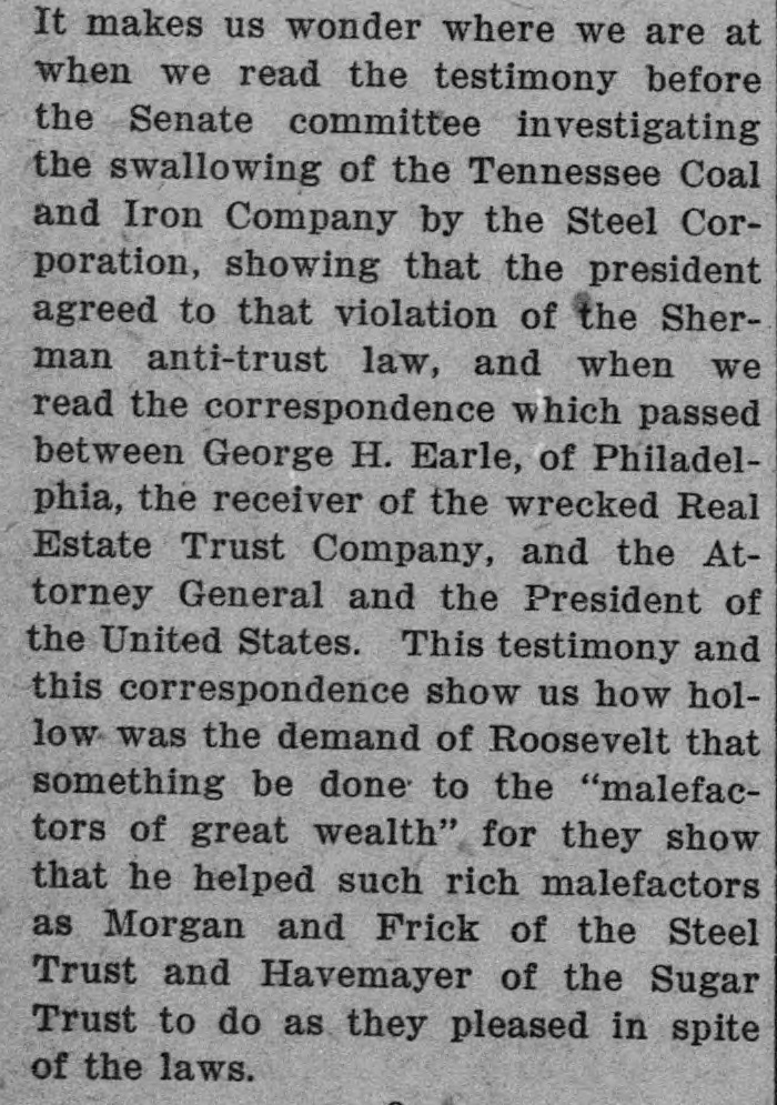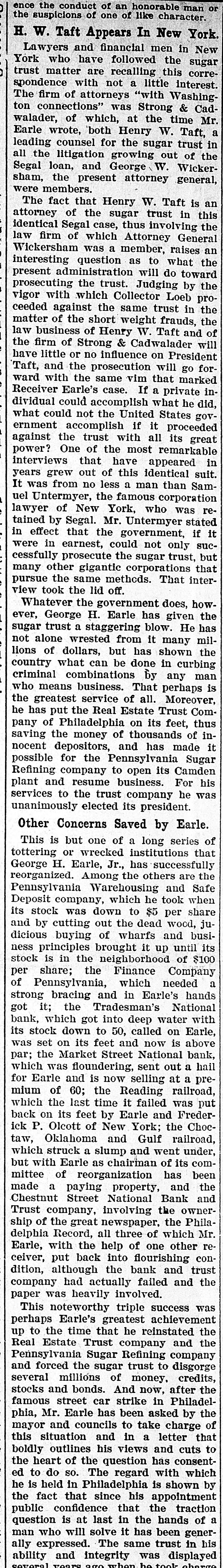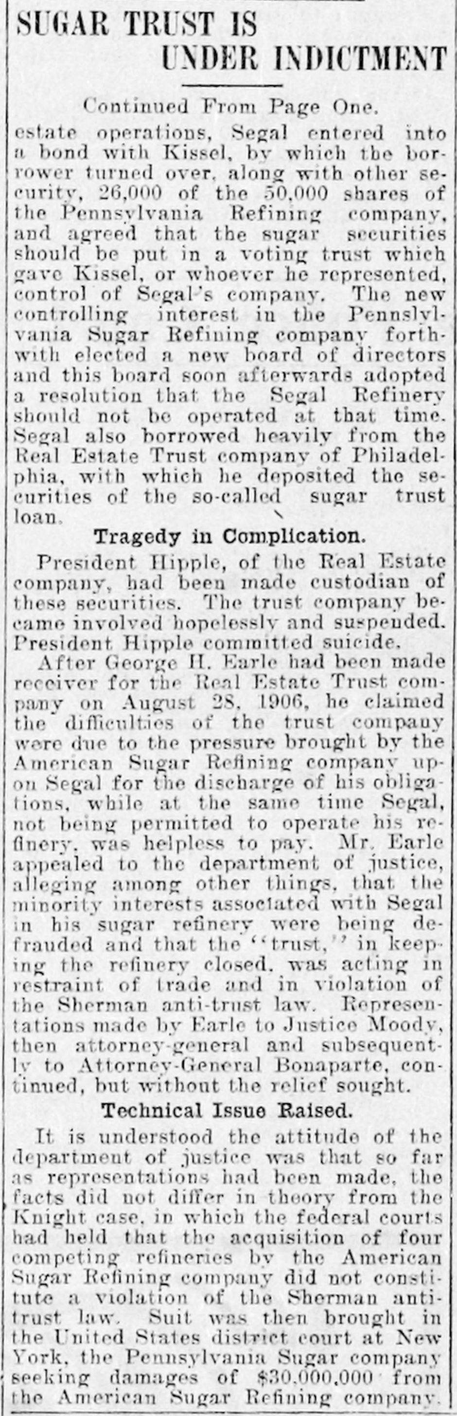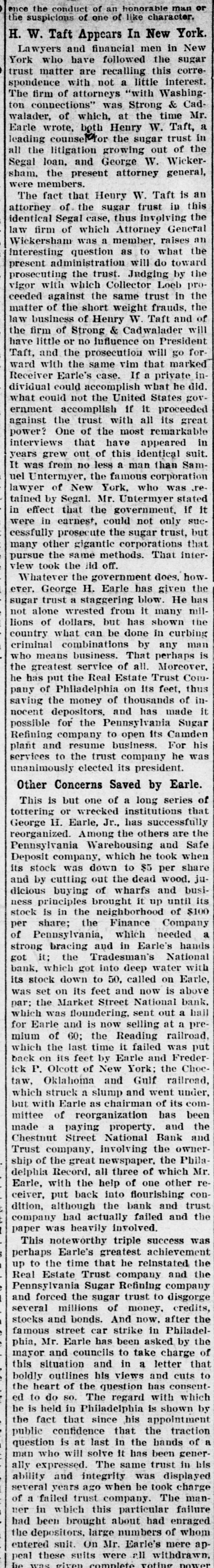 REGGIO AND MESSINA REEL AS EARTHQUAKE SHATTERS WALLS LEFT ON LATE RUINS Population Flee in Panic and Attempt to Seize by Force TempoGOVERNOR BROWN'S BIG SUGAR TRUST rary Houses Built With American Money. INITIAL MESSAGE CALLED TO ANSWER SOLDIERS AND SAILORS ARE HURRIED TO KEEP Document Contains Between Six Six Directors and Two Other InVANDALS FROM LOOTING and Seven Thousand Words and dividuals Were Indicted in New Is Conservative in Its General York by Federal Grand Jury Shocks Began Wednesday Night Tone. Thursday. and Continued Until Early Thursday, Causing the Wildest Governor Brown's initial message to (By Associated Press.) NEW YORK, July 1.-The American the general assembly was transmitted Panic Everywhere. Sugar Refining company, six of its dito the two houses Thursday The rectors and two other individuals were message contains between seven and (Py Associated Press.) indicted by a federal grand jury today eight thousand words, and deals with MESSINA. Sicily, July 1.-Six months on a charge of conspiracy in restraint of after the devastating earthquake of Demany perplexing problems of state actrade. cember 28, which laid waste more than a cording to the views of the chief exThe individuals indicted are Washingscore of cities and towns in Calabria and ecutive. It is a conservative docuton B. Thomas, president of the AmerSicily, and killed 200,000 people, Messina ment, dwelling, in parts, upon the proIcan Sugar Refining company; Arthur and Reggio were this morning again visvisions of the platform upon which Donner, Charles H. Senff and John E. ited by an earthquake which, had they Governor Brown was nominated, and Parsons, of New York: John Mayer, of been built, would have laid them a secreferring frequently to constitutional Morristown, N. J., and George H. Fraond time in ruins. It would seem that provisions of law. zier, of Philadelphia, all of whom are nature is determined to blot out MesThe message in full, follows: directors of the company. sina, but recently one of the fairest cities STATE OF GEORGIA, Indictments also were found against in the world. EXECUTIVE DEPARTMENT. Gustave Kissel and Thomas B. Harnett, It is as yet impossible to accurately deATLANTA, July 1, 1909. counsel for Adolph Segal. There were termine the number of casualties. Some 14 counts in the indictment. To the General Assembly: of the reports are alarming, but they The indictments charge the corporation, At the threshold of the assumption the American Sugar Refining company cannot be verified. of the duties which the call of a free and the persons accused of conspiracy in So far as is positively known. only a people has imposed upon us, it is well restraint of trade in violation of the Sherto remember the constitutional limitafew people were hurt, One woman was man anti-trust law. The defendants will tions of each department of the state killed by a falling wall and a child was answer to the indictments in court next government, and, while maintaining the seriously injured. Tuesday. integrity and inpedence of each withLONG NIGHT OF HORROR. HISTORY OF THE CHARGES. in its proper sphere as the surest safeThe thread of events leading up to toWhile minor shocks have been of freguard of our republican institutions, day's indictments may be traced back to quent occurrence in Sicily in the last six to so generously co-operate that our 1896, when Adolph Segal, of Philadelphia, months, last night they became more seunited labors may enlarge the benesold to the American Sugar Refining comrious and caused considerable alarm. The fits of the public service, and thus pany a suger refinery which he had built most severe quakes came at 7:20 and 7:25 and for a time operated at Camden, N. J. fulfill our obligations as faithful servSome years later Segal took over the this morning, and were similar to the faants of the people. old Pennsylvania Sugar Refining comWhile the executive may recommend tal disturbance of December, being acpany, of Philadelphia, which had suslegislation, the duty and the responsicompanied by the same roaring noises pended business in 1898. By 1903 Segal bility of making laws must. and should that added to the horror of that fateful had started a new plant to compete in rest upon you as the chosen agents of sugar refining. Meantime he had engaged night. the people to give legislative expression extensively in other real estate promoThe population again fled in fear and to their will. tions and became pressed for funds. cries of terror rent the air. In full recognition of this responsiJust at this time Gustave Kissel, a Wall The people hurried to the open places bility. and in a kindly spirit of comity street broker, turned up with an offer to of the city and the surrounding country, and co-operation. I beg to lay before secure for Segal a loan of $1,125,000, you certain matters which to me seem praying to the saints that their lives which was accepted. It afterward developed that the loan came from the might be spared. timely and expedient. treasury of the American Sugar Refining A CONSTRUCTIVE GEORGIA. Gradually, as the confidence of the peocompany, but Segal claims he did not ple returned after last December's catasIn endeavoring to solve the problems know this then. confronting us as the result of events trophe, Messina had acquired a populaTo secure the loan for his real estate reaching back into the years 1905-'06, tion of something over 25,000, but today operations, Segal entered into a bond we must ever have in mind the motto with Kissel by which the borrower turned the people again are in terror and do not words of our great state: "Wisdom, over, along with other securities, 26,000 el-themselves safe, even in the tempojustice, moderation." We must "put, beof the 50,000 shares of the Pennsylvania rary huts erected for their shelter, and Refining company and agreed that the hind us animosity, discard -denunciahave fled to, the country, preferring the sugar securities should be put in a voting tio