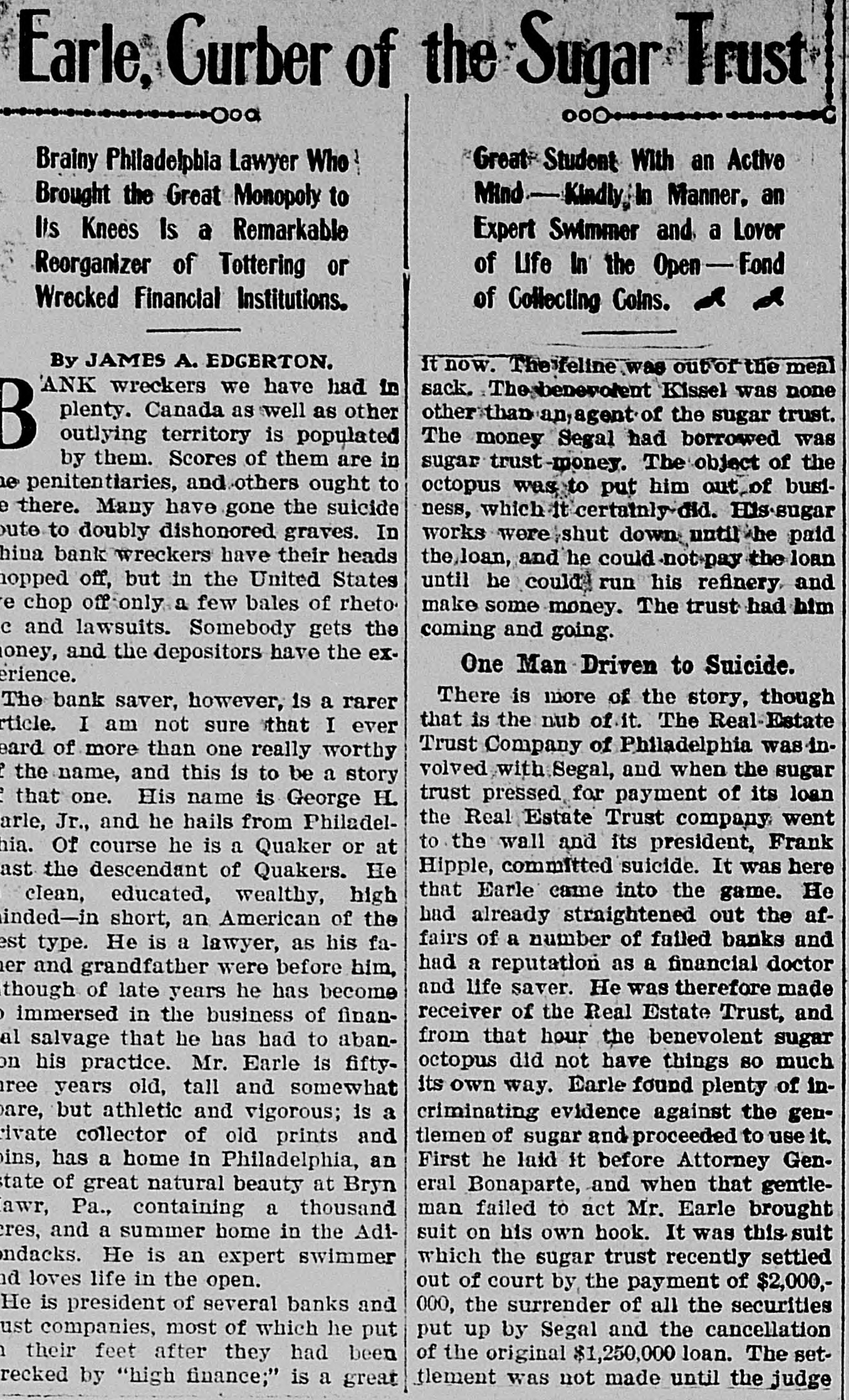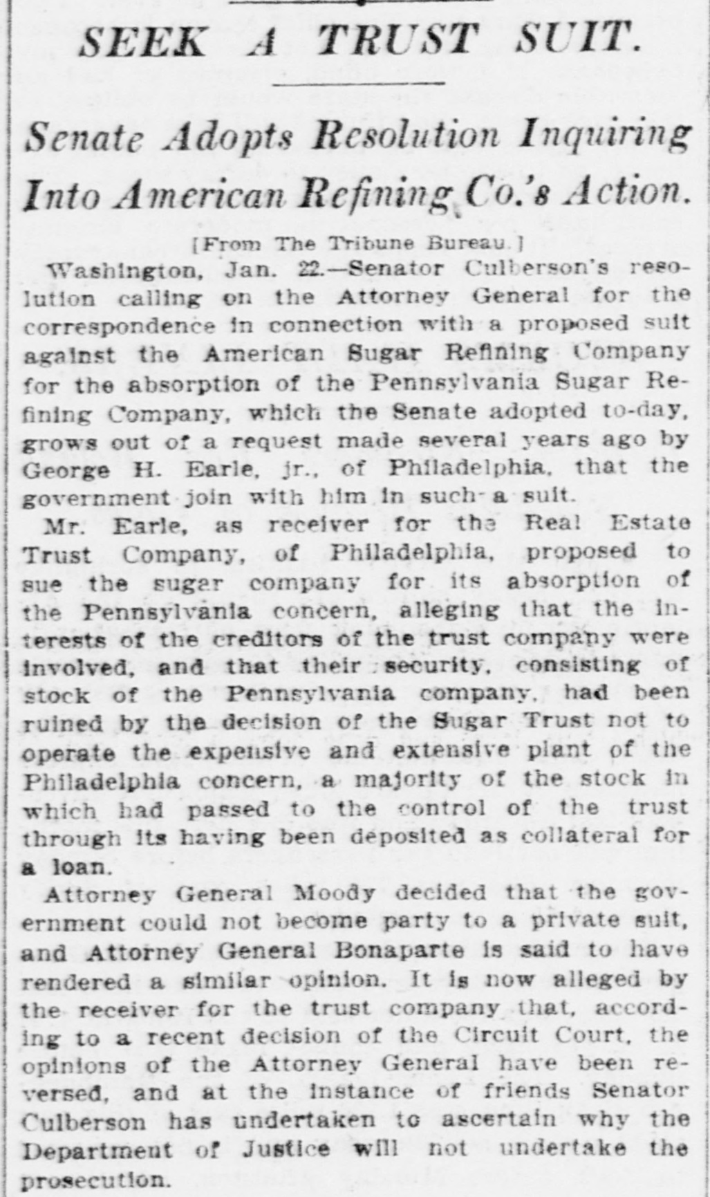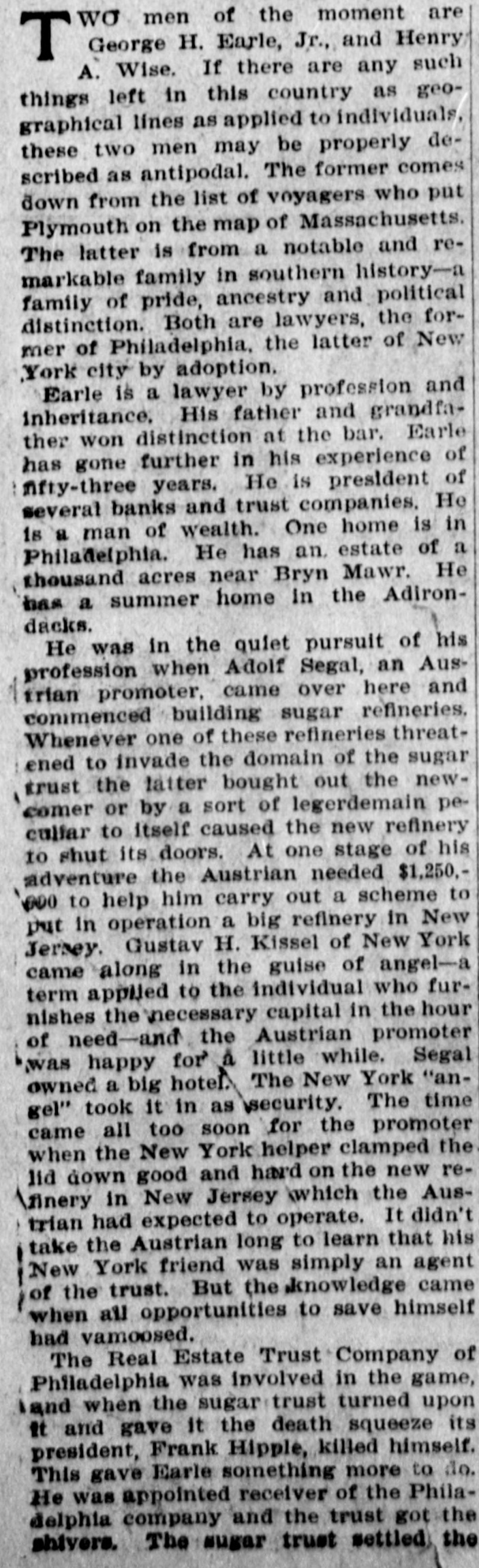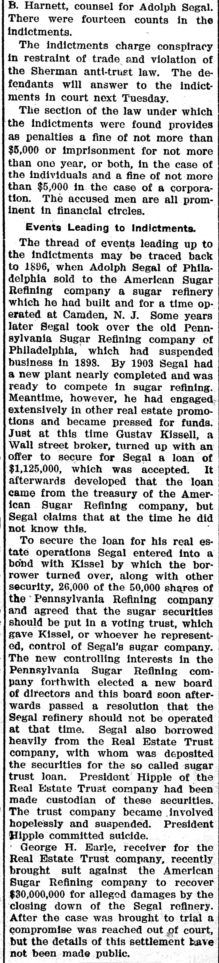 REGGIO AND MESSINA REEL AS EARTHQUAKE SHATTERS WALLS LEFT ON LATE RUINS Population Flee in Panic and Attempt to Seize by Force TempoGOVERNOR BROWN'S BIG SUGAR TRUST rary Houses Built With American Money. INITIAL MESSAGE CALLED TO ANSWER SOLDIERS AND SAILORS ARE HURRIED TO KEEP Document Contains Between Six Six Directors and Two Other InVANDALS FROM LOOTING and Seven Thousand Words and dividuals Were Indicted in New Is Conservative in Its General York by Federal Grand Jury Shocks Began Wednesday Night Tone. Thursday. and Continued Until Early Thursday, Causing the Wildest Governor Brown's initial message to (By Associated Press.) NEW YORK, July 1.-The American the general assembly was transmitted Panic Everywhere. Sugar Refining company, six of its dito the two houses Thursday The rectors and two other individuals were message contains between seven and (Py Associated Press.) indicted by a federal grand jury today eight thousand words, and deals with MESSINA. Sicily, July 1.-Six months on a charge of conspiracy in restraint of after the devastating earthquake of Demany perplexing problems of state actrade. cember 28, which laid waste more than a cording to the views of the chief exThe individuals indicted are Washingscore of cities and towns in Calabria and ecutive. It is a conservative docuton B. Thomas, president of the AmerSicily, and killed 200,000 people, Messina ment, dwelling, in parts, upon the proIcan Sugar Refining company; Arthur and Reggio were this morning again visvisions of the platform upon which Donner, Charles H. Senff and John E. ited by an earthquake which, had they Governor Brown was nominated, and Parsons, of New York: John Mayer, of been built, would have laid them a secreferring frequently to constitutional Morristown, N. J., and George H. Fraond time in ruins. It would seem that provisions of law. zier, of Philadelphia, all of whom are nature is determined to blot out MesThe message in full, follows: directors of the company. sina, but recently one of the fairest cities STATE OF GEORGIA, Indictments also were found against in the world. EXECUTIVE DEPARTMENT. Gustave Kissel and Thomas B. Harnett, It is as yet impossible to accurately deATLANTA, July 1, 1909. counsel for Adolph Segal. There were termine the number of casualties. Some 14 counts in the indictment. To the General Assembly: of the reports are alarming, but they The indictments charge the corporation, At the threshold of the assumption the American Sugar Refining company cannot be verified. of the duties which the call of a free and the persons accused of conspiracy in So far as is positively known. only a people has imposed upon us, it is well restraint of trade in violation of the Sherto remember the constitutional limitafew people were hurt, One woman was man anti-trust law. The defendants will tions of each department of the state killed by a falling wall and a child was answer to the indictments in court next government, and, while maintaining the seriously injured. Tuesday. integrity and inpedence of each withLONG NIGHT OF HORROR. HISTORY OF THE CHARGES. in its proper sphere as the surest safeThe thread of events leading up to toWhile minor shocks have been of freguard of our republican institutions, day's indictments may be traced back to quent occurrence in Sicily in the last six to so generously co-operate that our 1896, when Adolph Segal, of Philadelphia, months, last night they became more seunited labors may enlarge the benesold to the American Sugar Refining comrious and caused considerable alarm. The fits of the public service, and thus pany a suger refinery which he had built most severe quakes came at 7:20 and 7:25 and for a time operated at Camden, N. J. fulfill our obligations as faithful servSome years later Segal took over the this morning, and were similar to the faants of the people. old Pennsylvania Sugar Refining comWhile the executive may recommend tal disturbance of December, being acpany, of Philadelphia, which had suslegislation, the duty and the responsicompanied by the same roaring noises pended business in 1898. By 1903 Segal bility of making laws must. and should that added to the horror of that fateful had started a new plant to compete in rest upon you as the chosen agents of sugar refining. Meantime he had engaged night. the people to give legislative expression extensively in other real estate promoThe population again fled in fear and to their will. tions and became pressed for funds. cries of terror rent the air. In full recognition of this responsiJust at this time Gustave Kissel, a Wall The people hurried to the open places bility. and in a kindly spirit of comity street broker, turned up with an offer to of the city and the surrounding country, and co-operation. I beg to lay before secure for Segal a loan of $1,125,000, you certain matters which to me seem praying to the saints that their lives which was accepted. It afterward developed that the loan came from the might be spared. timely and expedient. treasury of the American Sugar Refining A CONSTRUCTIVE GEORGIA. Gradually, as the confidence of the peocompany, but Segal claims he did not ple returned after last December's catasIn endeavoring to solve the problems know this then. confronting us as the result of events trophe, Messina had acquired a populaTo secure the loan for his real estate reaching back into the years 1905-'06, tion of something over 25,000, but today operations, Segal entered into a bond we must ever have in mind the motto with Kissel by which the borrower turned the people again are in terror and do not words of our great state: "Wisdom, over, along with other securities, 26,000 el-themselves safe, even in the tempojustice, moderation." We must "put, beof the 50,000 shares of the Pennsylvania rary huts erected for their shelter, and Refining company and agreed that the hind us animosity, discard -denunciahave fled to, the country, preferring the sugar securities should be put in a voting tio