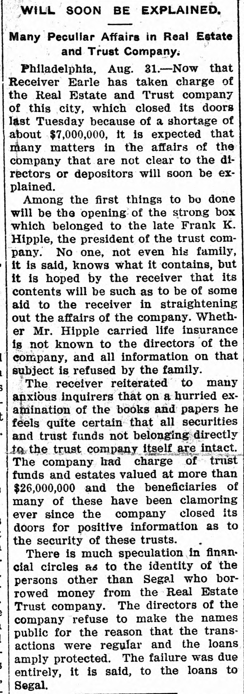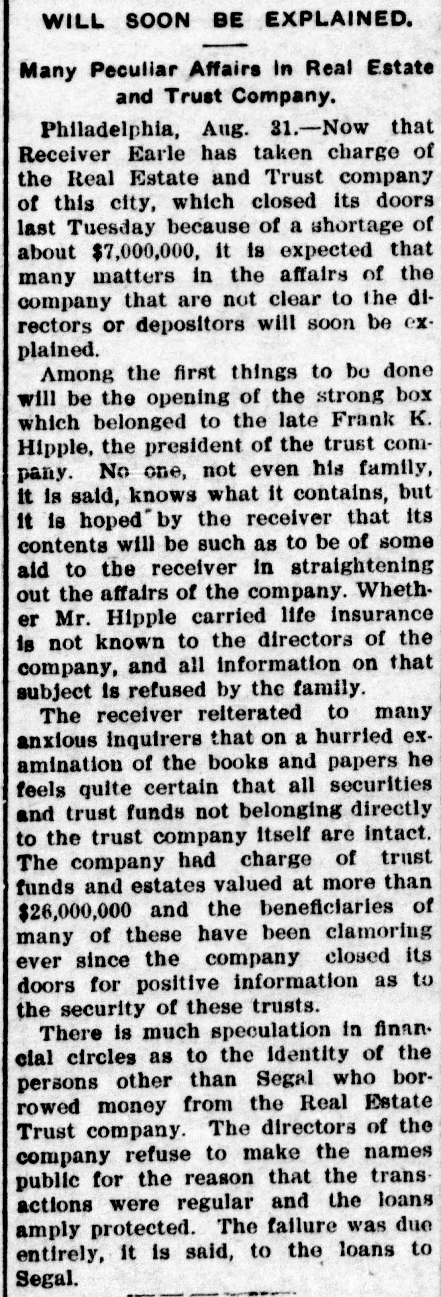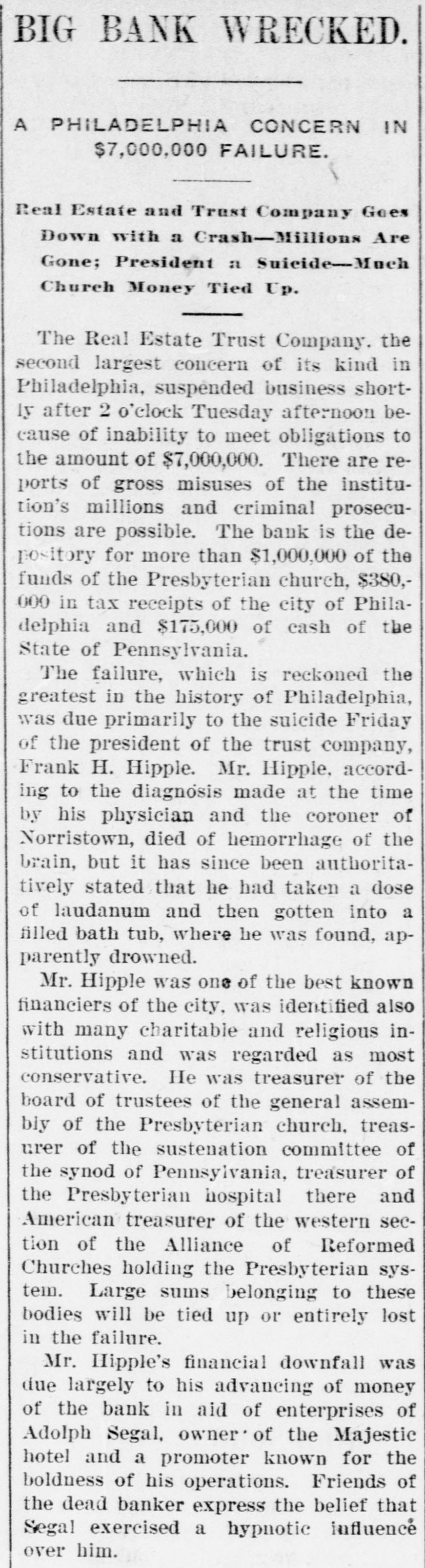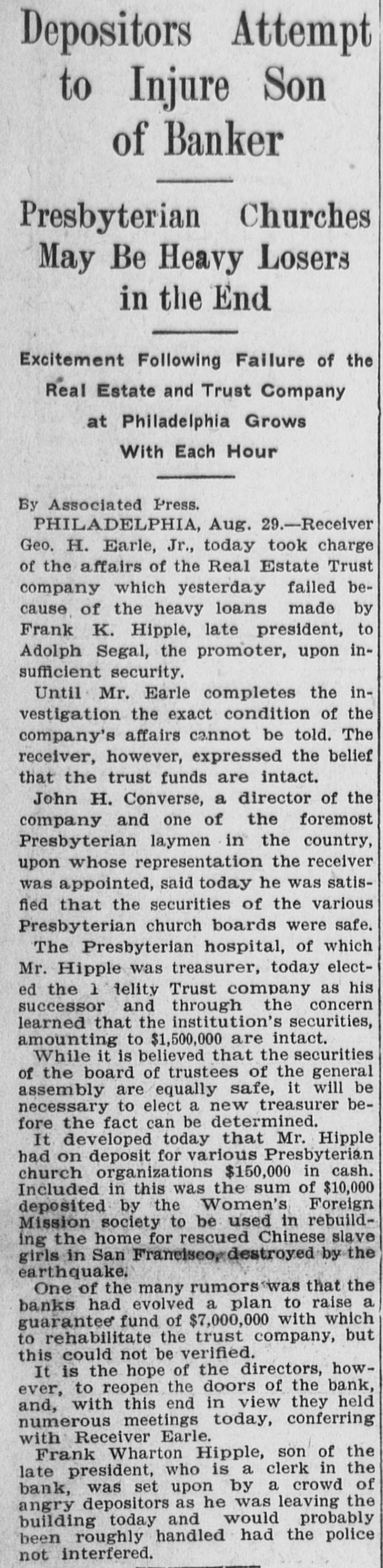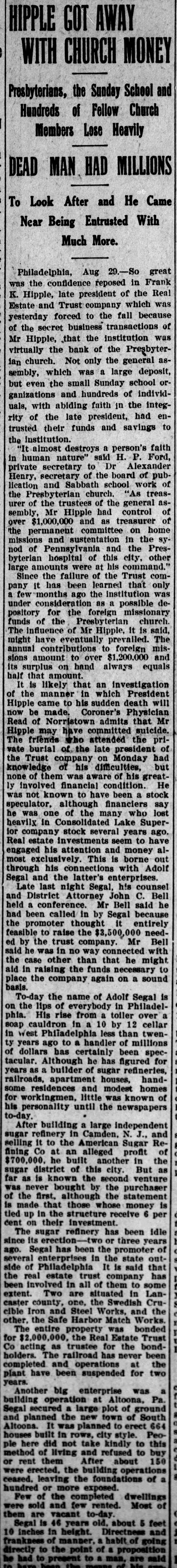 GOT CHURCH WITH Presbyterians, the Sunday School Hundreds of Fellow Church Members Lose Heavily DEAD MAN HAD MILLIONS To Look After and He Came Near Being Entrusted With Much More. Philadelphia, Aug 29 -So great was the confidence reposed in Frank K Hipple, late president of the Real Estate and Trust company which was yesterday forced to the fall because of the secret business transactions of Mr Hipple, that the institution was virtually the bank of the Presbyterian church. Not only the general assembly, which was a large deposit, but even the small Sunday school or ganizations and hundreds of individuals, with abiding faith in the integrity of the late president, had entrusted their funds and savings to the Institution It almost destroys a person's faith in human nature' said H. P. Ford, private secretary to Dr Alexander Henry, secretary of the board of publication and Sabbath school work of the Presbyterian church. 'As treasurer of the trustees of the general assembly, Mr Hipple had control of over $1,000,000 and as treasurer of the permanent committee on home missions and sustentation in the sy nod of Pennsylvania and the Presbyterian hospital of this city, other large amounts were at his command Since the failure of the Trust company it has been learned that only a few months ago the institution was under consideration as a possible depository for the foreign missionary funds of the Presbyterian church The influence of Mr Hipple, it is said might have eventually prevailed. The annual contributions to foreign missions amount to over $1,200.000 and its surplus on hand always equals half that amount It is likely that an investigation of the manner in which President Hipple came to his sudden death will now be made. Coroner's Physician Read of Norristown admits that Mr Hipple may have committed suicide. The friends who attended the private burial of the late president of the Trust company on Monday had knowledge of his difficulties, but none of them was aware of his great ly involved financial condition. He was not known to have been a stock speculator, although financiers say he was one of the many who lost heavily in Consolidated Lake Superfor company stock several years ago. Real estate investments seem to have engaged his attention and money al most exclusively. This is borne out through his connections with Adolf Segal and the latter's enterprises. Late last night Segal his counsel and District Attorney John C. Bell held a conference. Mr Bell said he had been called in by Segal because the promoter thought it entirely feasible to raise the $3,500, 000 need ed by the trust company. Mr Bell said he was in no way connected with the case other than that he might aid in raising the funds necessary to place the company again on a sound basis To-day the name of Adolf Segal is on the lips of everybody in Philadelphia. His rise from a toller over a soap cauldron in a 10 by 12 cellar in West Philadelphia less than twenty years ago to a handler of millions of dollars has certainly been spectacular. Although he has figured for years as a builder of sugar refineries, railroads, apartment houses, handsome residences and modest homes for workingmen, little was known of his personality until the newspapers to-day. After building a large independent sugar refinery in Camden N J. and selling it to the American Sugar Re fining Co at an alleged profit of $700,000. he built another in the sugar district of this city. But as far as is known the second venture was never bought by the purchaser of the first, although the statement is made that those whose money is tled up in the structure receive 6 per cent on their investment. The sugar refinery has been idle since its erection -two or three years ago. Segal has been the promoter of several enterprises in the state outside of Philadelphia It is said that the real estate trust company has been involved in all of them to some extent Two are situated in Lan caster county, one, the Swedish Cru cible Iron and Steel Works. and the other, the Safe Harbor Match Works The entire property was bonded for $2,000,000, the Real Estate Trust Co acting as trustee for the bond holders. The railroad has never been completed and operations at the plant have been suspended for two years. Another big enterprise was building operation at Altoona, Pa Segal secured a large plot of ground and planned the new town of South Altoona. It was planned to erect 664 houses built in rows, city style. People here did not take kindly to this method of living and refused to buy or rent them After about 150 were erected, the building operations ceased. leaving the foundations of a hundred or more exposed Few of the completed dwellings were sold and few rented. Most of them are vacant to-day. Segal is 46 years old. about 5 feet 10 inches in height. Directness and frankness of manner a habit of going a he directly had to the point of proposition to present man. are said