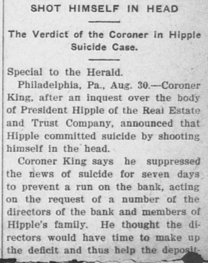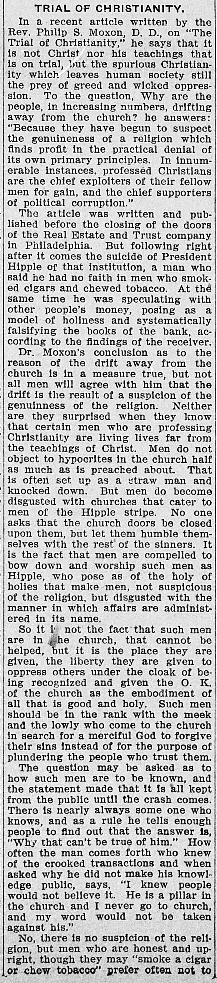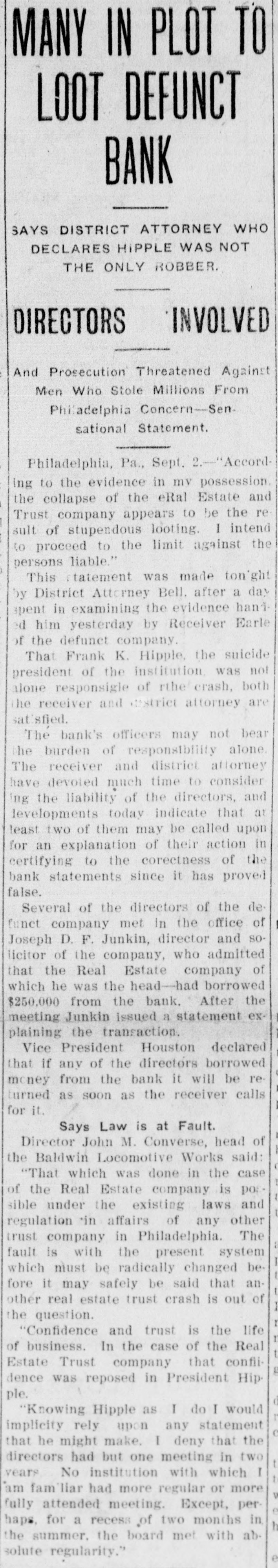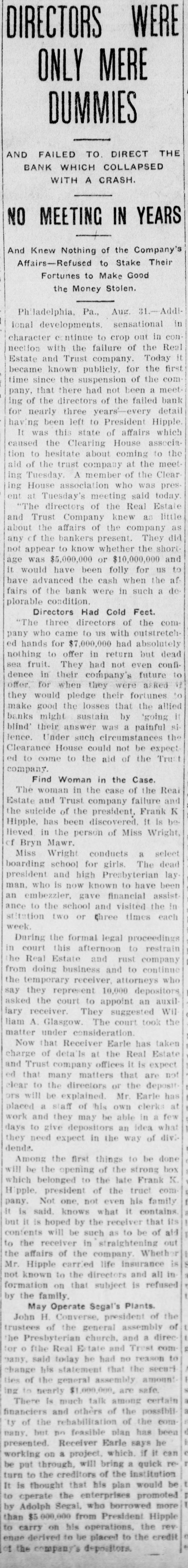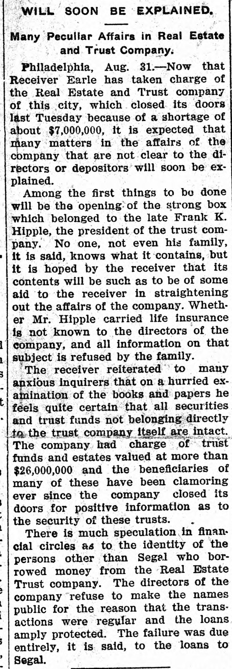 GOT CHURCH WITH Presbyterians, the Sunday School Hundreds of Fellow Church Members Lose Heavily DEAD MAN HAD MILLIONS To Look After and He Came Near Being Entrusted With Much More. Philadelphia, Aug 29 -So great was the confidence reposed in Frank K Hipple, late president of the Real Estate and Trust company which was yesterday forced to the fall because of the secret business transactions of Mr Hipple, that the institution was virtually the bank of the Presbyterian church. Not only the general assembly, which was a large deposit, but even the small Sunday school or ganizations and hundreds of individuals, with abiding faith in the integrity of the late president, had entrusted their funds and savings to the Institution It almost destroys a person's faith in human nature' said H. P. Ford, private secretary to Dr Alexander Henry, secretary of the board of publication and Sabbath school work of the Presbyterian church. 'As treasurer of the trustees of the general assembly, Mr Hipple had control of over $1,000,000 and as treasurer of the permanent committee on home missions and sustentation in the sy nod of Pennsylvania and the Presbyterian hospital of this city, other large amounts were at his command Since the failure of the Trust company it has been learned that only a few months ago the institution was under consideration as a possible depository for the foreign missionary funds of the Presbyterian church The influence of Mr Hipple, it is said might have eventually prevailed. The annual contributions to foreign missions amount to over $1,200.000 and its surplus on hand always equals half that amount It is likely that an investigation of the manner in which President Hipple came to his sudden death will now be made. Coroner's Physician Read of Norristown admits that Mr Hipple may have committed suicide. The friends who attended the private burial of the late president of the Trust company on Monday had knowledge of his difficulties, but none of them was aware of his great ly involved financial condition. He was not known to have been a stock speculator, although financiers say he was one of the many who lost heavily in Consolidated Lake Superfor company stock several years ago. Real estate investments seem to have engaged his attention and money al most exclusively. This is borne out through his connections with Adolf Segal and the latter's enterprises. Late last night Segal his counsel and District Attorney John C. Bell held a conference. Mr Bell said he had been called in by Segal because the promoter thought it entirely feasible to raise the $3,500, 000 need ed by the trust company. Mr Bell said he was in no way connected with the case other than that he might aid in raising the funds necessary to place the company again on a sound basis To-day the name of Adolf Segal is on the lips of everybody in Philadelphia. His rise from a toller over a soap cauldron in a 10 by 12 cellar in West Philadelphia less than twenty years ago to a handler of millions of dollars has certainly been spectacular. Although he has figured for years as a builder of sugar refineries, railroads, apartment houses, handsome residences and modest homes for workingmen, little was known of his personality until the newspapers to-day. After building a large independent sugar refinery in Camden N J. and selling it to the American Sugar Re fining Co at an alleged profit of $700,000. he built another in the sugar district of this city. But as far as is known the second venture was never bought by the purchaser of the first, although the statement is made that those whose money is tled up in the structure receive 6 per cent on their investment. The sugar refinery has been idle since its erection -two or three years ago. Segal has been the promoter of several enterprises in the state outside of Philadelphia It is said that the real estate trust company has been involved in all of them to some extent Two are situated in Lan caster county, one, the Swedish Cru cible Iron and Steel Works. and the other, the Safe Harbor Match Works The entire property was bonded for $2,000,000, the Real Estate Trust Co acting as trustee for the bond holders. The railroad has never been completed and operations at the plant have been suspended for two years. Another big enterprise was building operation at Altoona, Pa Segal secured a large plot of ground and planned the new town of South Altoona. It was planned to erect 664 houses built in rows, city style. People here did not take kindly to this method of living and refused to buy or rent them After about 150 were erected, the building operations ceased. leaving the foundations of a hundred or more exposed Few of the completed dwellings were sold and few rented. Most of them are vacant to-day. Segal is 46 years old. about 5 feet 10 inches in height. Directness and frankness of manner a habit of going a he directly had to the point of proposition to present man. are said