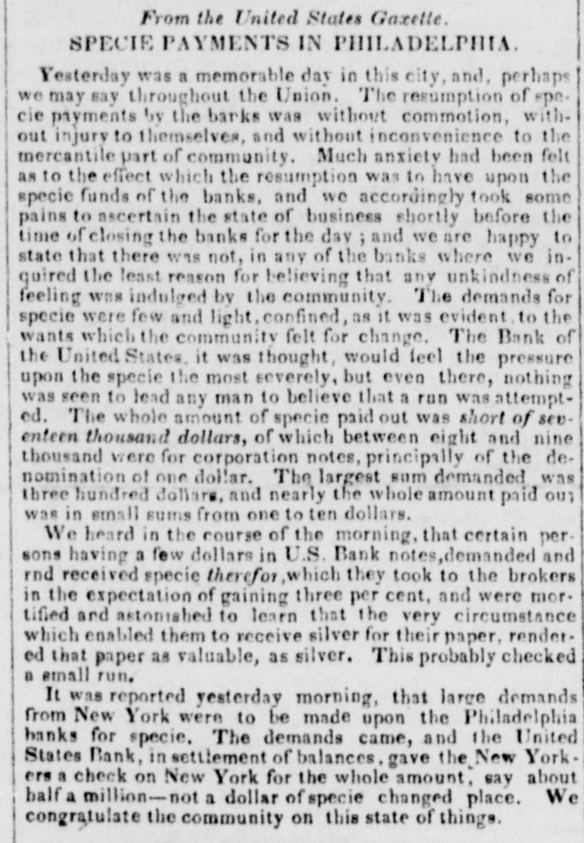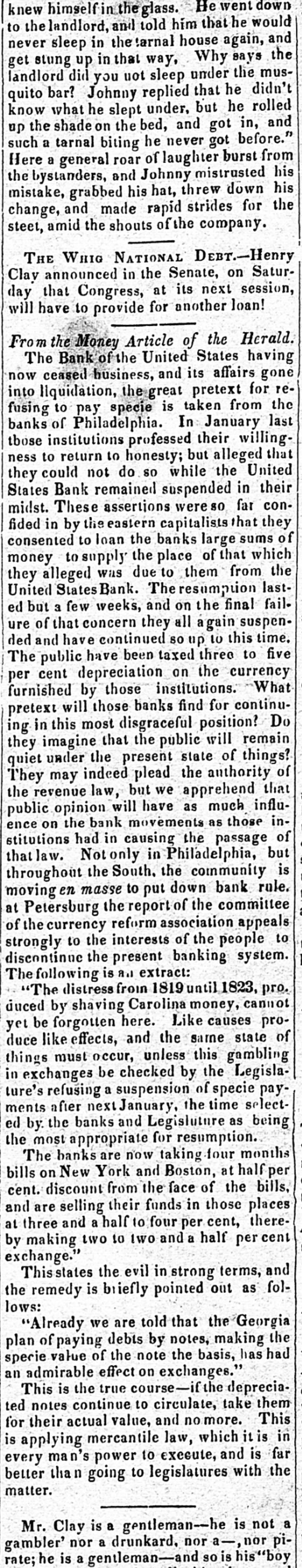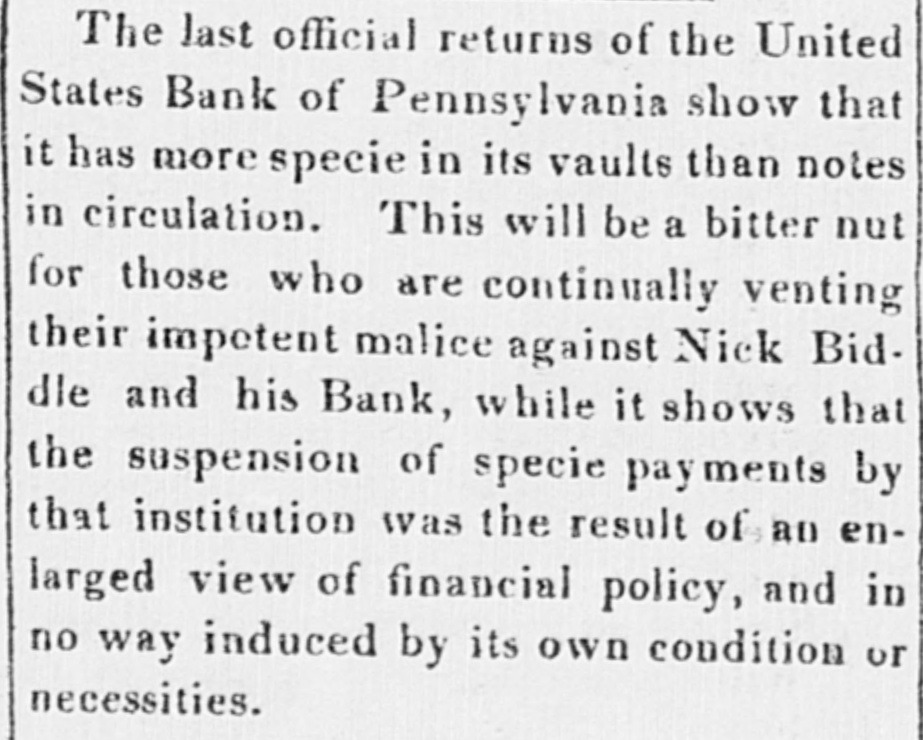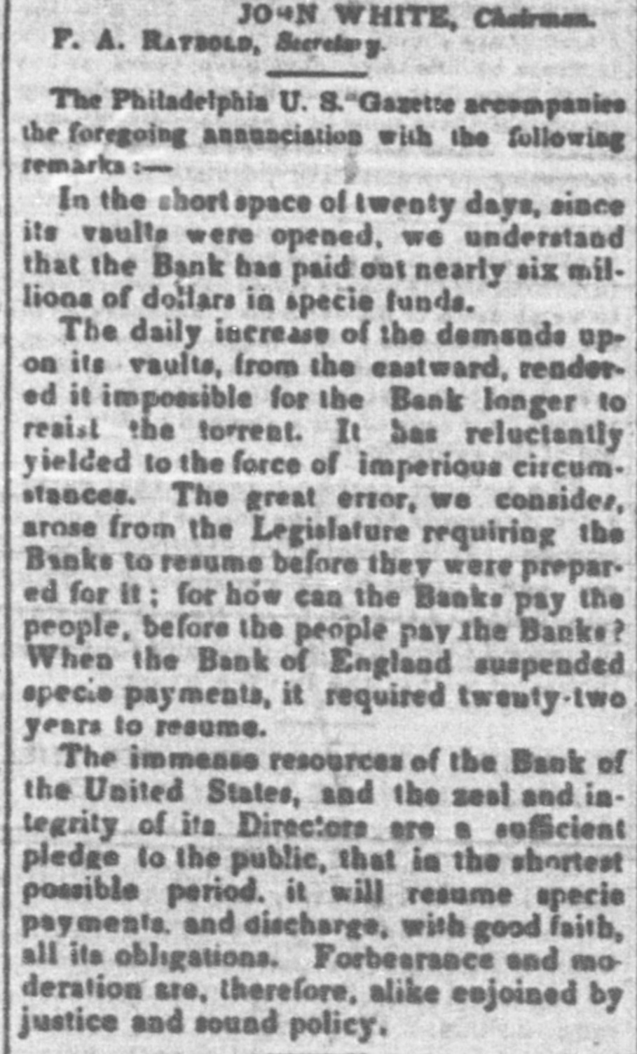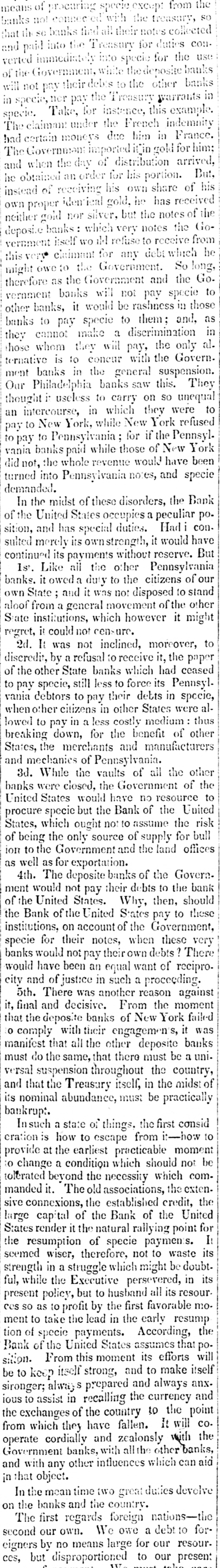 means specie with the except treasury, from the so banks not counce find all their notes collected so into the Treasury for the into specie that and veried the paid immediately banks deposite for duties banks con. use Government, while the banks of the their debts to the other in will not nor the Treasury in for instance, this specie, pay Take, pay warrants indemnity example. specie. under the French France. The claimant moneys due him in for him: had certain Government imported i(in gold of distribution an order for his of his own and he The obtained when the receiving day portion. share received arrived, But, his instead of iden' gold, be has of the own proper not silver, but the notes banks which very notes itself wo id refuse to vernment deposite neither gold receive which the from Go- he claimant for any debt So long, this very owe to the Government. the Go. might as the Government and banks will not pay in it would be rashness to pay specie to them; other vernment therefore banks, specie and, those as to in banks cannot make a discrimination al. they whom they will pay, the Govern- only hose is to concur with in the general ternative ment banks the this. suspension. They Philadelphia banks saw unequal thought Our it useless to carry on so were to intercourse, in which they refused pay an to New York, while New for if the PennsylPennsylvania ; York New York to pay banks to paid while those of have been vania the whole revenue would specie turned did not, into Pennsylvania notes, and demanded. the midst of these disorders, the Bank In the United States occupies a peculiar Had con. poof and has special duties. sulted sition, merely its ownstrength, it reserve. would have But continued its payments without Like all the other Pennsylvania of our 1st. it owed a duty to the citizens stand banks. State and it was not disposed the to other own from a general movement of might aloof State institutions, which however it regret, it could not consure. to 2d. It was not inclined, moreover, the a refusal to receive it, paper other State banks which of still less to force discredit, pay the specie, by debts its had in Pennsyl- specie, ceased to debtors to pay their were alvania other citizens in other States thus when to in a less costly medium of down, for the the merchants and lowed States, breaking pay benefit manufacturers other and mechanics of Pennsylvania. While the vaults of all the of other the 3d. closed, the Government would have no but the Bank of banks United procure were States specie resource the the United risk to which ought not to assume for bull States, the only source of supply offices of ion being to the Government and the land as 4th. well The as for deposite exportation. banks of the the Govern- bank would not pay their debts to should ment the United States. Why, then, these of Bank of the United States pay to the institutions, on account of the Government, for their notes, when these ? There very specie banks would not pay their own debts reciprowould have been an equal want of city and of justice in such a proceeding. There was another reason moment against 5th. and decisive. From the failed it, final the deposite banks of New York it was that comply with their engagemen's banks o that all the other deposite the same, that there must a throughout versal must manifest do suspension the the be country, midst uni- of that the Treasury itself, in and its nominal abundance, must be practically bankrupt. Insuch a state of things. the first i:-how consid is how to escape from moment to cration at the earliest practicable not be provide a condition which should to change the necessity which comit. The old associations, the the manded tolerated connexions, beyond established credit, the United extensive capital of the Bank of the for large render it the natural rallying point It States resumption of specie payments. waste seemed the wiser, therefore, not to be doubt- its strength in a struggle which might in its while the Executive persevered, all its resourful, policy, but to husband favorable mopresent to profit by the first ces so to as take the lead in the early resump the ment of specie payments. According, that tion of the United States assumes efforts will poBank From this moment its itself silion. itself strong, and to make anxbe to keep S prepared and always and sironger; to assist alway in recalling the currency to the point ious exchanges of the country It will co. the which they have fallen. with the from cordially and zealonsly banks, operate banks, with all the other aid and Government with any other influences which can in that object. In the mean time two great duties devolve banks and the country. on the first regards foreign nations-the to forThe our own. We owe a debt resoursecond by no means large for our present ccs, eigners but disproportioned to our