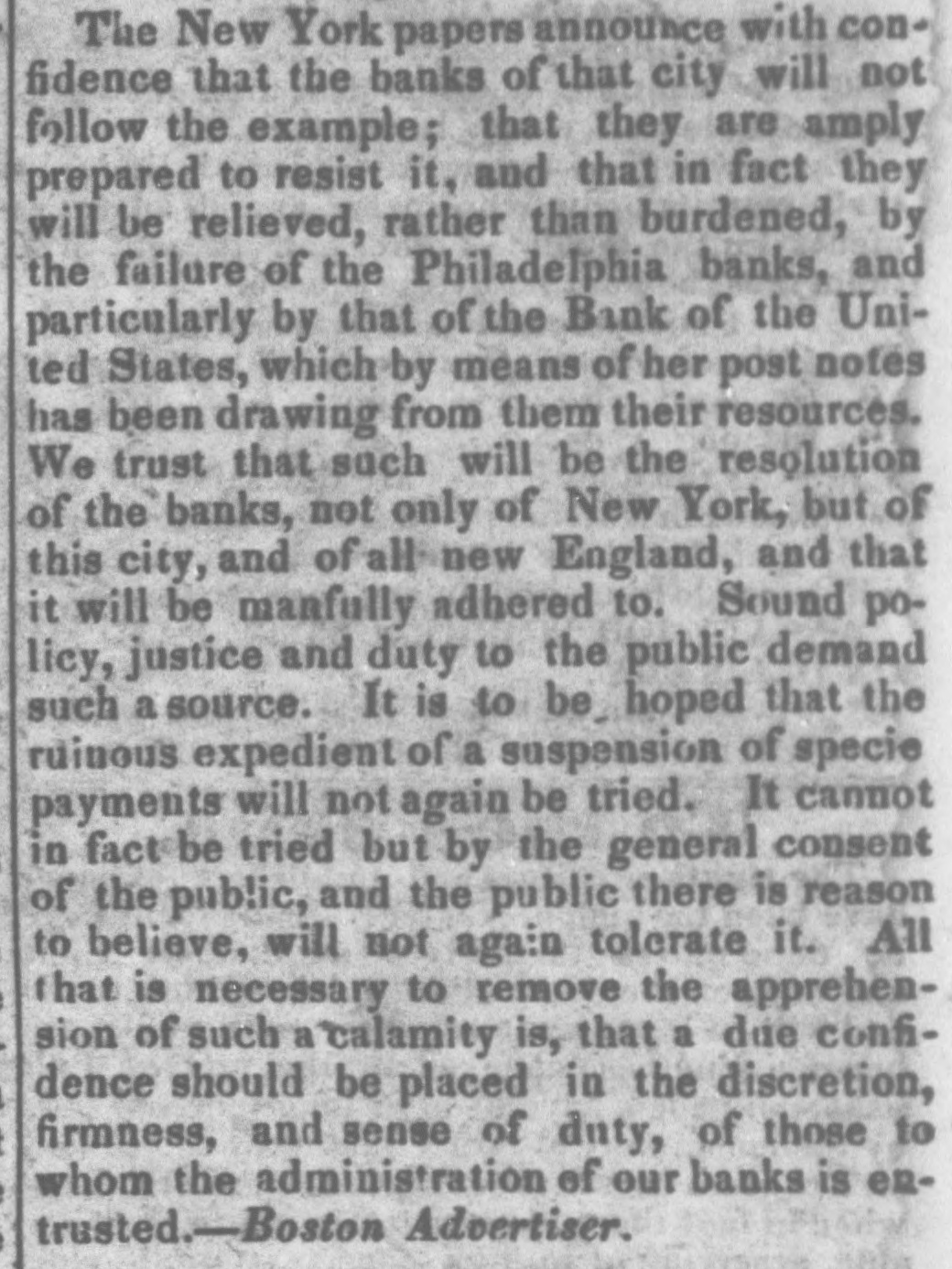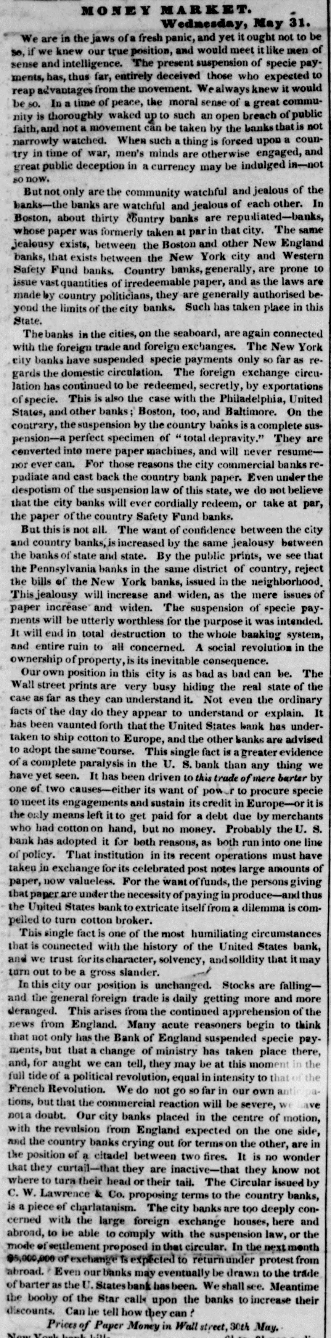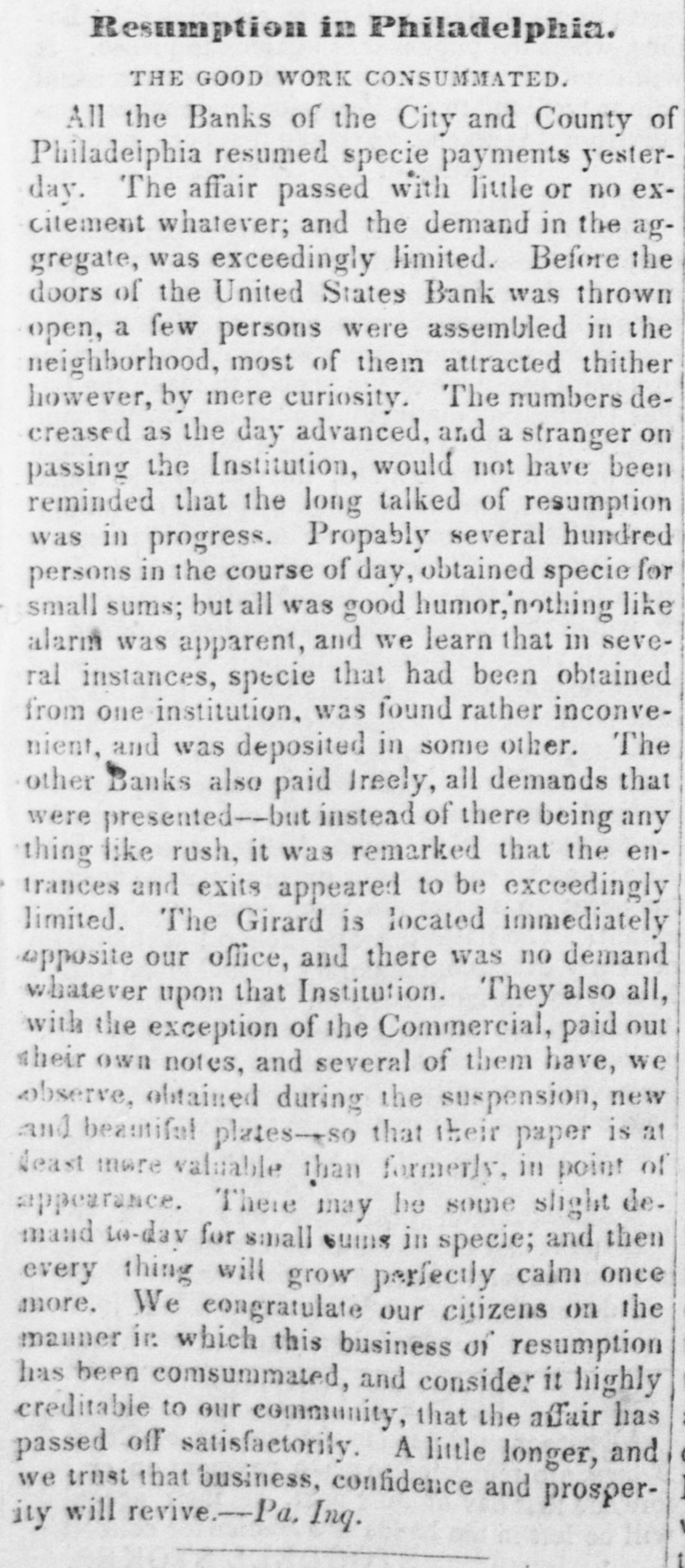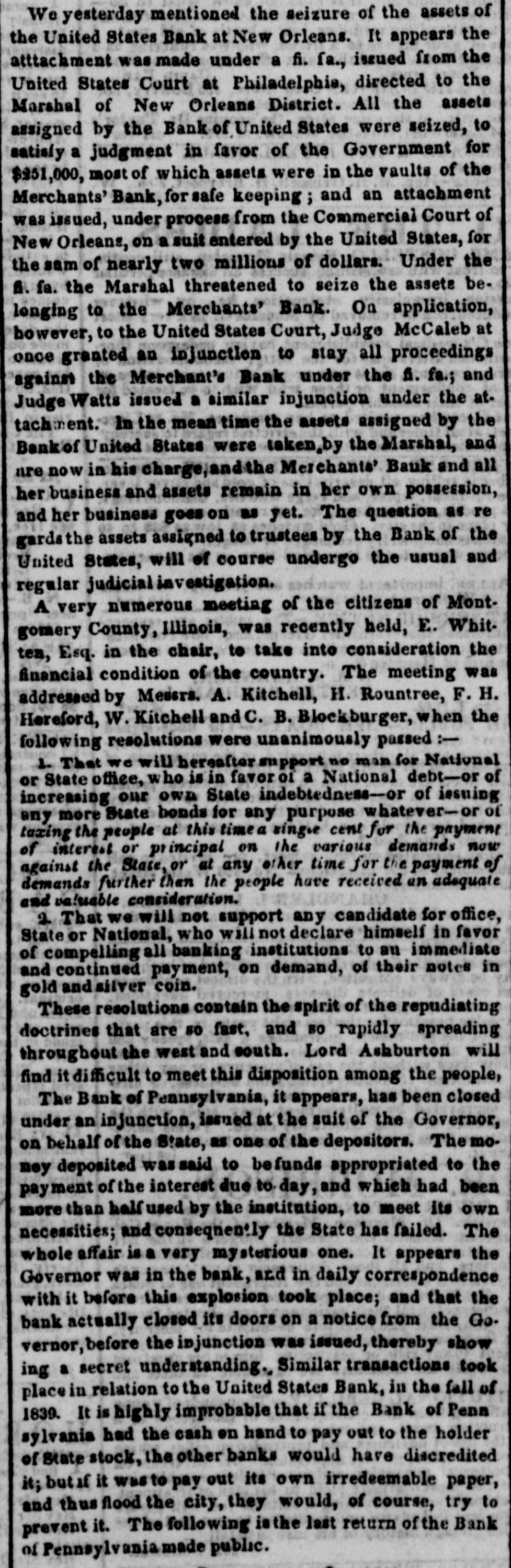 means specie with the except treasury, from the so banks not counce find all their notes collected so into the Treasury for the into specie that and veried the paid immediately banks deposite for duties banks con. use Government, while the banks of the their debts to the other in will not nor the Treasury in for instance, this specie, pay Take, pay warrants indemnity example. specie. under the French France. The claimant moneys due him in for him: had certain Government imported i(in gold of distribution an order for his of his own and he The obtained when the receiving day portion. share received arrived, But, his instead of iden' gold, be has of the own proper not silver, but the notes banks which very notes itself wo id refuse to vernment deposite neither gold receive which the from Go- he claimant for any debt So long, this very owe to the Government. the Go. might as the Government and banks will not pay in it would be rashness to pay specie to them; other vernment therefore banks, specie and, those as to in banks cannot make a discrimination al. they whom they will pay, the Govern- only hose is to concur with in the general ternative ment banks the this. suspension. They Philadelphia banks saw unequal thought Our it useless to carry on so were to intercourse, in which they refused pay an to New York, while New for if the PennsylPennsylvania ; York New York to pay banks to paid while those of have been vania the whole revenue would specie turned did not, into Pennsylvania notes, and demanded. the midst of these disorders, the Bank In the United States occupies a peculiar Had con. poof and has special duties. sulted sition, merely its ownstrength, it reserve. would have But continued its payments without Like all the other Pennsylvania of our 1st. it owed a duty to the citizens stand banks. State and it was not disposed the to other own from a general movement of might aloof State institutions, which however it regret, it could not consure. to 2d. It was not inclined, moreover, the a refusal to receive it, paper other State banks which of still less to force discredit, pay the specie, by debts its had in Pennsyl- specie, ceased to debtors to pay their were alvania other citizens in other States thus when to in a less costly medium of down, for the the merchants and lowed States, breaking pay benefit manufacturers other and mechanics of Pennsylvania. While the vaults of all the of other the 3d. closed, the Government would have no but the Bank of banks United procure were States specie resource the the United risk to which ought not to assume for bull States, the only source of supply offices of ion being to the Government and the land as 4th. well The as for deposite exportation. banks of the the Govern- bank would not pay their debts to should ment the United States. Why, then, these of Bank of the United States pay to the institutions, on account of the Government, for their notes, when these ? There very specie banks would not pay their own debts reciprowould have been an equal want of city and of justice in such a proceeding. There was another reason moment against 5th. and decisive. From the failed it, final the deposite banks of New York it was that comply with their engagemen's banks o that all the other deposite the same, that there must a throughout versal must manifest do suspension the the be country, midst uni- of that the Treasury itself, in and its nominal abundance, must be practically bankrupt. Insuch a state of things. the first i:-how consid is how to escape from moment to cration at the earliest practicable not be provide a condition which should to change the necessity which comit. The old associations, the the manded tolerated connexions, beyond established credit, the United extensive capital of the Bank of the for large render it the natural rallying point It States resumption of specie payments. waste seemed the wiser, therefore, not to be doubt- its strength in a struggle which might in its while the Executive persevered, all its resourful, policy, but to husband favorable mopresent to profit by the first ces so to as take the lead in the early resump the ment of specie payments. According, that tion of the United States assumes efforts will poBank From this moment its itself silion. itself strong, and to make anxbe to keep S prepared and always and sironger; to assist alway in recalling the currency to the point ious exchanges of the country It will co. the which they have fallen. with the from cordially and zealonsly banks, operate banks, with all the other aid and Government with any other influences which can in that object. In the mean time two great duties devolve banks and the country. on the first regards foreign nations-the to forThe our own. We owe a debt resoursecond by no means large for our present ccs, eigners but disproportioned to our