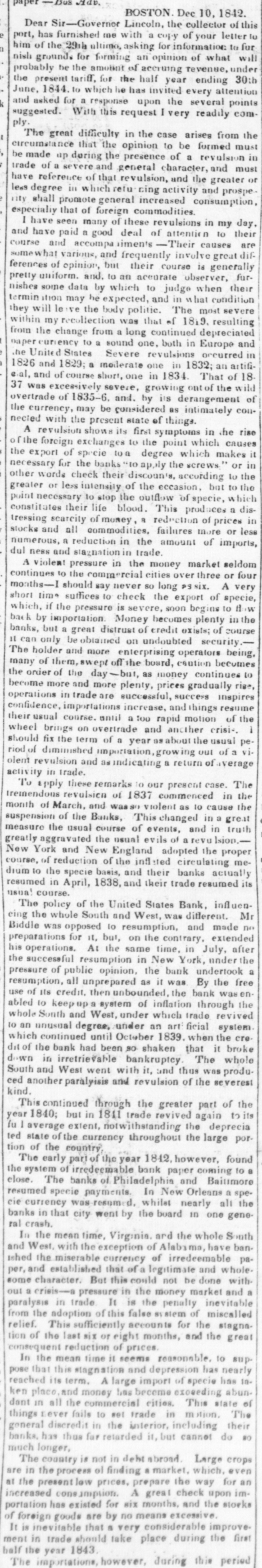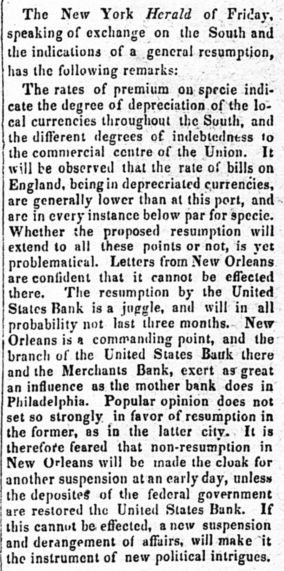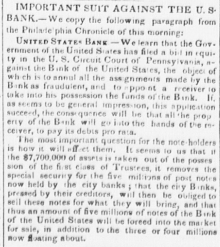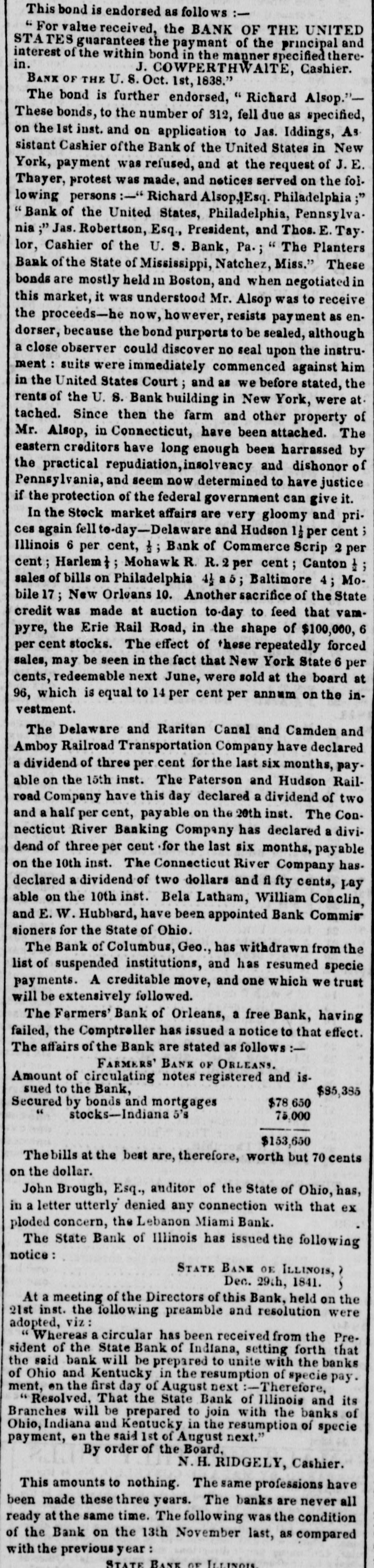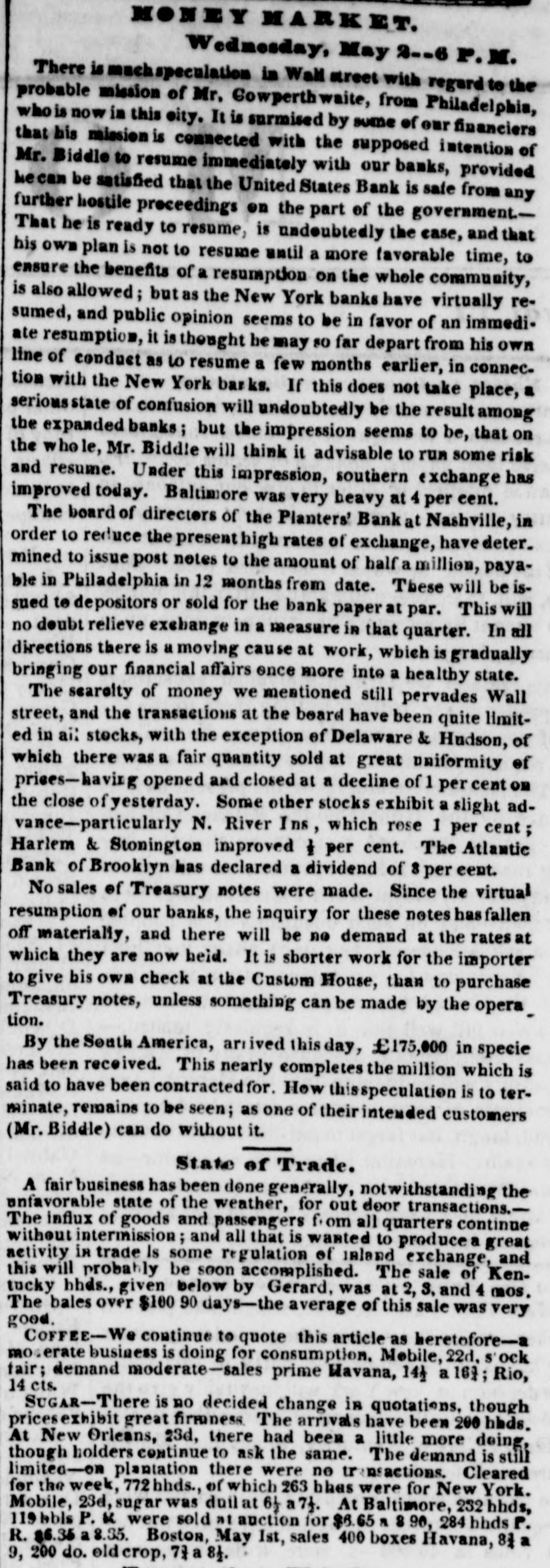 means specie with the except treasury, from the so banks not counce find all their notes collected so into the Treasury for the into specie that and veried the paid immediately banks deposite for duties banks con. use Government, while the banks of the their debts to the other in will not nor the Treasury in for instance, this specie, pay Take, pay warrants indemnity example. specie. under the French France. The claimant moneys due him in for him: had certain Government imported i(in gold of distribution an order for his of his own and he The obtained when the receiving day portion. share received arrived, But, his instead of iden' gold, be has of the own proper not silver, but the notes banks which very notes itself wo id refuse to vernment deposite neither gold receive which the from Go- he claimant for any debt So long, this very owe to the Government. the Go. might as the Government and banks will not pay in it would be rashness to pay specie to them; other vernment therefore banks, specie and, those as to in banks cannot make a discrimination al. they whom they will pay, the Govern- only hose is to concur with in the general ternative ment banks the this. suspension. They Philadelphia banks saw unequal thought Our it useless to carry on so were to intercourse, in which they refused pay an to New York, while New for if the PennsylPennsylvania ; York New York to pay banks to paid while those of have been vania the whole revenue would specie turned did not, into Pennsylvania notes, and demanded. the midst of these disorders, the Bank In the United States occupies a peculiar Had con. poof and has special duties. sulted sition, merely its ownstrength, it reserve. would have But continued its payments without Like all the other Pennsylvania of our 1st. it owed a duty to the citizens stand banks. State and it was not disposed the to other own from a general movement of might aloof State institutions, which however it regret, it could not consure. to 2d. It was not inclined, moreover, the a refusal to receive it, paper other State banks which of still less to force discredit, pay the specie, by debts its had in Pennsyl- specie, ceased to debtors to pay their were alvania other citizens in other States thus when to in a less costly medium of down, for the the merchants and lowed States, breaking pay benefit manufacturers other and mechanics of Pennsylvania. While the vaults of all the of other the 3d. closed, the Government would have no but the Bank of banks United procure were States specie resource the the United risk to which ought not to assume for bull States, the only source of supply offices of ion being to the Government and the land as 4th. well The as for deposite exportation. banks of the the Govern- bank would not pay their debts to should ment the United States. Why, then, these of Bank of the United States pay to the institutions, on account of the Government, for their notes, when these ? There very specie banks would not pay their own debts reciprowould have been an equal want of city and of justice in such a proceeding. There was another reason moment against 5th. and decisive. From the failed it, final the deposite banks of New York it was that comply with their engagemen's banks o that all the other deposite the same, that there must a throughout versal must manifest do suspension the the be country, midst uni- of that the Treasury itself, in and its nominal abundance, must be practically bankrupt. Insuch a state of things. the first i:-how consid is how to escape from moment to cration at the earliest practicable not be provide a condition which should to change the necessity which comit. The old associations, the the manded tolerated connexions, beyond established credit, the United extensive capital of the Bank of the for large render it the natural rallying point It States resumption of specie payments. waste seemed the wiser, therefore, not to be doubt- its strength in a struggle which might in its while the Executive persevered, all its resourful, policy, but to husband favorable mopresent to profit by the first ces so to as take the lead in the early resump the ment of specie payments. According, that tion of the United States assumes efforts will poBank From this moment its itself silion. itself strong, and to make anxbe to keep S prepared and always and sironger; to assist alway in recalling the currency to the point ious exchanges of the country It will co. the which they have fallen. with the from cordially and zealonsly banks, operate banks, with all the other aid and Government with any other influences which can in that object. In the mean time two great duties devolve banks and the country. on the first regards foreign nations-the to forThe our own. We owe a debt resoursecond by no means large for our present ccs, eigners but disproportioned to our