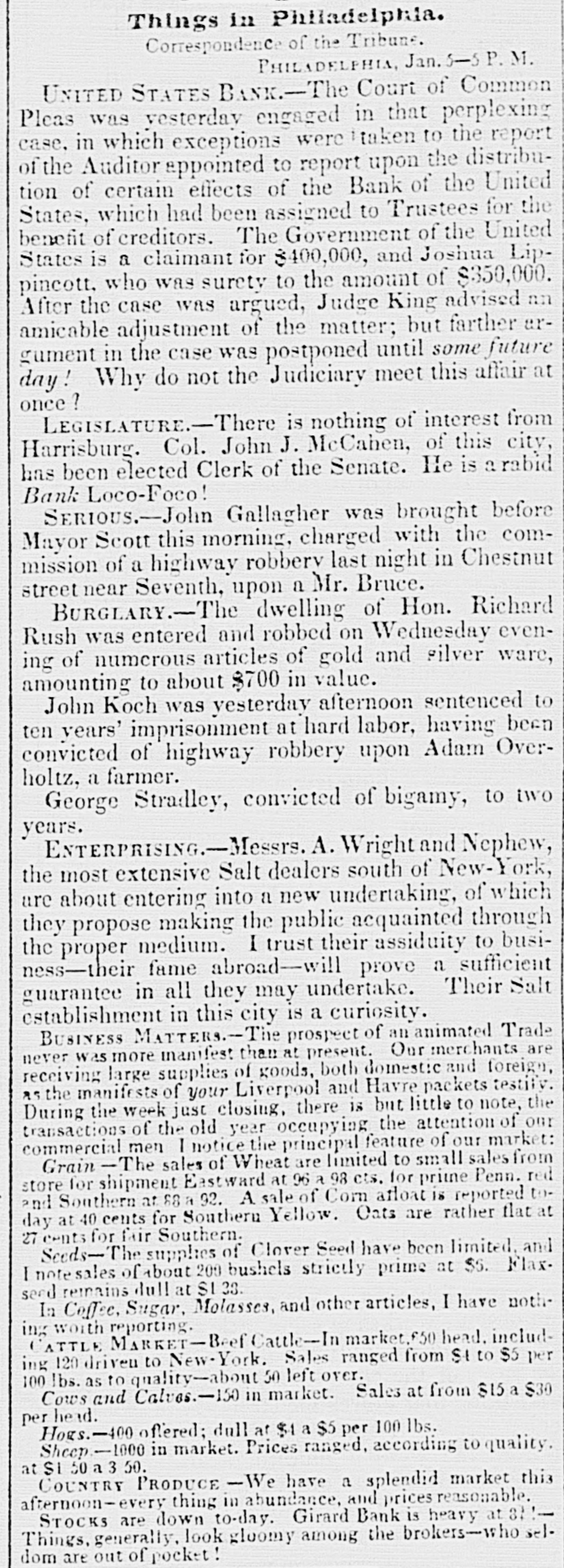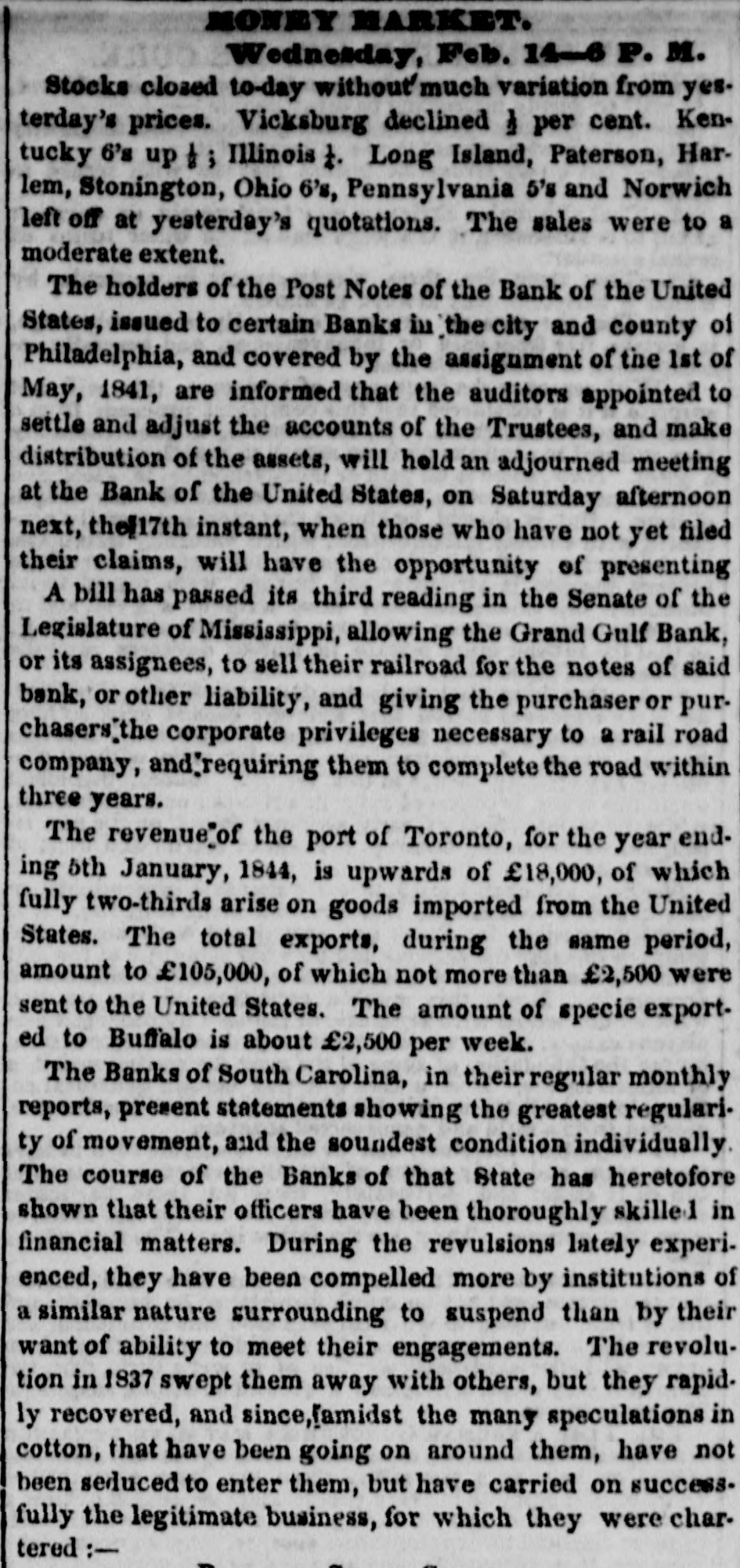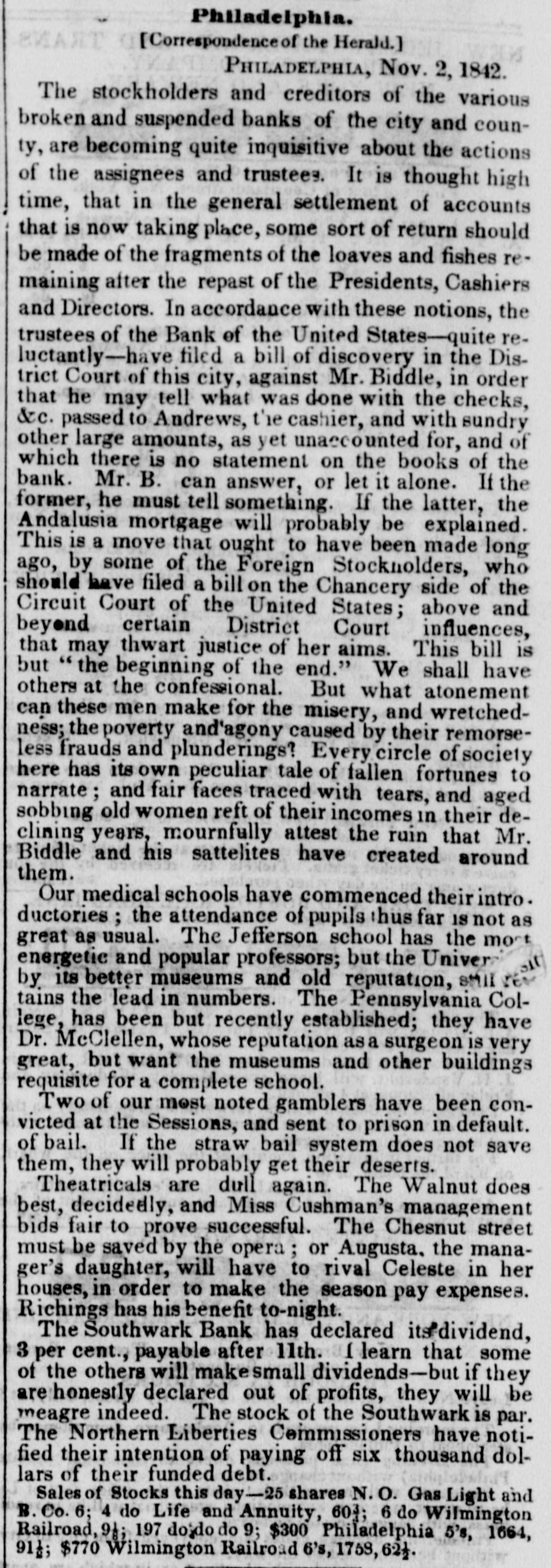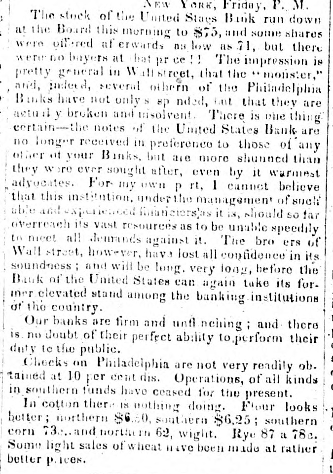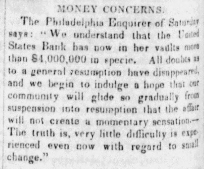 means specie with the except treasury, from the so banks not counce find all their notes collected so into the Treasury for the into specie that and veried the paid immediately banks deposite for duties banks con. use Government, while the banks of the their debts to the other in will not nor the Treasury in for instance, this specie, pay Take, pay warrants indemnity example. specie. under the French France. The claimant moneys due him in for him: had certain Government imported i(in gold of distribution an order for his of his own and he The obtained when the receiving day portion. share received arrived, But, his instead of iden' gold, be has of the own proper not silver, but the notes banks which very notes itself wo id refuse to vernment deposite neither gold receive which the from Go- he claimant for any debt So long, this very owe to the Government. the Go. might as the Government and banks will not pay in it would be rashness to pay specie to them; other vernment therefore banks, specie and, those as to in banks cannot make a discrimination al. they whom they will pay, the Govern- only hose is to concur with in the general ternative ment banks the this. suspension. They Philadelphia banks saw unequal thought Our it useless to carry on so were to intercourse, in which they refused pay an to New York, while New for if the PennsylPennsylvania ; York New York to pay banks to paid while those of have been vania the whole revenue would specie turned did not, into Pennsylvania notes, and demanded. the midst of these disorders, the Bank In the United States occupies a peculiar Had con. poof and has special duties. sulted sition, merely its ownstrength, it reserve. would have But continued its payments without Like all the other Pennsylvania of our 1st. it owed a duty to the citizens stand banks. State and it was not disposed the to other own from a general movement of might aloof State institutions, which however it regret, it could not consure. to 2d. It was not inclined, moreover, the a refusal to receive it, paper other State banks which of still less to force discredit, pay the specie, by debts its had in Pennsyl- specie, ceased to debtors to pay their were alvania other citizens in other States thus when to in a less costly medium of down, for the the merchants and lowed States, breaking pay benefit manufacturers other and mechanics of Pennsylvania. While the vaults of all the of other the 3d. closed, the Government would have no but the Bank of banks United procure were States specie resource the the United risk to which ought not to assume for bull States, the only source of supply offices of ion being to the Government and the land as 4th. well The as for deposite exportation. banks of the the Govern- bank would not pay their debts to should ment the United States. Why, then, these of Bank of the United States pay to the institutions, on account of the Government, for their notes, when these ? There very specie banks would not pay their own debts reciprowould have been an equal want of city and of justice in such a proceeding. There was another reason moment against 5th. and decisive. From the failed it, final the deposite banks of New York it was that comply with their engagemen's banks o that all the other deposite the same, that there must a throughout versal must manifest do suspension the the be country, midst uni- of that the Treasury itself, in and its nominal abundance, must be practically bankrupt. Insuch a state of things. the first i:-how consid is how to escape from moment to cration at the earliest practicable not be provide a condition which should to change the necessity which comit. The old associations, the the manded tolerated connexions, beyond established credit, the United extensive capital of the Bank of the for large render it the natural rallying point It States resumption of specie payments. waste seemed the wiser, therefore, not to be doubt- its strength in a struggle which might in its while the Executive persevered, all its resourful, policy, but to husband favorable mopresent to profit by the first ces so to as take the lead in the early resump the ment of specie payments. According, that tion of the United States assumes efforts will poBank From this moment its itself silion. itself strong, and to make anxbe to keep S prepared and always and sironger; to assist alway in recalling the currency to the point ious exchanges of the country It will co. the which they have fallen. with the from cordially and zealonsly banks, operate banks, with all the other aid and Government with any other influences which can in that object. In the mean time two great duties devolve banks and the country. on the first regards foreign nations-the to forThe our own. We owe a debt resoursecond by no means large for our present ccs, eigners but disproportioned to our