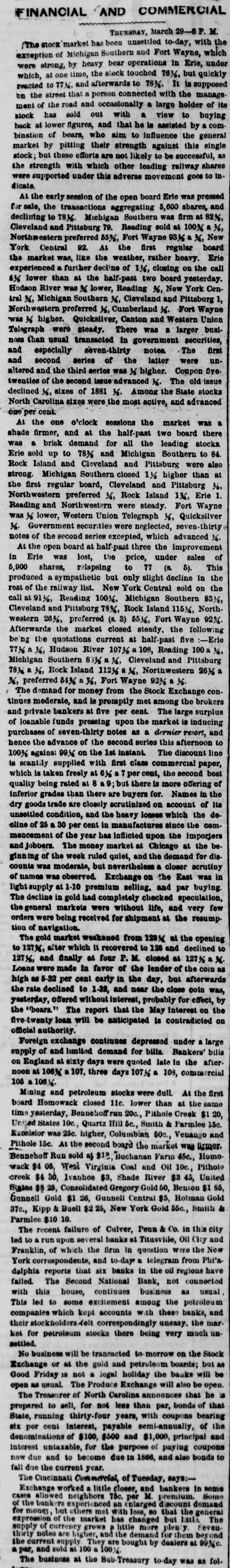 AND FINANCIAL and exception Erie, under heavy were strong, stock the time, to It /The of Michigan bear touched 761/2. in but quickly supposed the street be the manage and the of road mont occasionally out with sold to view reacted which, to 77% that and afterwards person large with holder buying of its is he that by com back assisted of the bears, general their strength be stock at has lower figures, who and aim to influence against this single successful, the strength were this under bination by pitting are not likely leading to railway shares to in adverse supported market stock; but these with efforts which other movement goes was Erie board open the and sale, shares, Michigan sold Reading dicate At the early transactions session of the aggregating Southern was 5,600 firm 100% at 82%, 3/6, New % the heavy. declining Cleveland for to and 783/6 Pittsburg preferred 553, 79. Fort first Wayne regular 931/1 board Erie than Northwestern Central 92. the At weather, rather closing on the call York market was, like decline of 11/6, two board yesterday Cenand the experienced further at the half-past Reading % New Pittsburg York 1, western Northwest Hudson 41/6 lower River was Southern % lower, 1/6, Cleveland 1/6. Fort Wayne Union Quicksilver, Telegraph tral % Michigan preferred 1/6, Cumberland Canton and Western larger busithan ness usual transacted securities, and notes. especially given-thirty was 1/6 higher. were steady. There in The first unwere latter the series Are. Coupon old issue The declined North sixes Carolina and altered second and the Among the State advanced stocks one per the twenties of 1/6, the sixes of were 1881 the most active, and was sessions market board there was to up the cent. one o'clock the half-past two leading stocks 84. and At firmer, and at for all the Southern to also strong. higher Michigan shade a brisk demand 78% and Michigan Pittsburg were than at board, Island Northwestern Erie Rock sold Island and Southern Cleveland Cleveland closed 1 1/2 and Pittsburg 1%, Erie 3/a. 1. Wayne was 1/6 lower, the first regular preferred 1/4, were Rock steady 1/6, Fort Quicksilver thirty securities Government which series Reading and Western Northwestern Union Telegraph neglected, advanced seven 1/4. the At the open improvement the Erie was lost, 77 to relapsing notes 1/2. of the second board at price, three 5). sales This in the slight decline produced the on Michigan 5,900 in shares, a sympathetic New but York only Central Southern sold 83 1/2, North 26%, western market rest of 91 1/2, the railway Reading 10014. 78% Rock Island Fort 115% Wayne following 92% the being half-past call Cleveland at and Pittsburg preferred closed 3) 55% steady, the five Erie 1/4, 100 773/a River Hudson Southern Cleveland Afterwards quotations the current 108, Reading and Pittsburg 7836 3/a, 26 1/2 3/6, The the conand the tinues Michigan Rock Island 923/2 Exchat brokers moderate, and five cent. per bankers private of is the funds upon market loanable % preferred demand 5136 for money is promptly from met among The large inducing surplus pressing of as and thirty seven notes dernier resort, purchases of the the this second geries hence advance afternoon the 1st on line The 9914 100% discount instant against with first class supplied paper, best of offering inferior grades are dry trade goods closely is scantily is taken freely but there for. Names in of the its and the heavy losses condition, quality which being rated than there are scrutinized buyers on which account the de in the cent comsince manufactures the upon importers and be the jobbers. the of ruled week ginning unsettled of 25 a 30 per has Inflicted Chicago at for disa but was counts moderate, nevertheleas oline mencement of the money year market quiet, and the closer scrutiny in was the East observed Exchange and light par selling. buying in The gold decline speculation. the markets without general at were the being orders received shipment of names supply was at 1-10 had premium completely checked life, and very resump- few of tion navigation the from market 128% opening to 128 and declined recovered a at 1273 and % 127% finally in of made favor in the but day, The 127%, gold after which at 11 four the closed lender of the afterwards COID as coin was, close by the The "bears. high Loans as were 5-32 per cent to 1-33, early Interest, and near probably the Interest for effect, on the be loan will twenty official five authority. yesterday, the rate declined offered without report anticipated that the May is contradicted on under large Foreign exchange continues depressed and bills. bills limited demand Bankers in were late the afterquoted at 106% noon 103, 105 10616 supply on England of at sixty 107, days three 107% and the At first Mining stocks petroleum board 11c. the than closed Homowack time $1 20, Creek Pithole weaterday, States 10c., United 15c. Smith Quartz Parmlee was 25c. and 50c., Excelsior higher, Venango Columbian the At the second was board armer. $19, HomoBuchanan $4 Oil 05, wack 10c., Pithole 30, $3, United Ivanhoe Gold 50 Gregory Bennchoff Pithole 15c. Run West sold Virginia at Shade Coal River Benton 45, $1 Gold $5, Holman 37c., Smith Kipp 10. $10 Gunnell Gold & Buell $2 25, New of & in Co. Penn creek States $4 $8 25, Consolidated $1 26, Gunnell Central York Gold 55c., this city Culver, and Oil City Titusville, the York that delphia reports Parmiee The a recent run upon failure several the firm banks in question telegram were regions from Phi'a- have The failed National Second with this house, business continues Franklin, led lo a correspond of spondents, which and six to-day banks Bank, in the oil not connected usual led to the This some amoug potroleum and with which kept banks, these felt the their uneasy. for un kot very much petroleum settled. be will the No business at and or the gold Exchange not the will Good legal holiday Friday be The also will open. Produce Exchange he The that Carolina to of that for sell, bon