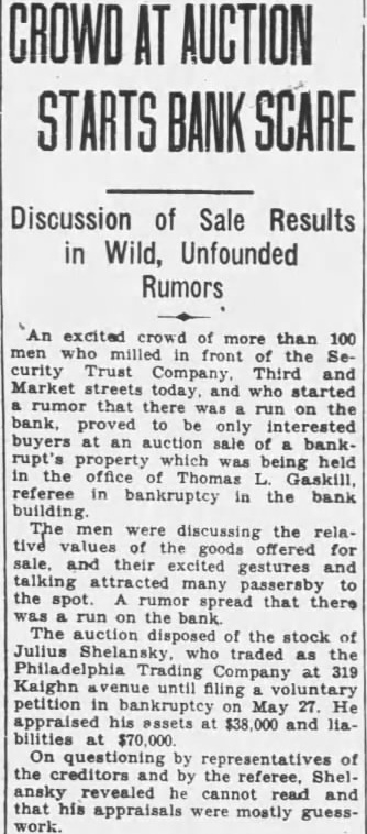 CROWD AT STARTS BANK Discussion of Sale Results in Wild, Unfounded Rumors excited of more than 100 the curity Trust Third and Market who rumor that the on bank, proved buyers an auction sale bank. rupt's property which was being held the referee the building. discussing the relative for sale, their excited gestures and talking attracted many the spot. spread that there the The of the stock of traded Philadelphia 319 Kaighn petition in bankruptcy May appraised and representatives of the creditors the referee, and that appraisals mostly work