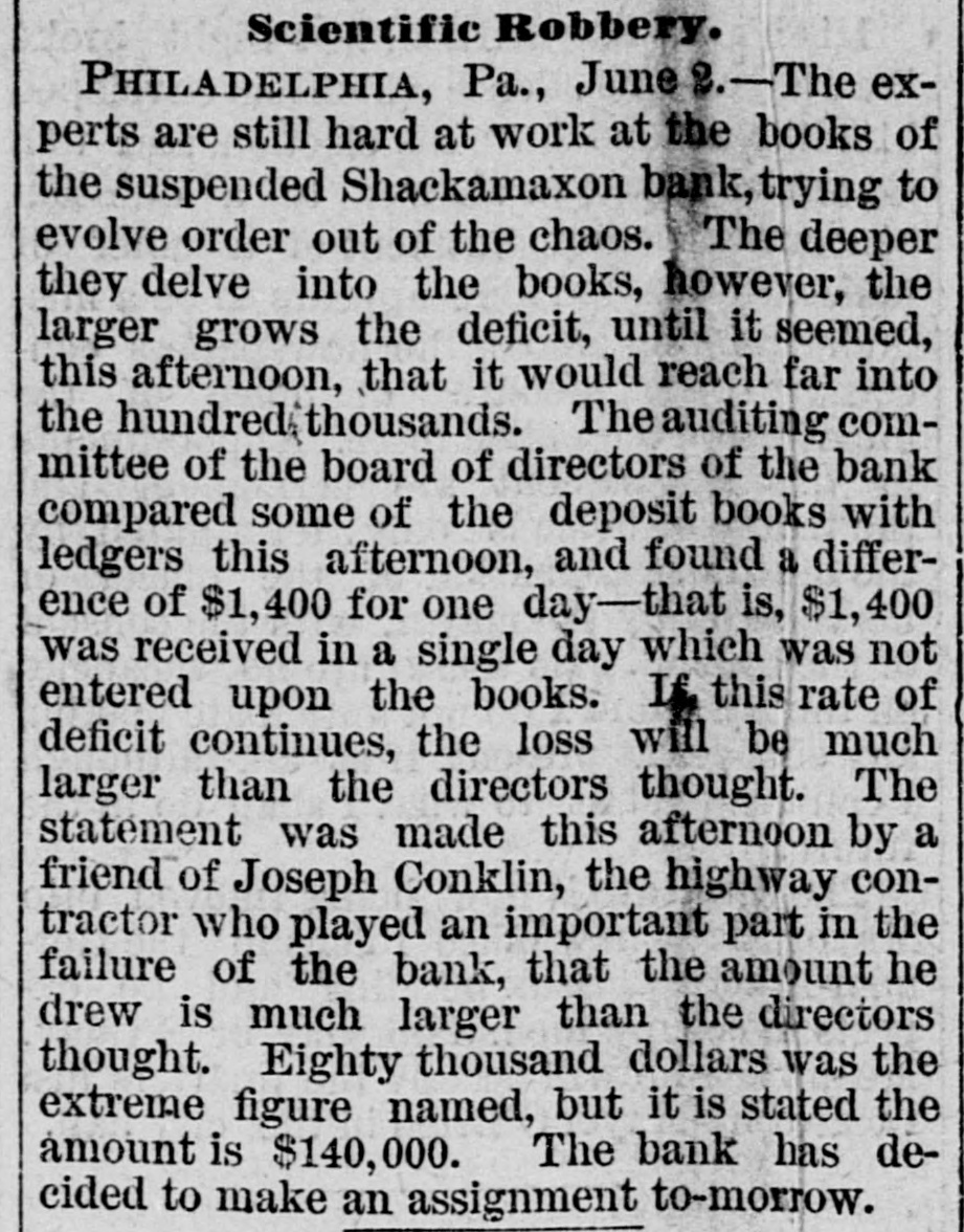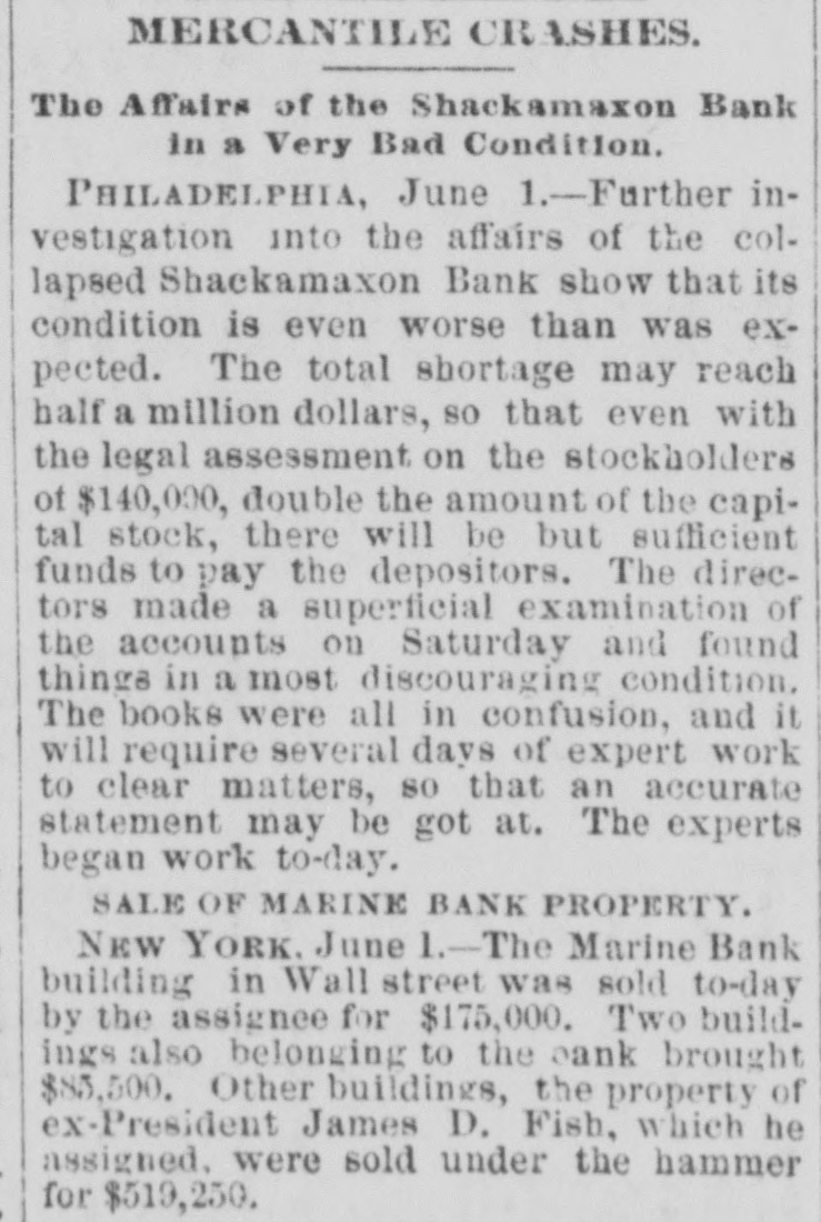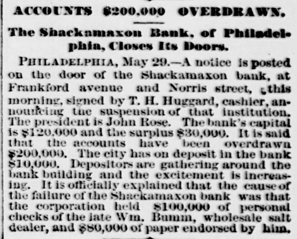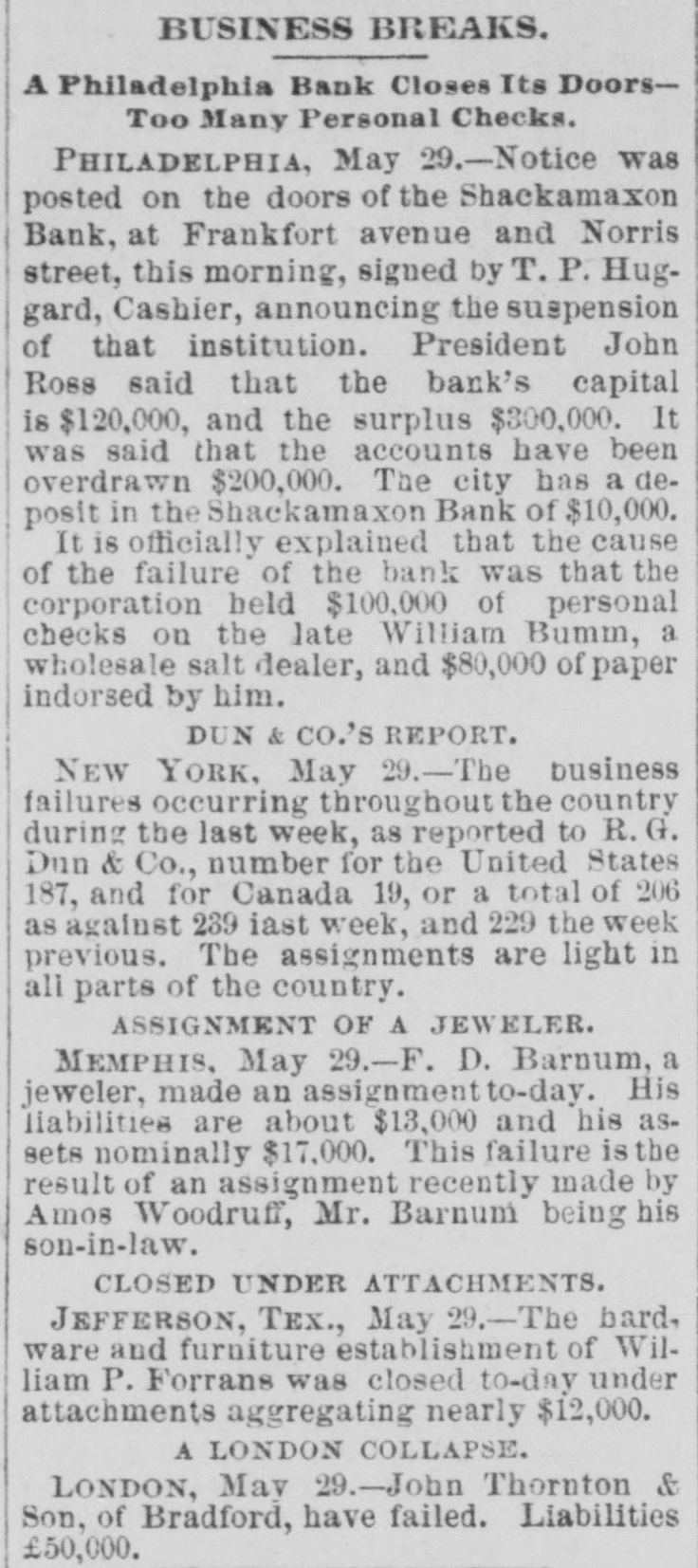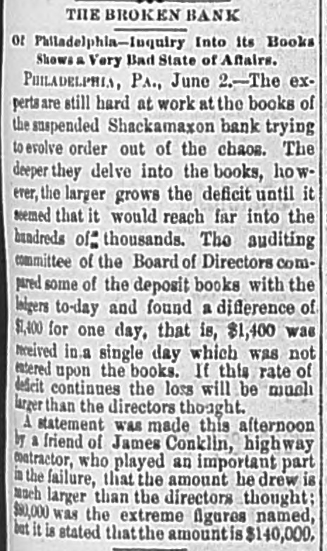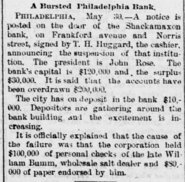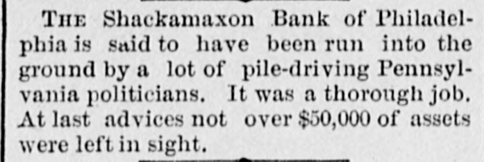 THE failure of the Shackamaxon Bank at Philadelphia, Pa., proves to have been a bad one. Liabilities about half a million.