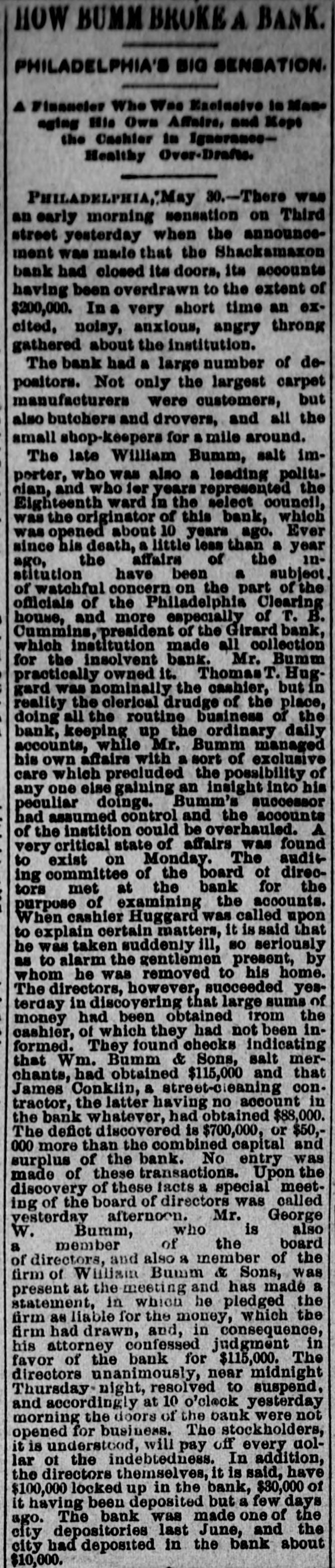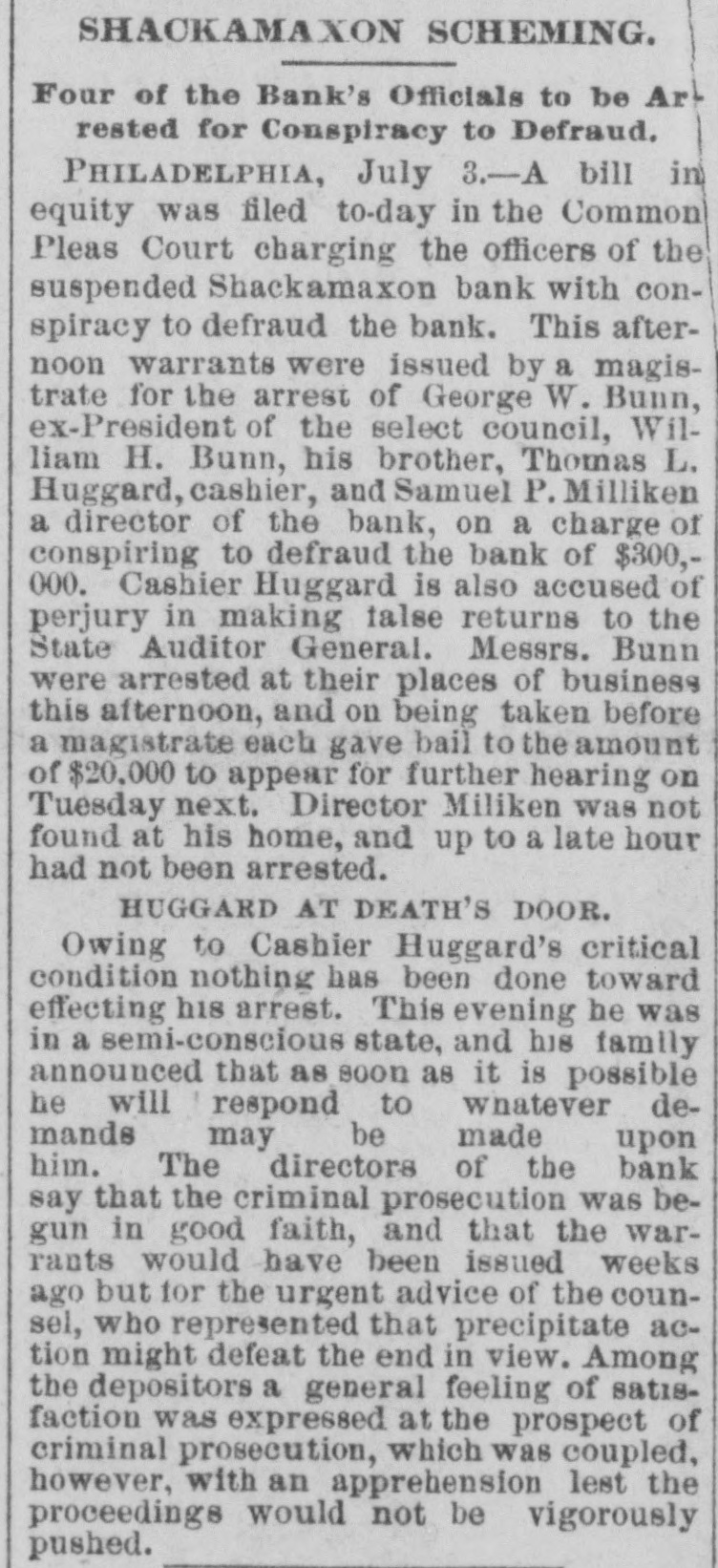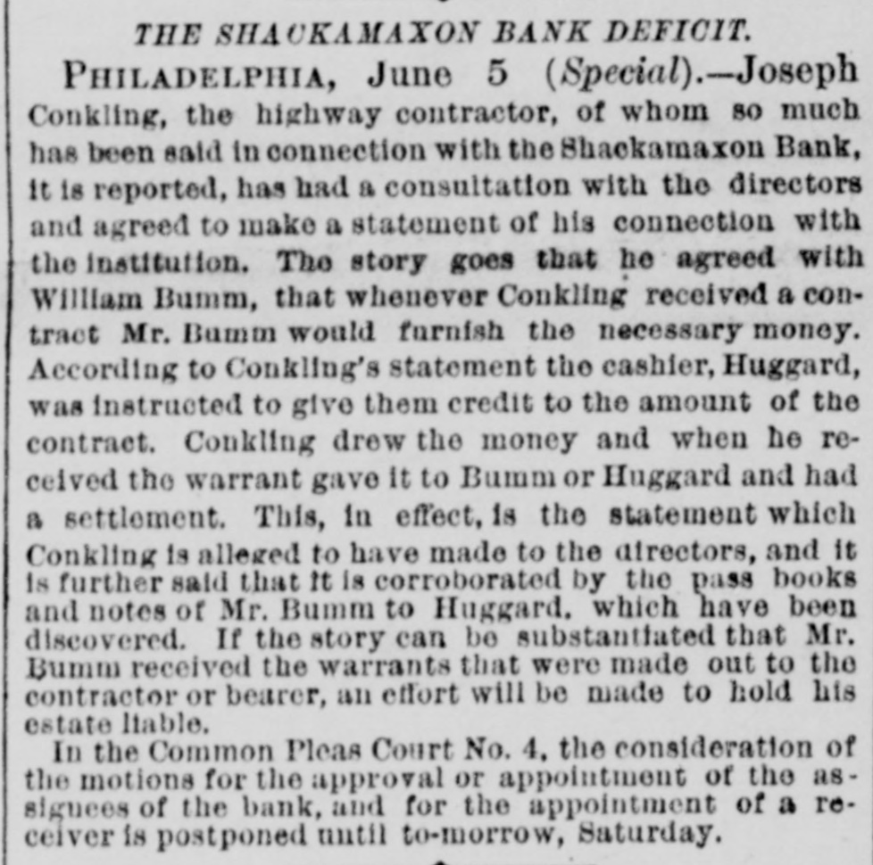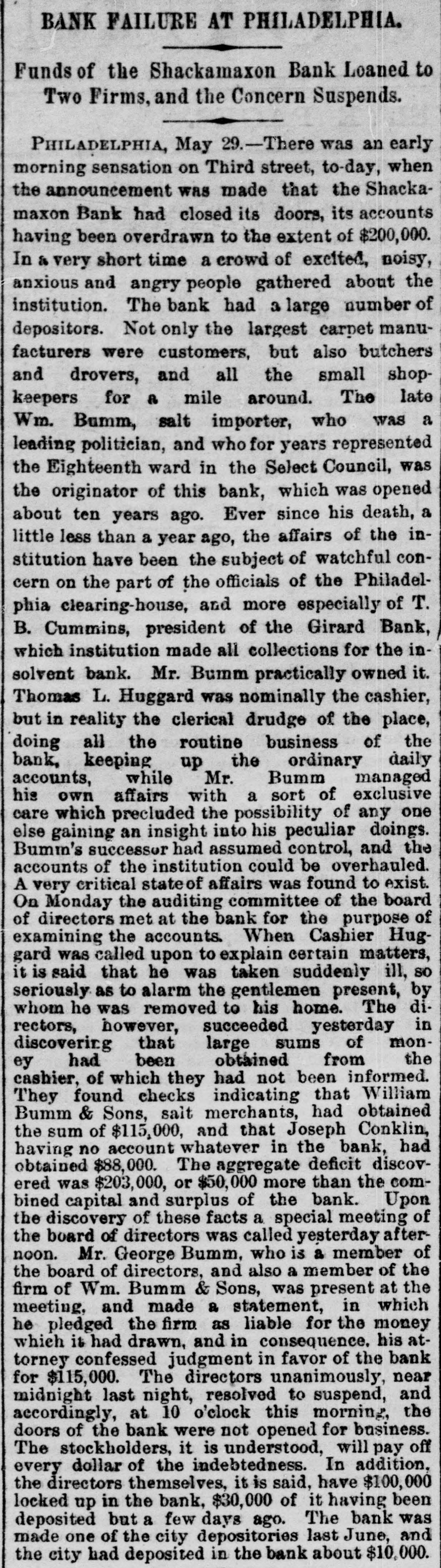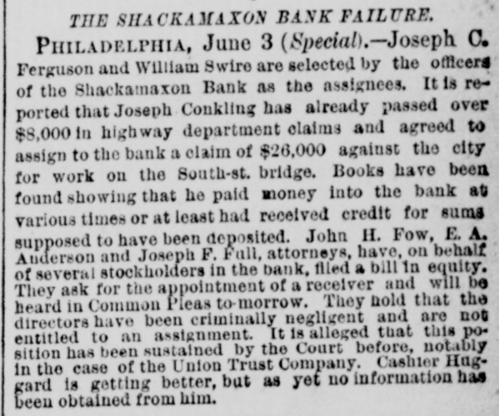 THE failure of the Shackamaxon Bank at Philadelphia, Pa., proves to have been a bad one. Liabilities about half a million.