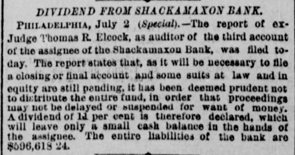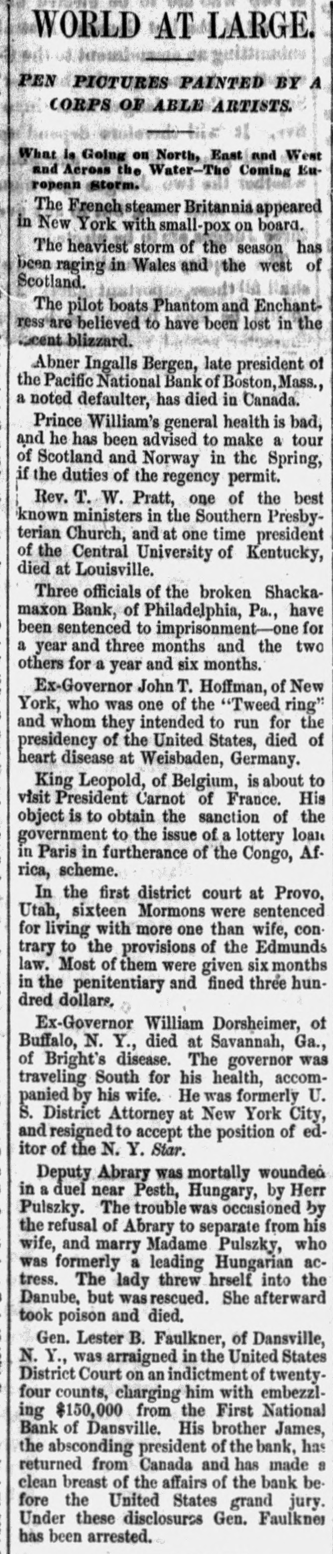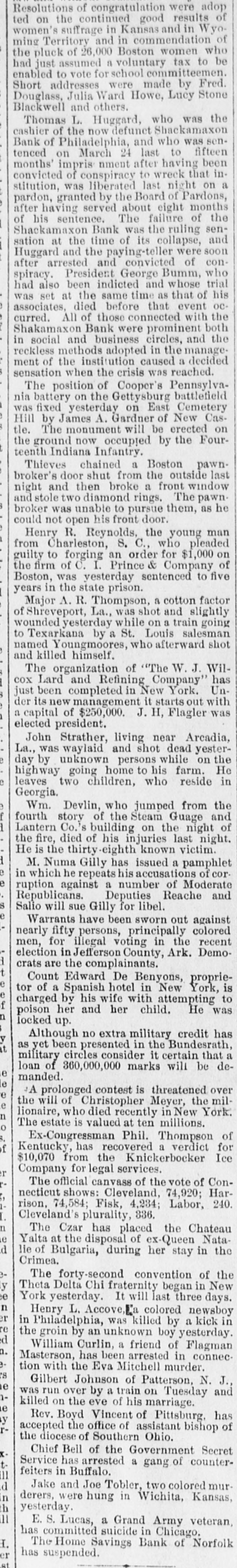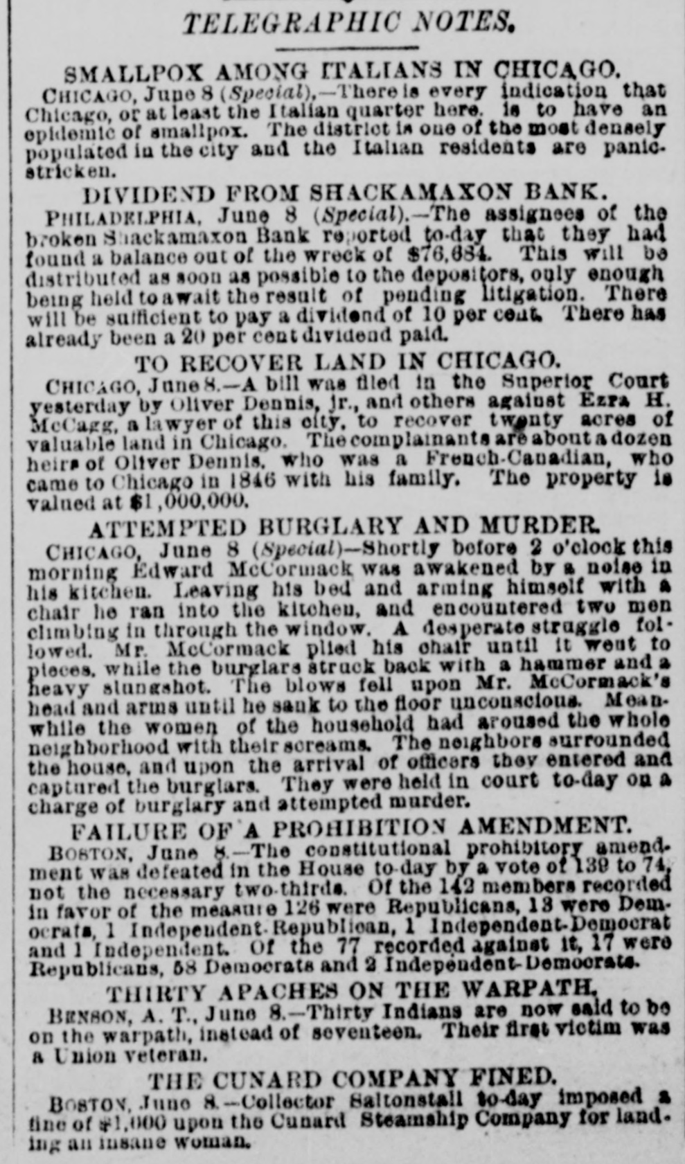 TELEGRAPHIC NOTES. SMALLPOX AMONG ITALIANS IN CHICAGO. CHICAGO, June 8 (Special),-There is every indication that Chicago, or at least the Italian quarter here. is to have an epidemic of smallpox. The district in one of the most densely populated in the city and the Italian residents are panicstricken. DIVIDEND FROM SHACKAMAXON BANK. PHILADELPHIA. June 8 (Special).-The assignees of the broken Shackamaxon Bank reported to-day that they had found a balance out of the wreck of $76,684. This will be distributed as soon as possible to the depositors, only enough being held to await the result of pending litigation. There will be sufficient to pay a dividend of 10 per cout There has already been a 20 per centdividend paid. TO RECOVER LAND IN CHICAGO. CHICAGO, June8 .-A bill was filed in the Superior Court yesterday by Oliver Dennis, Jr., and others against EZPA H. McCagg, a lawyer of this city, to recover twenty acres of valuable land in Chicago. The complainants are about a dozen heirs of Oliver Dennis. who was a French-Canadian, who came to Chicago in 1846 with his family. The property is valued at $1,000,000. ATTEMPTED BURGLARY AND MURDER. CHICAGO, June 8 (Special)-Shortly before 2 o'clock this morning Edward McCormack was awakened by a noise in his kitchen. Leaving his bed and arming himself with a chair he ran into the kitchen, and encountered two men climbing in through the window. A desperate struggle followed. Mr. McCormack plied his chair until it went to pieces. while the burglars struck back with a hammer and a heavy stungshot. The blows fell upon Mr. McCormack's head and arms until he sank to the floor unconscious. Meanwhile the women of the household had aroused the whole neighborhood with their screams. The neighbors surrounded the house, and upon the arrival of officers they entered and captured the burglars. They were held in court to-day on a charge of burglary and attempted murder. FAILURE OF A PROHIBITION AMENDMENT. BOSTON, June 3.-The constitutional prohibitory amendment was defeated in the House to-day by a vote of 139 to 74, not the necessary two-thirds. Of the 142 members recorded in favor of the measure 126 were Republicans, 13 were Dem. ocrats, 1 Independent. Republican, 1 Independent-Democrat and 1 Independent. Of the 77 recorded against it, 17 were Republicans, 58 Democrats and 2 Indepéndent-Demoerats THIRTY APACHES ON THE WARPATH, BENSON, A. T., June 8.-Thirty Indians are now said to be on the warpath, instead of seventeen. Their first victim was a Union veteran. THE CUNARD COMPANY FINED. BOSTON, June 8. -Collector Saltonstall to-day imposed 2 fine of $1,000 upon the Cunard Steamship Company for land. ing an insane Woman.