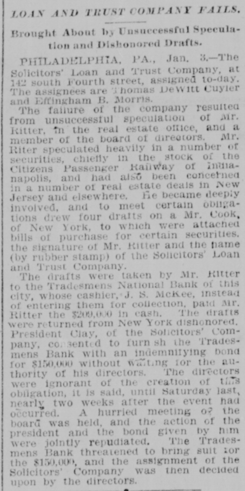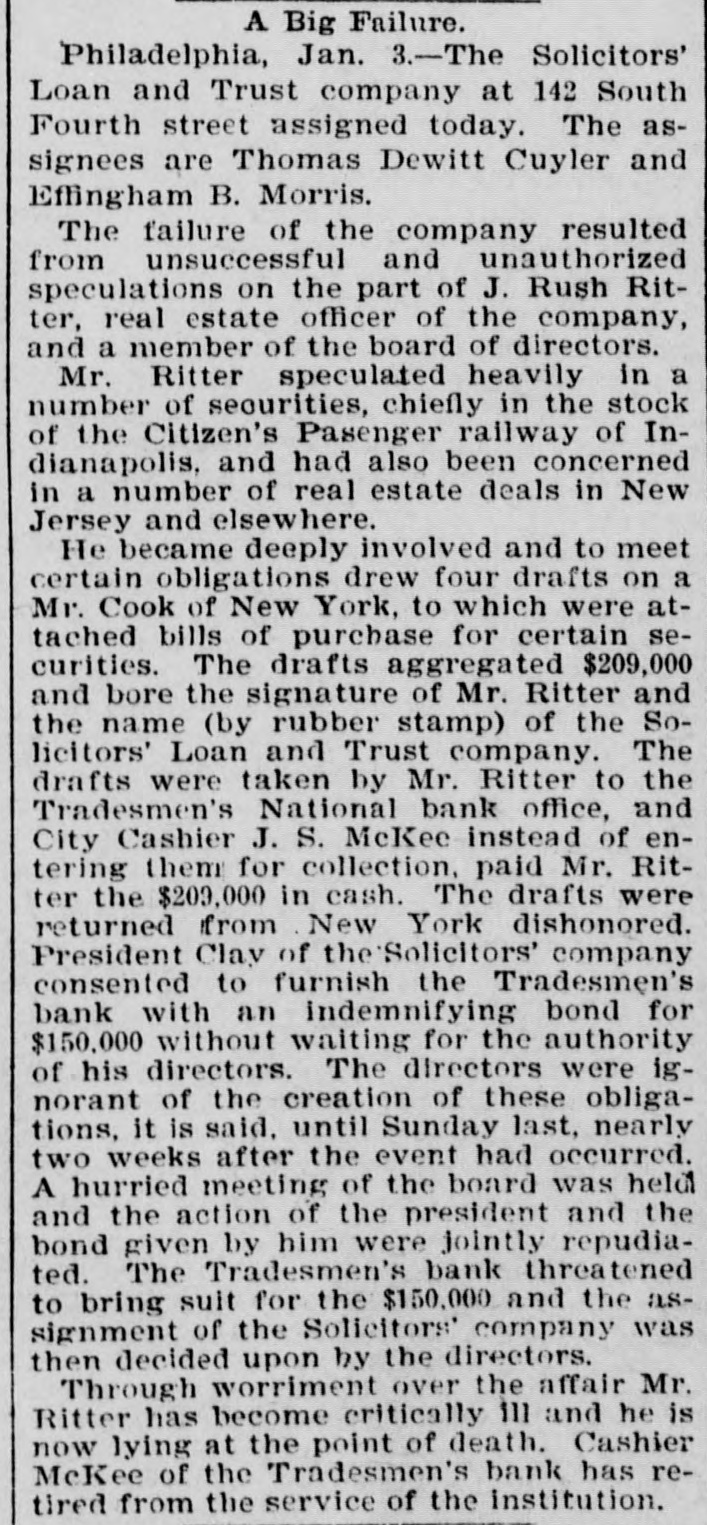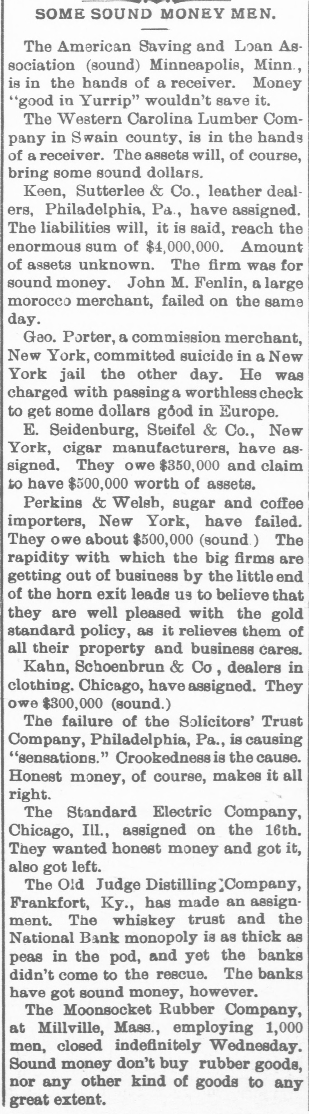 SOME SOUND MONEY MEN. The American Saving and Loan Association (sound) Minneapolis, Minn, is in the hands of a receiver. Money "good in Yurrip" wouldn't save it. The Western Carolina Lumber Company in Swain county, is in the hands of a receiver. The assets will, of course, bring some sound dollars. Keen, Sutterlee & Co., leather dealers, Philadelphia, Pa., have assigned. The liabilities will, it is said, reach the enormous sum of $4,000,000. Amount of assets unknown. The firm was for sound money. John M. Fenlin, a large morocco merchant, failed on the same day. Geo. Porter, a commission merchant, New York, committed suicide in a New York jail the other day. He was charged with passing a worthless check to get some dollars good in Europe. E. Seidenburg, Steifel & Co., New York, cigar manufacturers, have assigned. They owe $350,000 and claim to have $500,000 worth of assets. Perkins & Welsh, sugar and coffee importers, New York, have failed. They owe about $500,000 (sound.) The rapidity with which the big firms are getting out of business by the little end of the horn exit leads us to believe that they are well pleased with the gold standard policy, as it relieves them of all their property and business cares. Kahn, Schoenbrun & Co, dealers in clothing. Chicago, have assigned. They owe $300,000 (sound.) The failure of the Solicitors' Trust Company, Philadelphia, Pa., is causing "sensations." Crookedness is the cause. Honest money, of course, makes it all right. The Standard Electric Company, Chicago, Ill., assigned on the 16th. They wanted honest money and got it, also got left. The Old Judge Distilling Company, Frankfort, Ky., has made an assignment. The whiskey trust and the National Bank monopoly is as thick as peas in the pod, and yet the banks didn't come to the rescue. The banks have got sound money, however. The Moonsocket Rubber Company, at Millville, Mass., employing 1,000 men, closed indefinitely Wednesday. Sound money don't buy rubber goods, nor any other kind of goods to any great extent.